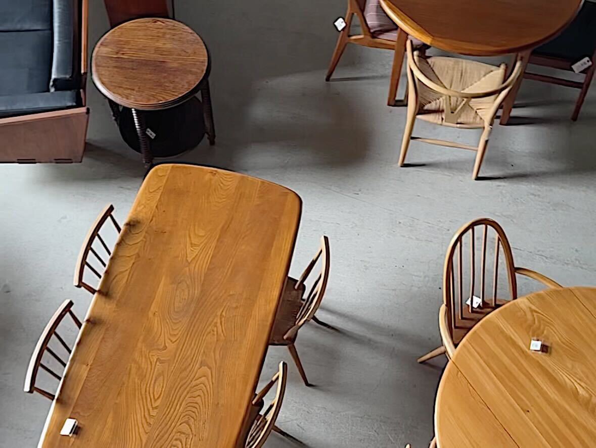 アーコール社は、現存するイギリスの老舗家具メーカーで、新品・アンティーク問わず同一モデルが高い人気を誇る稀有なブランドです。1920年、イタリア生まれの家具デザイナー、ルシアン・アーコラーニがハイ・ワイコムで創業しました。 当時は家具材として不向きとされていたエルム材を、独自の乾燥技術で加工可能にしたことが成功の大きな要因。ウィンザーチェアに代表される伝統技術とモダンデザインを融合させた軽やかでシンプルなコレクションを展開しています。 1957年デザインの「スタッキングチャイルドチェア」は学校などで広く使われ、ブランドの象徴的存在に。2000年代には英国デザイナーのマーガレット・ハウエルがヴィンテージ品を紹介したことをきっかけに復刻版が発売され、再び大きな人気を博しました。 1960〜70年代の「ゴールドラベル」期の製品はもちろん、近年ではその後の「ブルーラベル」品も現地で取引価格が高騰し、コレクターズアイテムとしての価値を高めています。