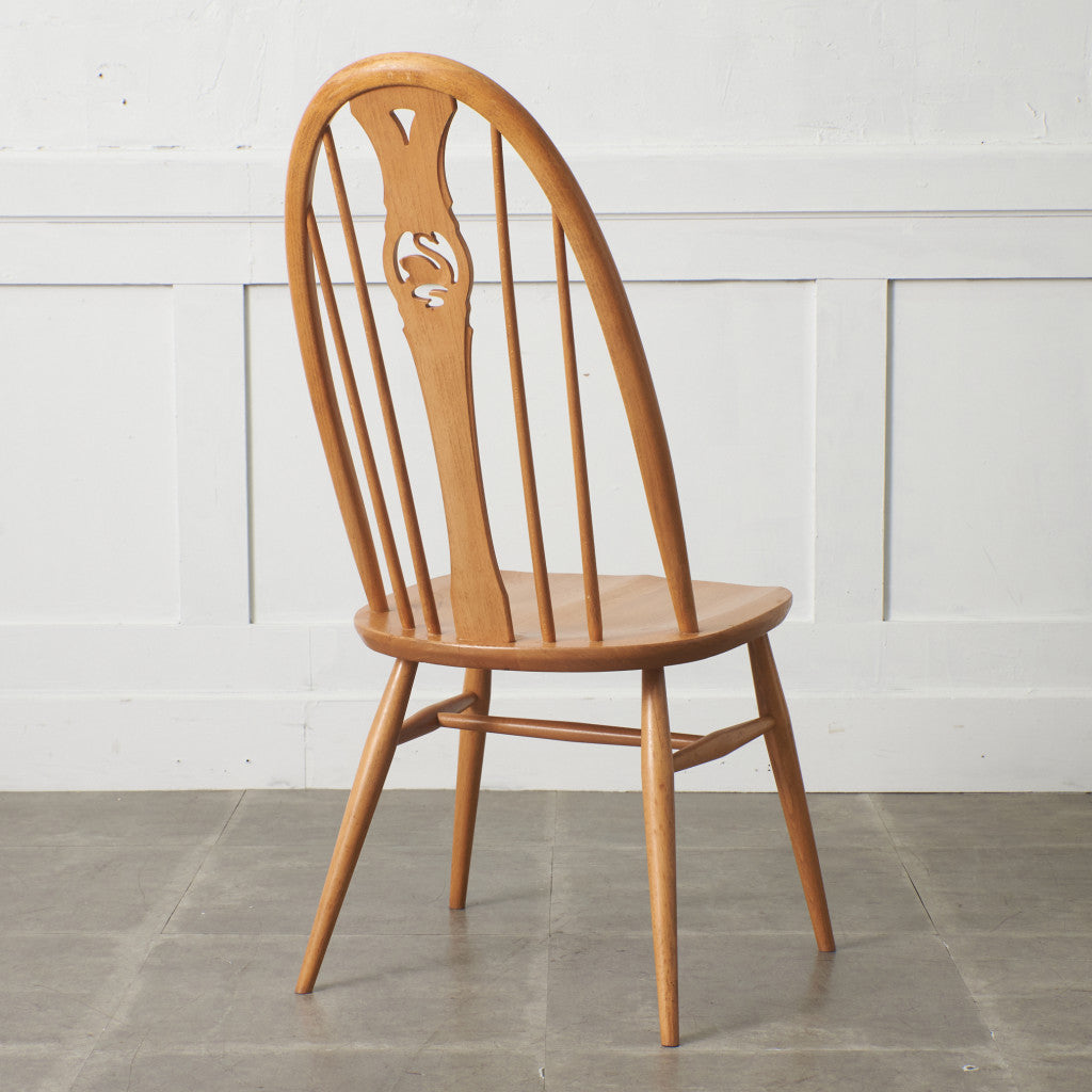 アーコールのクエーカーチェアをベースに、ウィンザーチェアの“ホイールバック(車輪)”を、白鳥の透かし彫りにしたスワンバックチェア。シンプルなアーコールチェアの中でも優雅さをプラスしたアイテムとして人気のあるお品です。