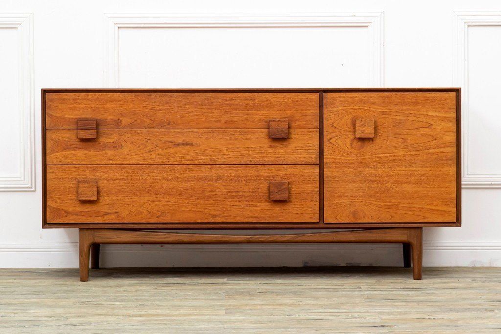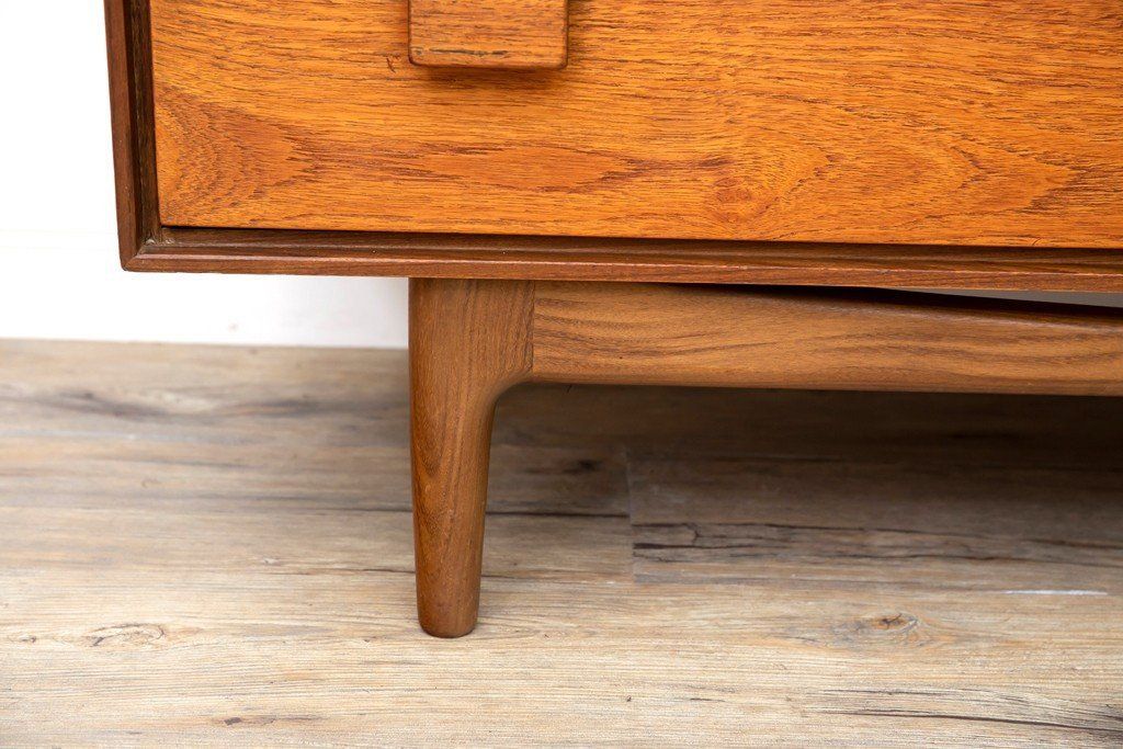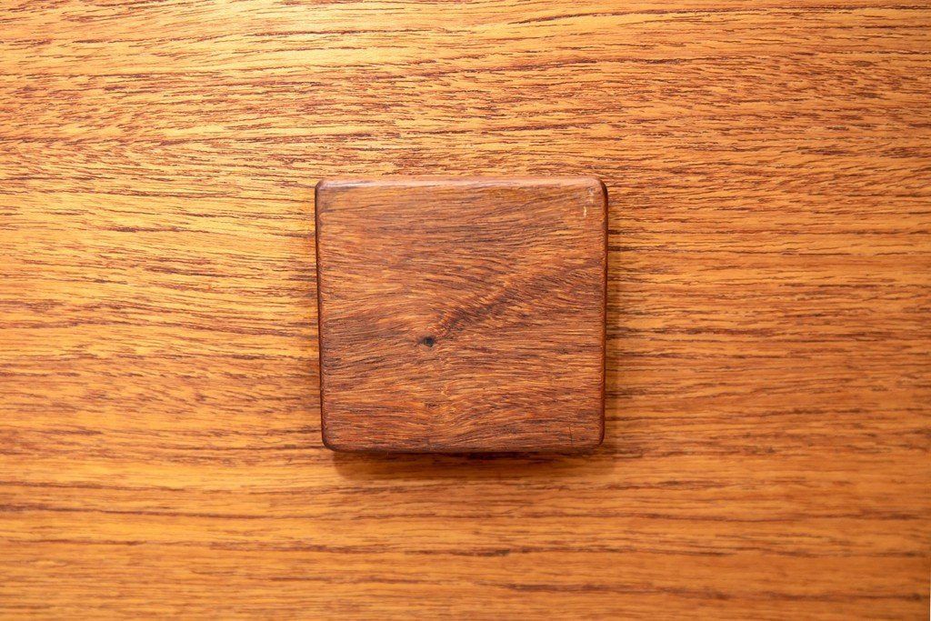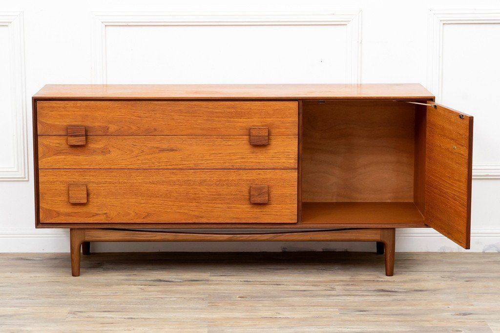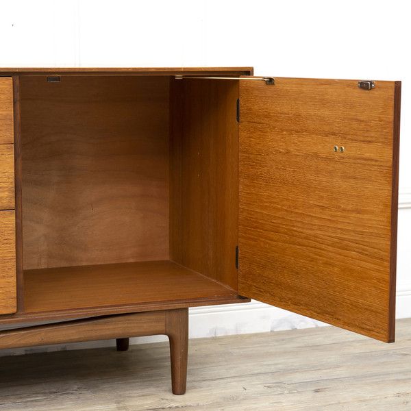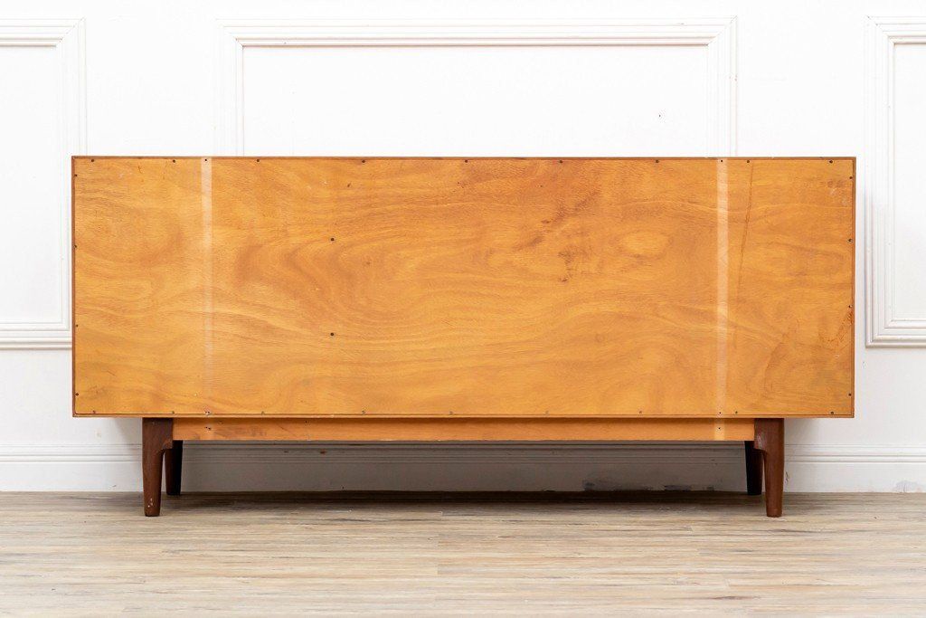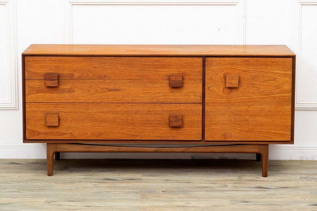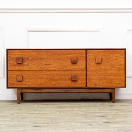 巨匠 Ib Kofod-Larsen(イブ・コフォード・ラーセン)がデザインした、極希少なダニッシュシリーズのサイドボード。良質なチークとアフロモシアが使用され、繊細なディテールの四角い取っ手はローズウッド製です。直線的でシンプルなデザインは外部だけでなく内部も非常に丁寧に作り込まれています。ダニッシュシリーズのサイドボードの中でも、特に流通量が少なく希少価値の高いレアモデルです。