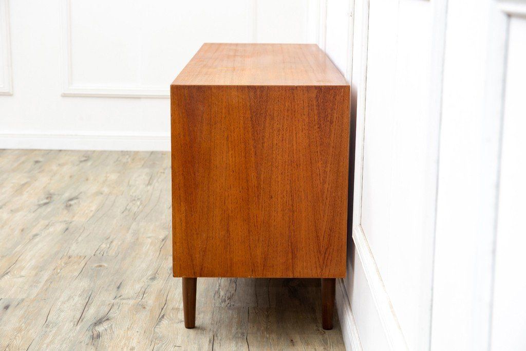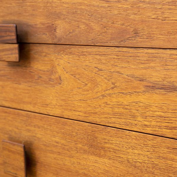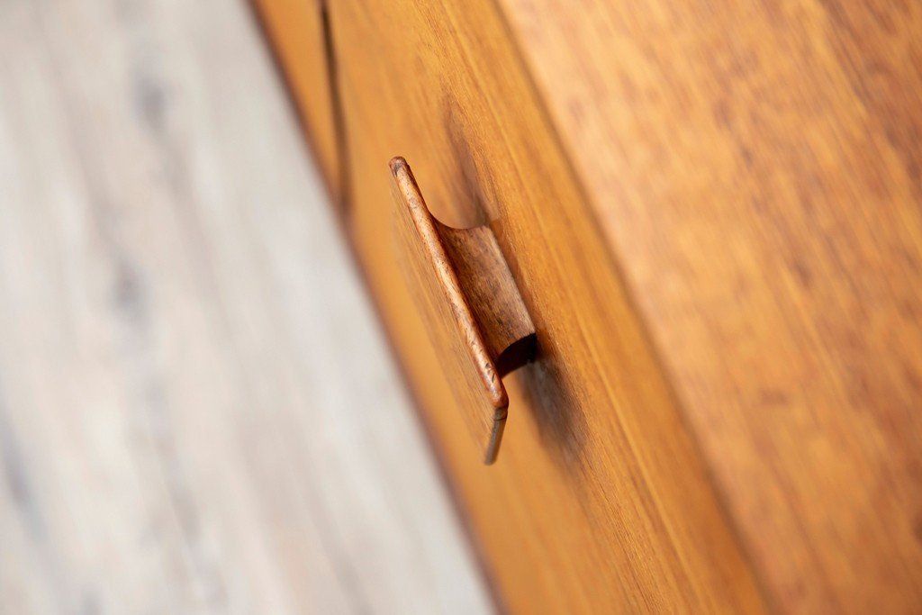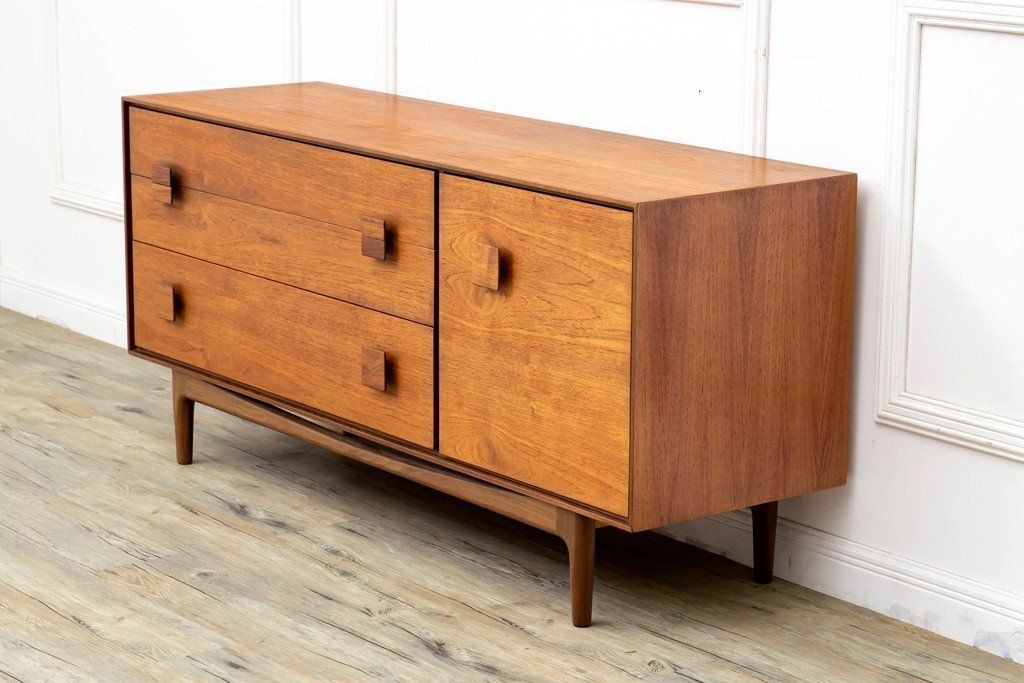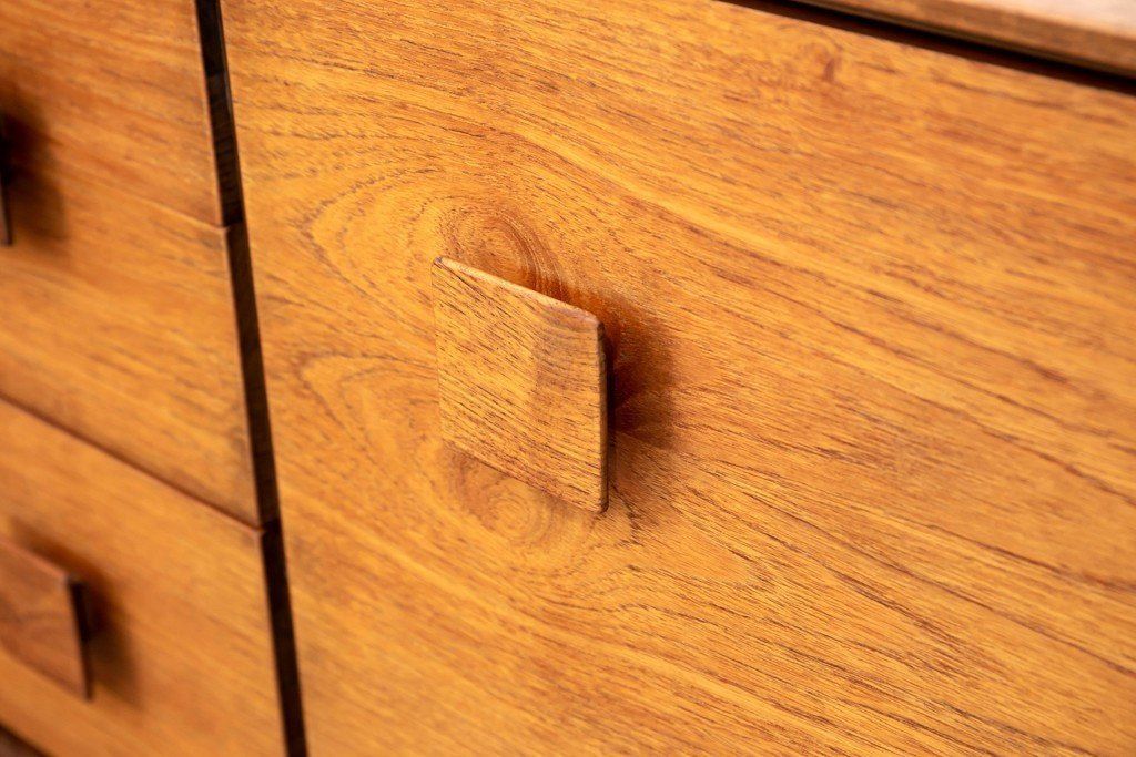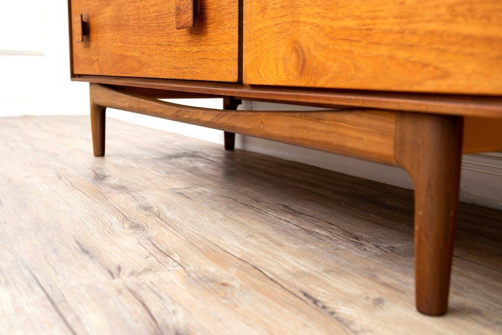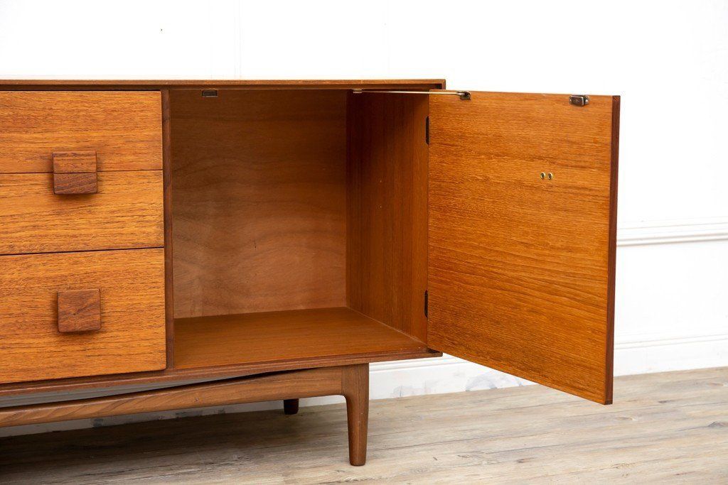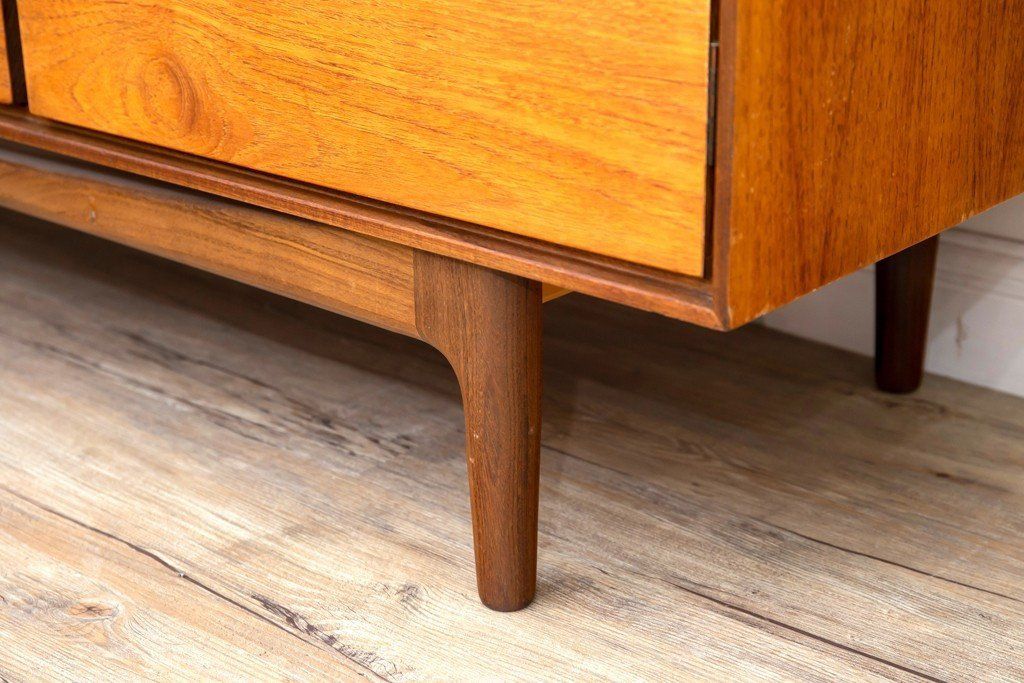 巨匠 Ib Kofod-Larsen(イブ・コフォード・ラーセン)がデザインした、極希少なダニッシュシリーズのサイドボード。良質なチークとアフロモシアが使用され、繊細なディテールの四角い取っ手はローズウッド製です。直線的でシンプルなデザインは外部だけでなく内部も非常に丁寧に作り込まれています。ダニッシュシリーズのサイドボードの中でも、特に流通量が少なく希少価値の高いレアモデルです。