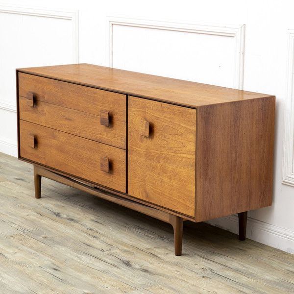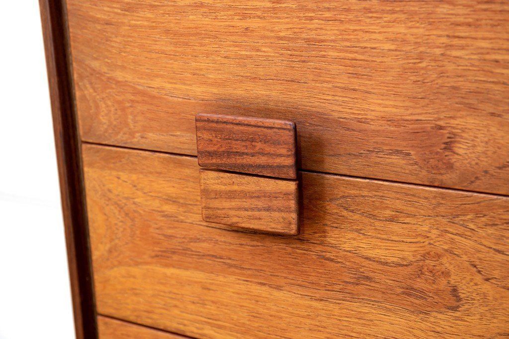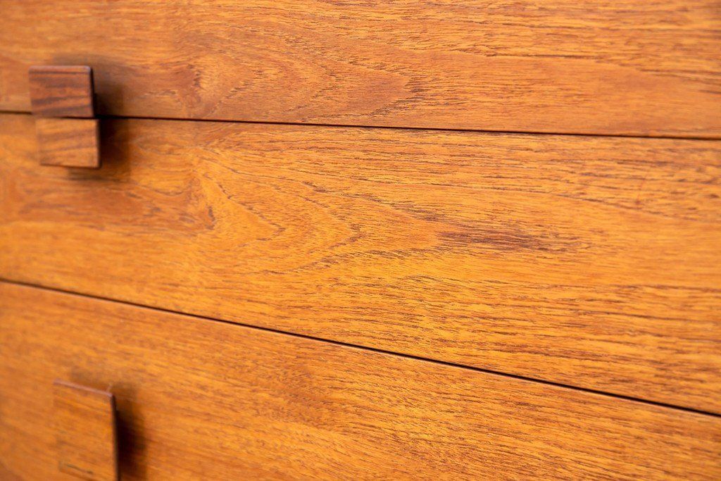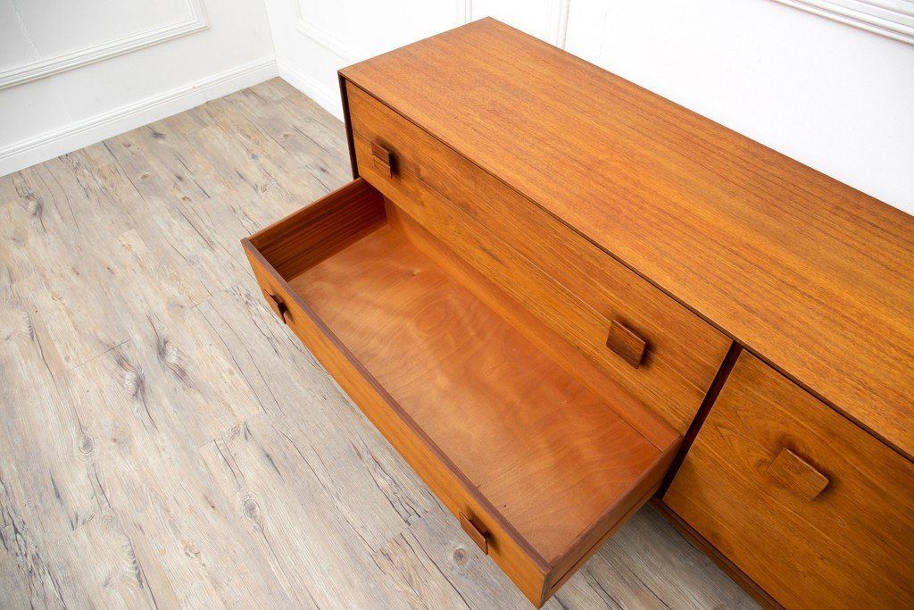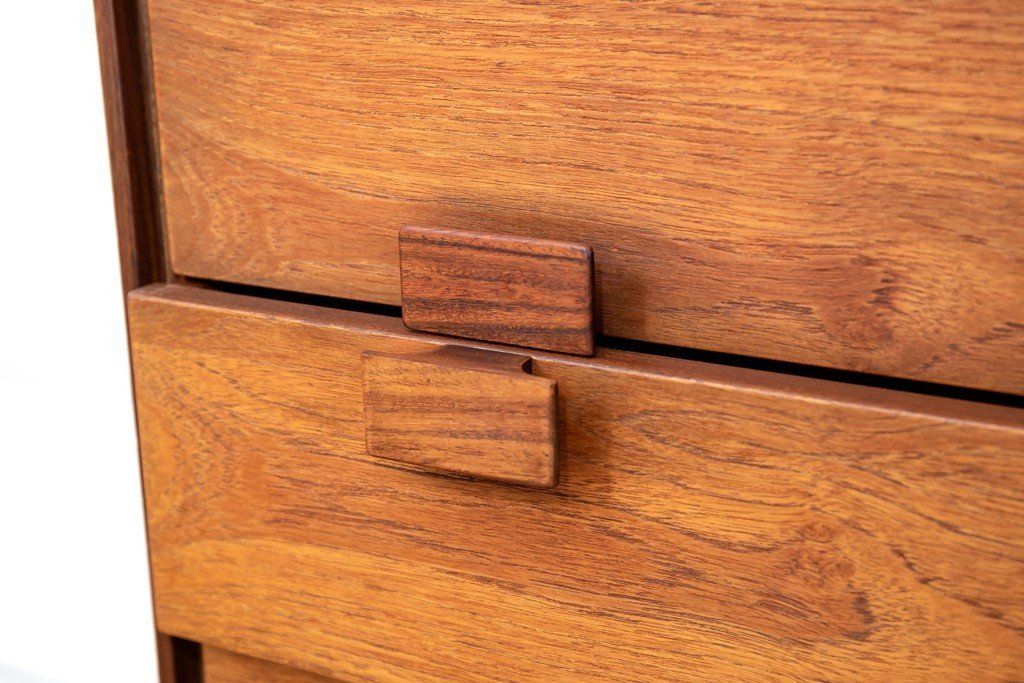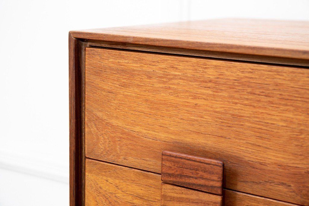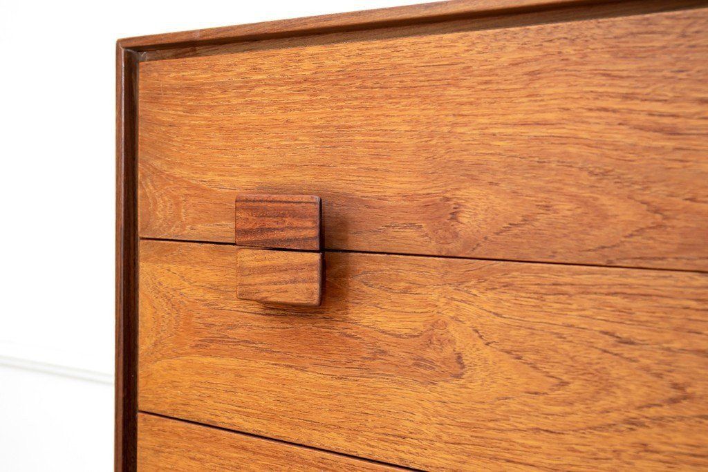 巨匠 Ib Kofod-Larsen(イブ・コフォード・ラーセン)がデザインした、極希少なダニッシュシリーズのサイドボード。良質なチークとアフロモシアが使用され、繊細なディテールの四角い取っ手はローズウッド製です。直線的でシンプルなデザインは外部だけでなく内部も非常に丁寧に作り込まれています。ダニッシュシリーズのサイドボードの中でも、特に流通量が少なく希少価値の高いレアモデルです。