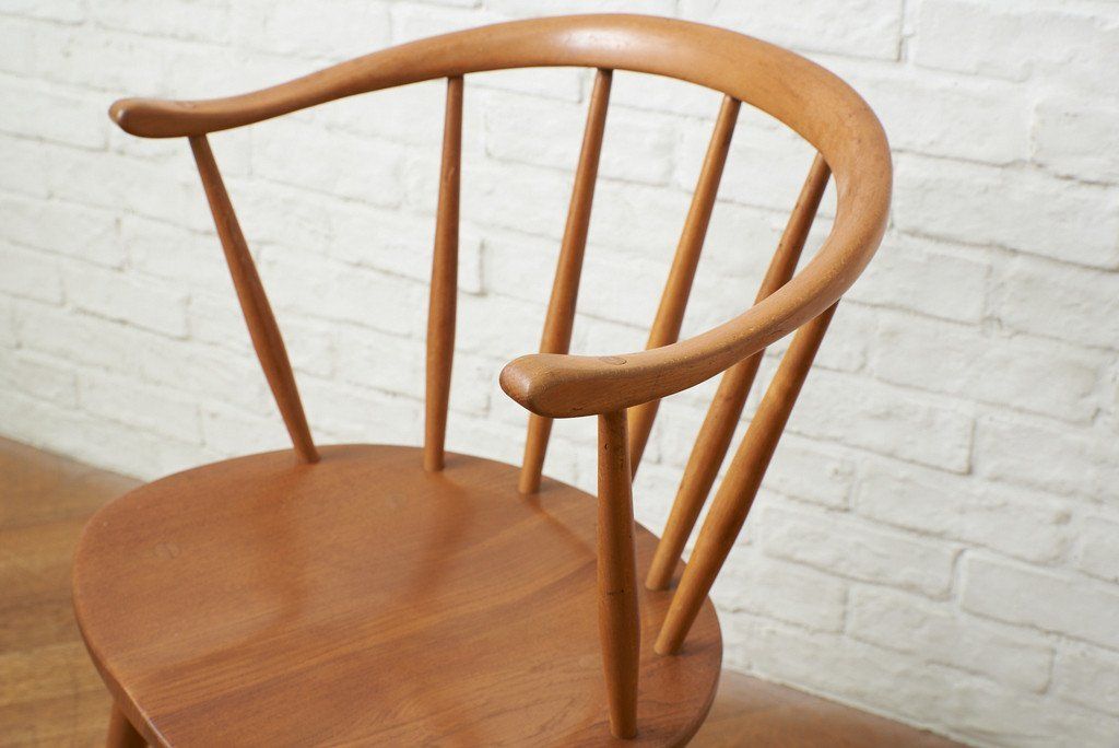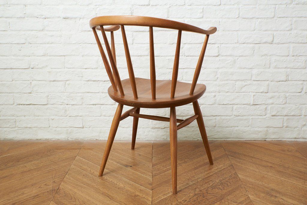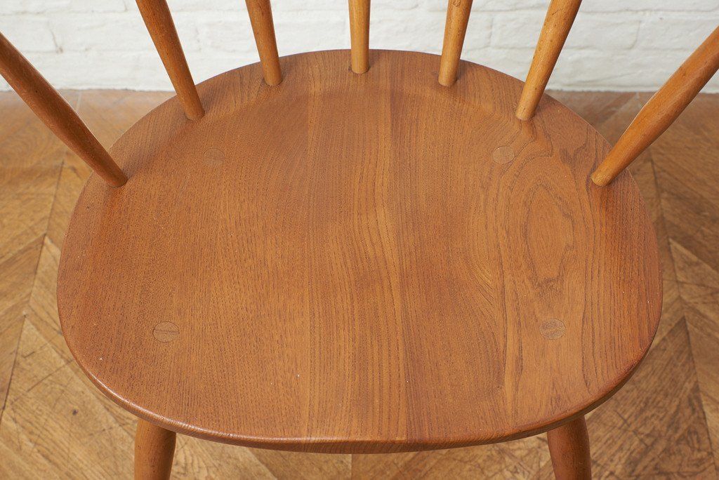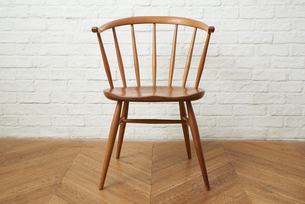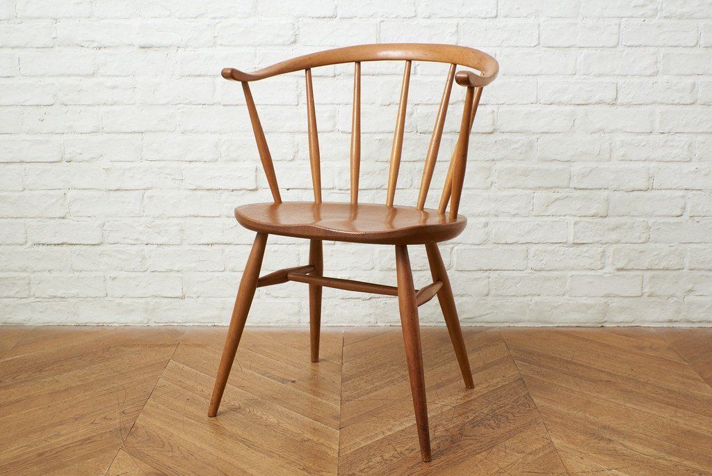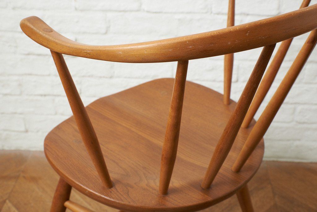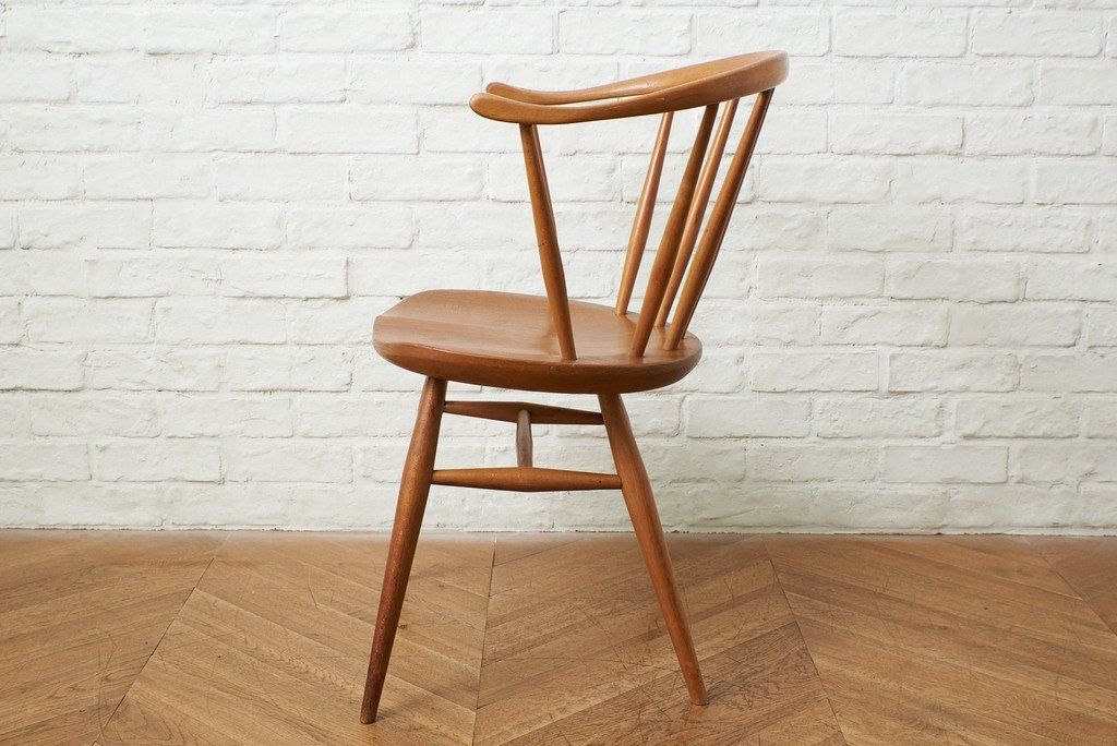 アーコール社のヴィンテージチェアの中でもレア度&人気共に一番人気のあるスモーカーズチェア。1950年代に製造された特に希少価値の高いモデルです。(1950年代製は、座面が厚くお尻の形に深く彫られている。背もたれの棒が7本で、全てシェイプが付いている。1960年以降製は、座面が薄く彫りも浅い。背もたれが9本に増え、シェイプがあるのは両サイドの2本のみ。)パブでゆったりと腰掛けながら葉巻を吸うための椅子スモーカーズボウウィンザーチェアをモチーフにデザインされており、幅広の座面によるゆったりとしたかけ心地が魅力です。また、背もたれが牛の角のように美しく曲げられ滑らかに削りされていることから「カウホーン」とも呼ばれています。イギリス本国でも人気が高いため日本国内への流通は非常にレアな椅子です。