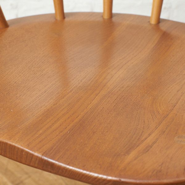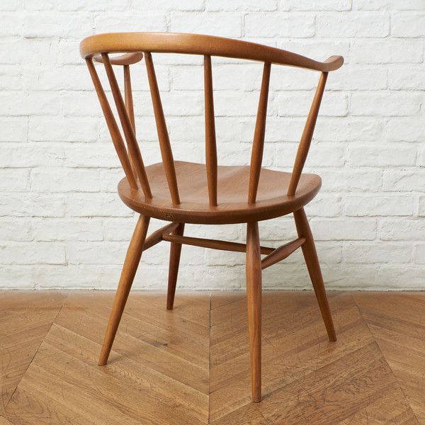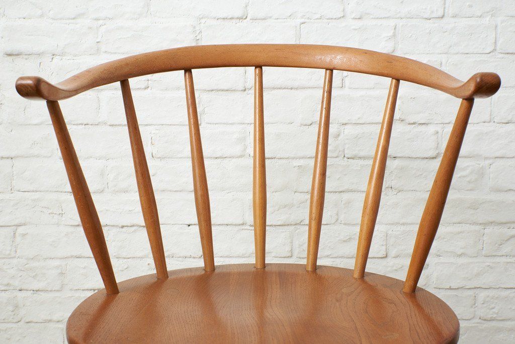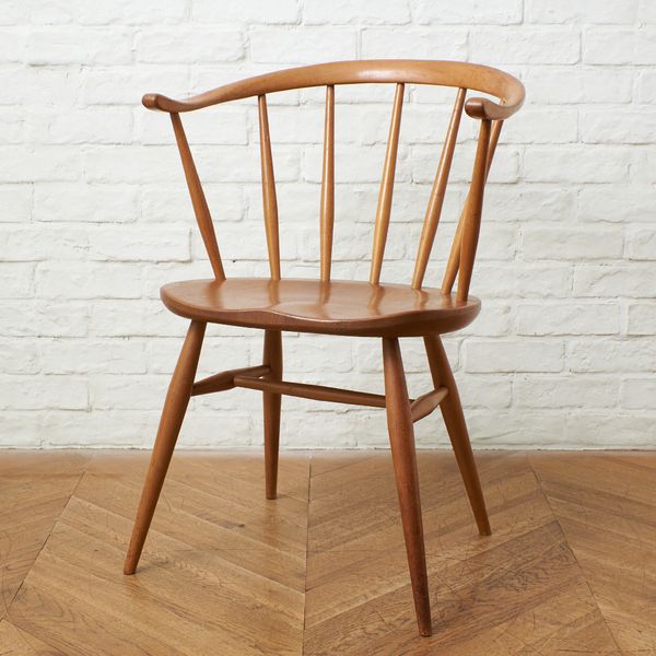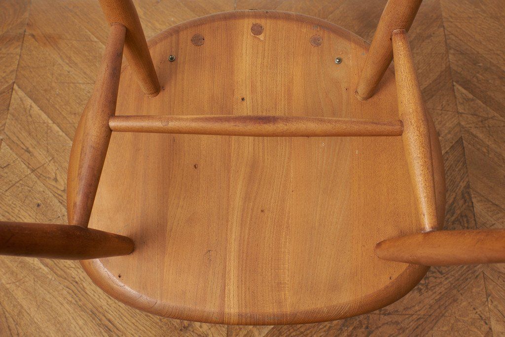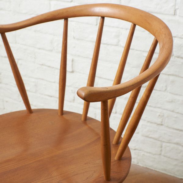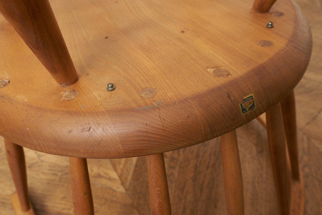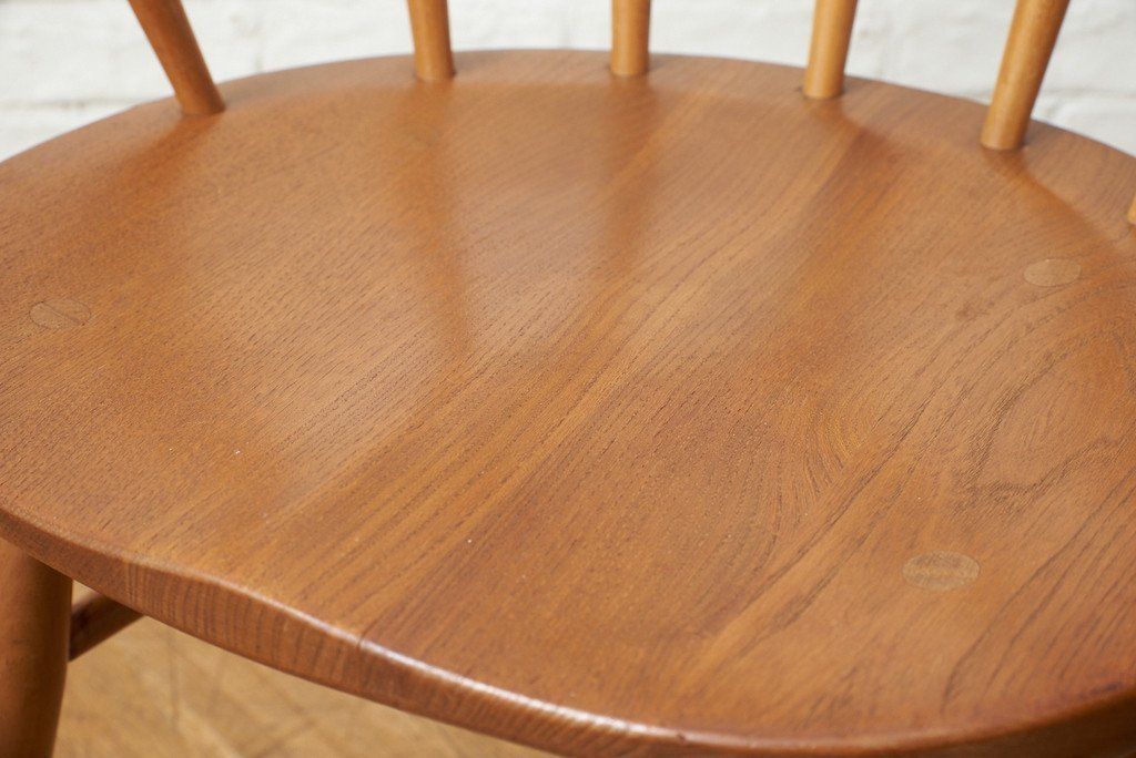 アーコール社のヴィンテージチェアの中でもレア度&人気共に一番人気のあるスモーカーズチェア。1950年代に製造された特に希少価値の高いモデルです。(1950年代製は、座面が厚くお尻の形に深く彫られている。背もたれの棒が7本で、全てシェイプが付いている。1960年以降製は、座面が薄く彫りも浅い。背もたれが9本に増え、シェイプがあるのは両サイドの2本のみ。)パブでゆったりと腰掛けながら葉巻を吸うための椅子スモーカーズボウウィンザーチェアをモチーフにデザインされており、幅広の座面によるゆったりとしたかけ心地が魅力です。また、背もたれが牛の角のように美しく曲げられ滑らかに削りされていることから「カウホーン」とも呼ばれています。イギリス本国でも人気が高いため日本国内への流通は非常にレアな椅子です。