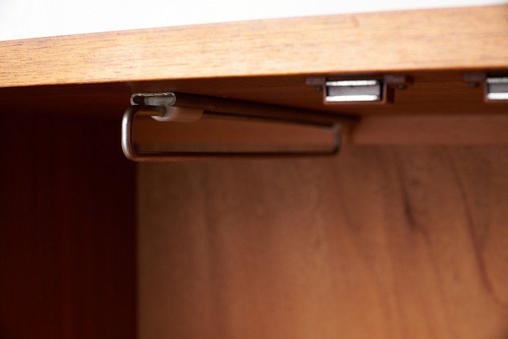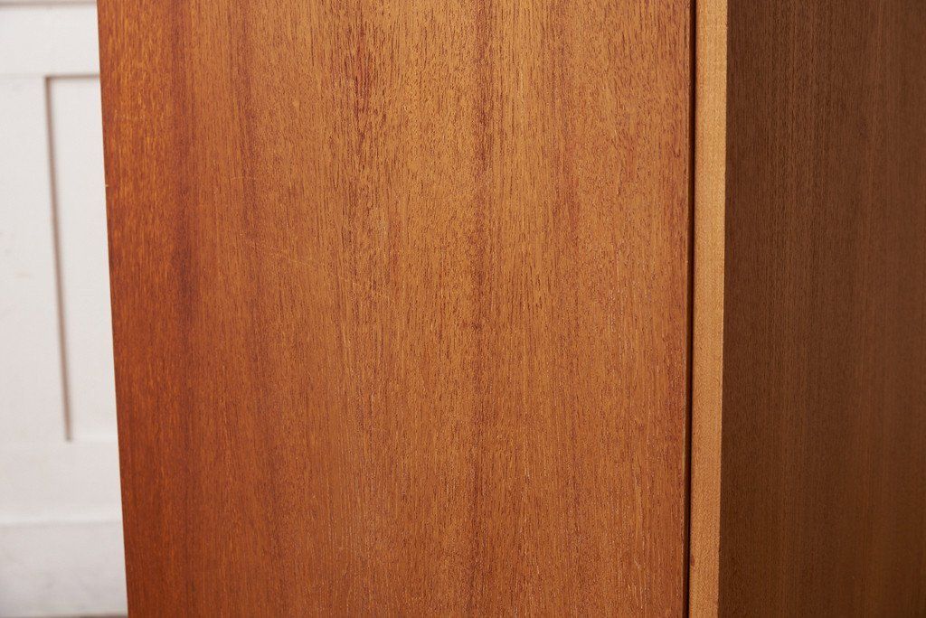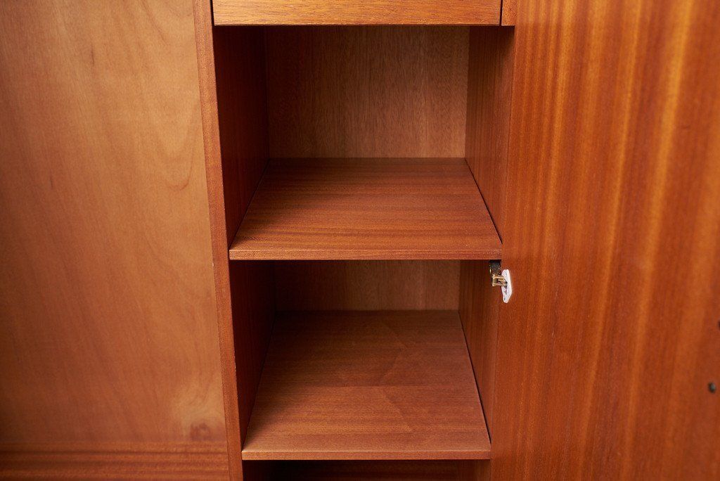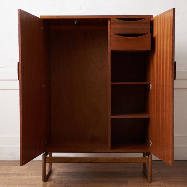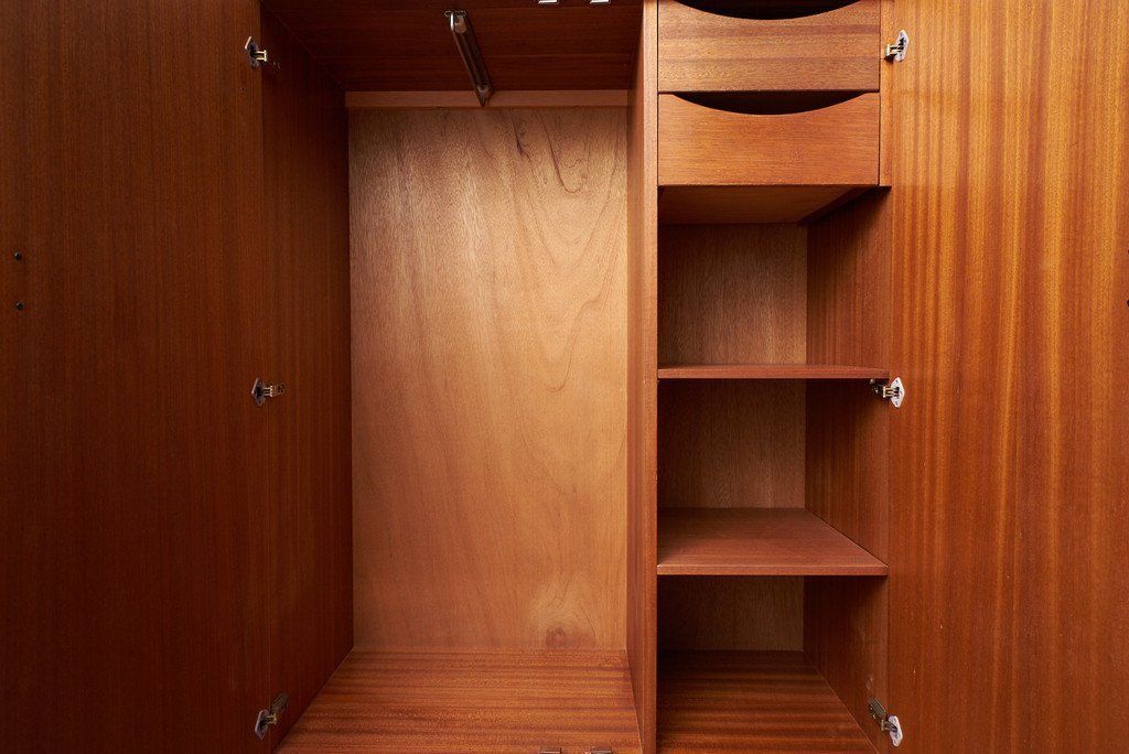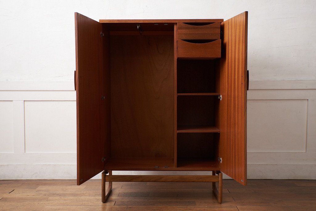 すっきりとしたデザインの中にQuadrilleシリーズの特徴的な脚の型状がアクセントに。余計な装飾が無いので木目の美しさが際立つ印象的なお品です。左側はコートなどの衣類を掛けるスペース、右側は棚と引き出しのスペースとなっており、小物の整理も可能な機能性に優れたワードローブです。ユーズド市場でも流通量の少ないレアモデルです。