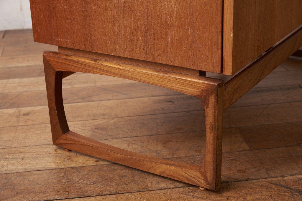 フランスのスクエア(四角)になって踊る古典舞踊、Quadrilleの名前を冠する1965年発表のG-PLAN Quadrilleシリーズ。Frescoシリーズと同じく60年代のデンマークデザインを源泉にもち、美しい褐色のチーク材を使用。四方を面取りされた樽型取手、内側に緩やかな弧を描き外形を四角に組まれた美しい形状の脚が特徴です。