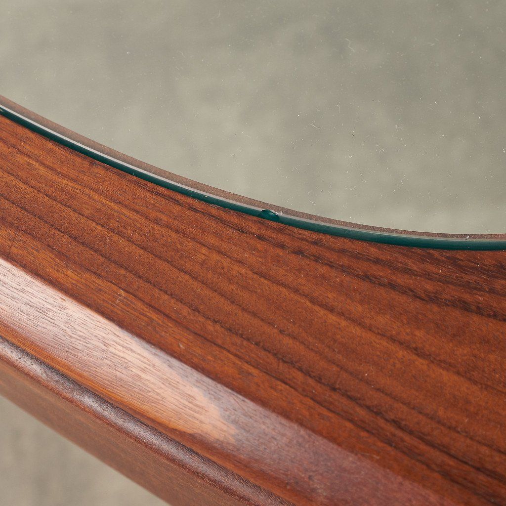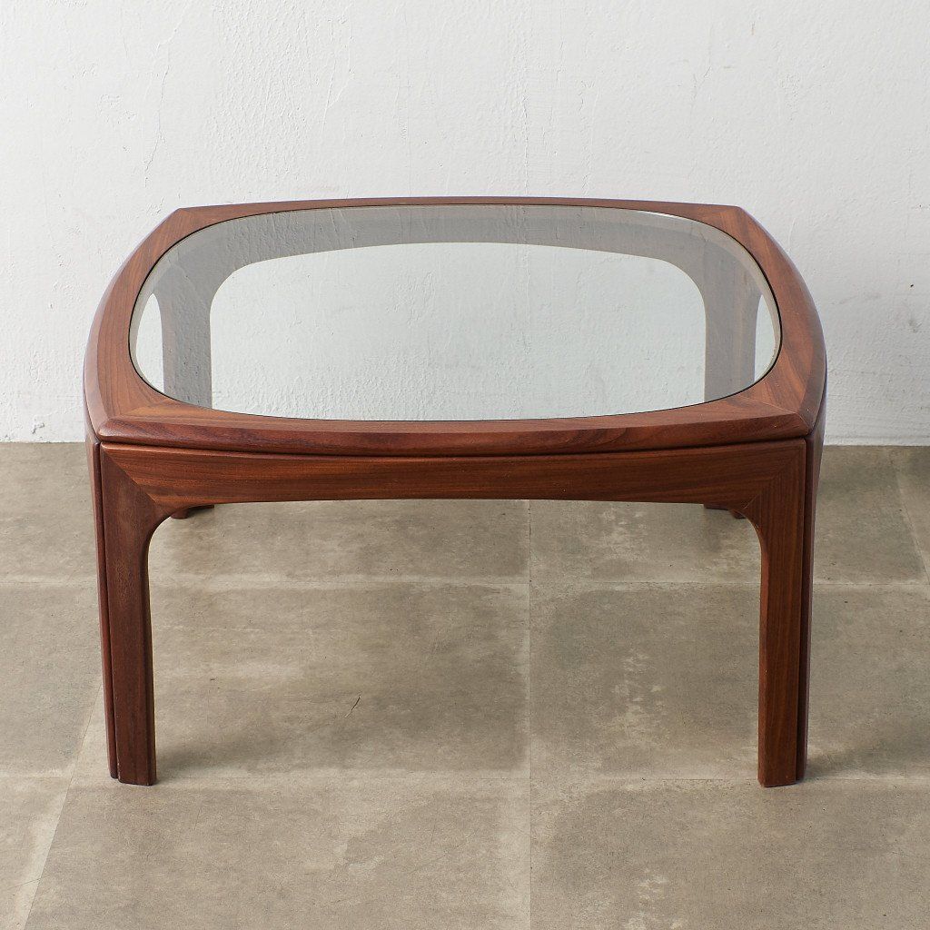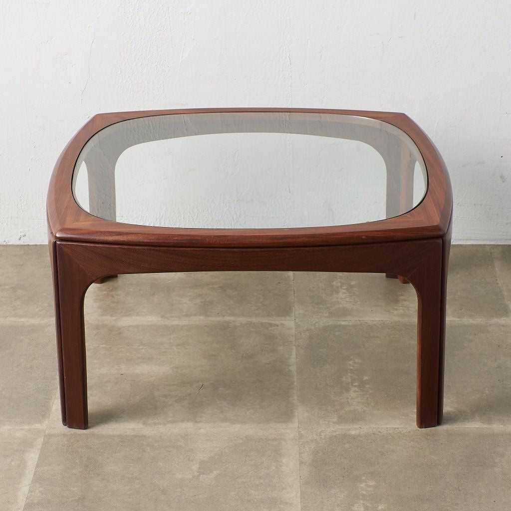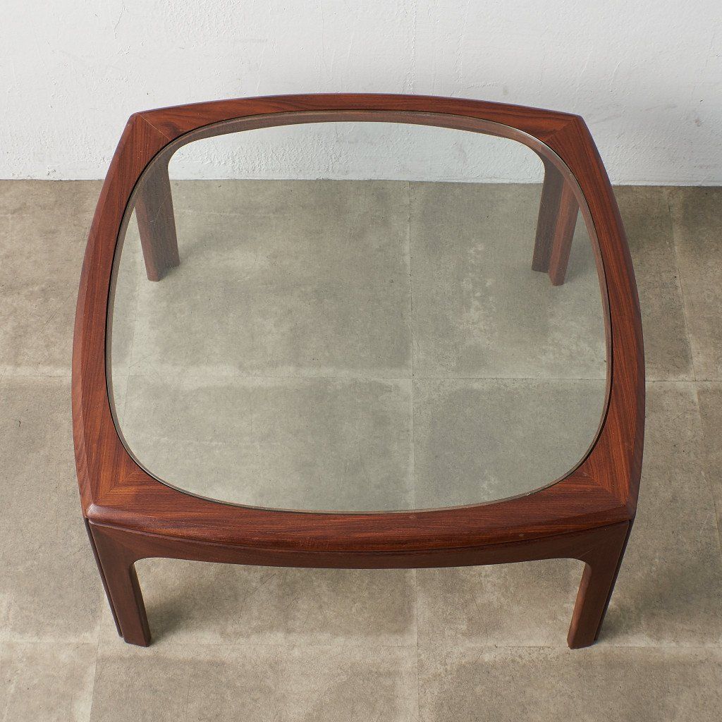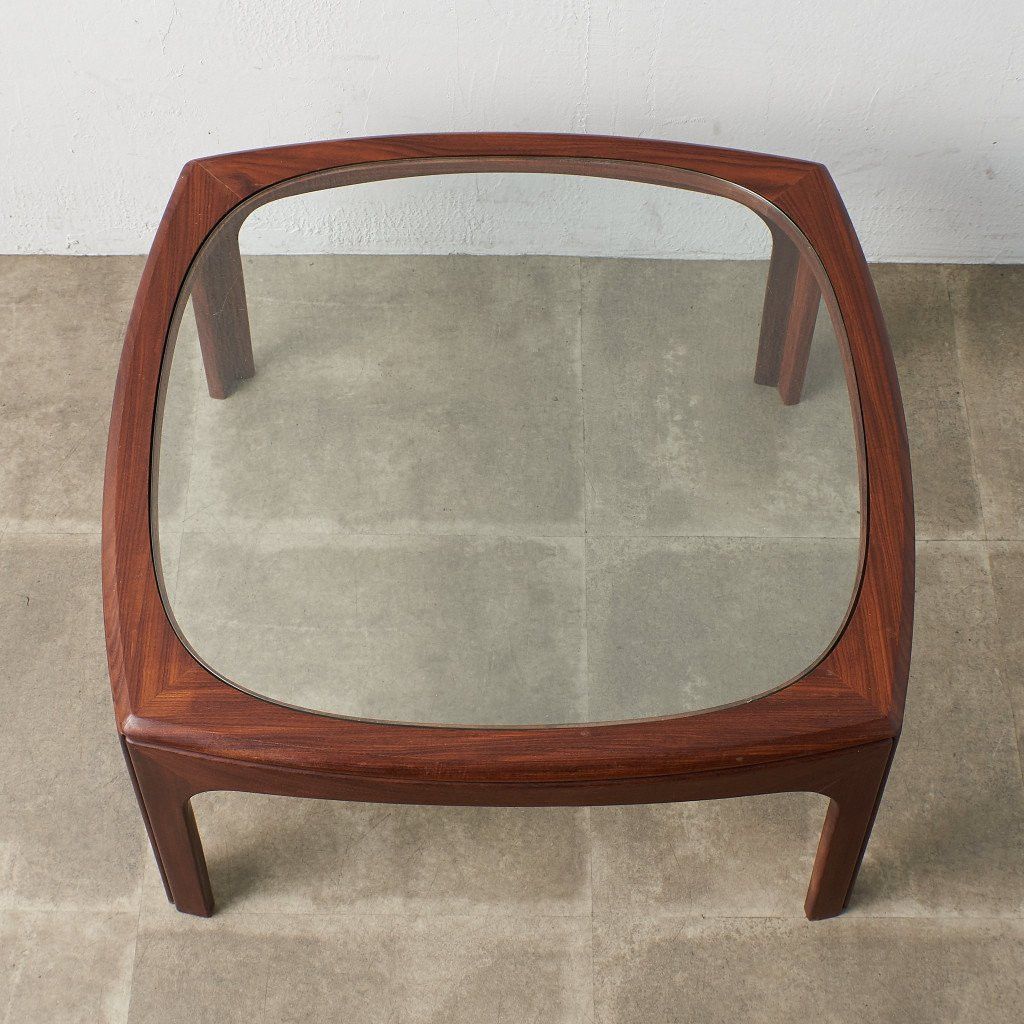 緩やかなカーブを描くスクエア型のフレームに、ガラスのラウンド天板がはめ込まれた、シンプルながらも個性的なデザインが目を惹く一品。G-PLAN定番のコーヒーテーブルとは一味違った希少価値の高いモデルです。