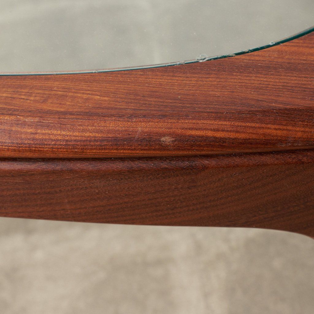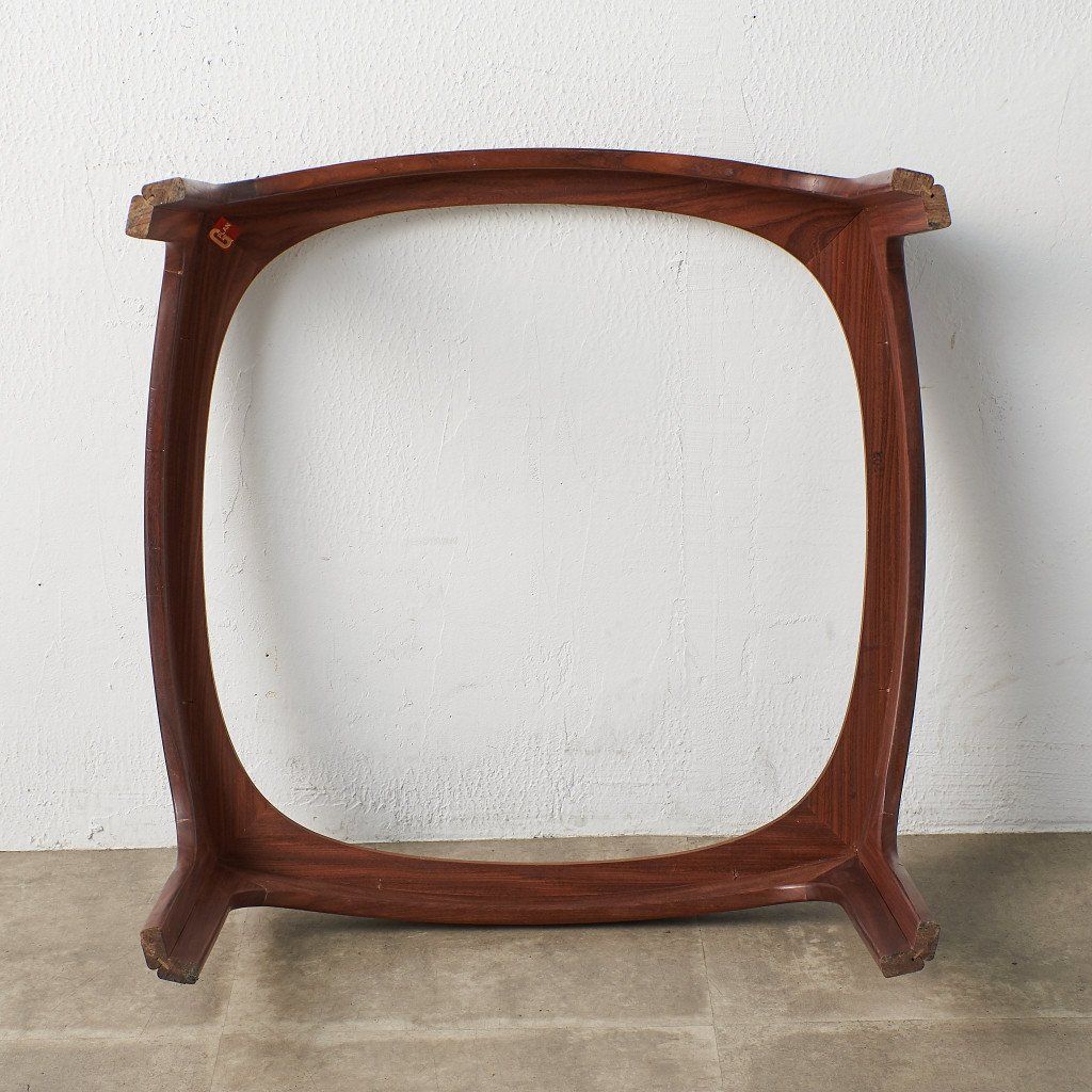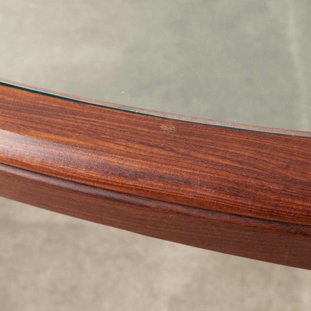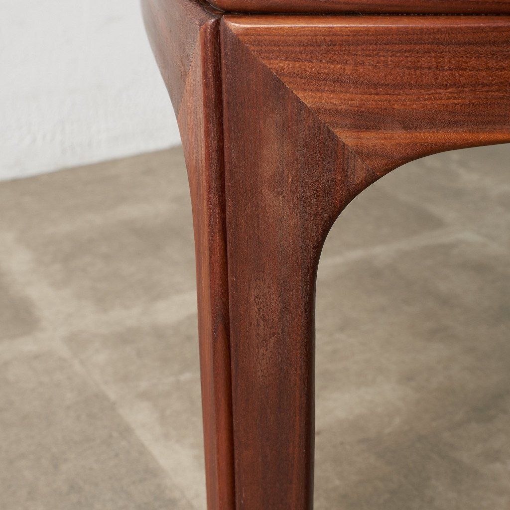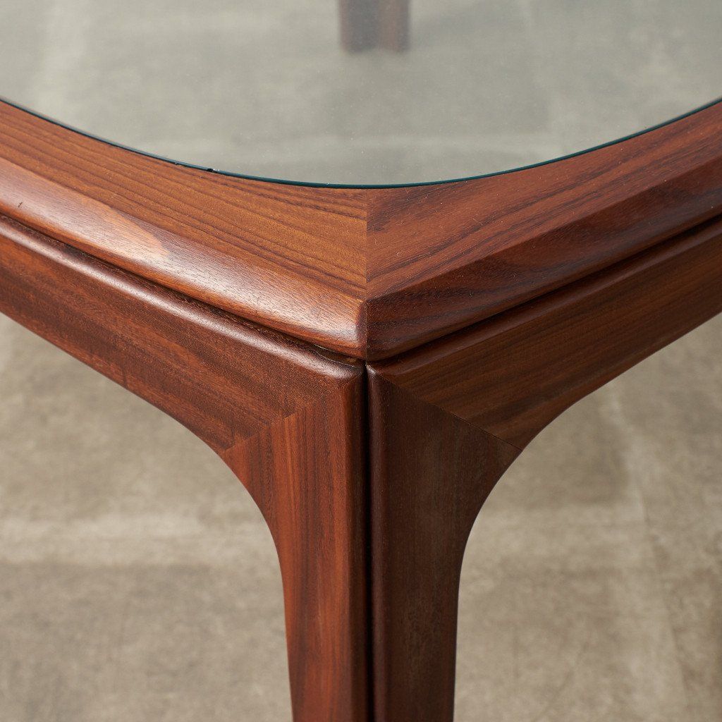 緩やかなカーブを描くスクエア型のフレームに、ガラスのラウンド天板がはめ込まれた、シンプルながらも個性的なデザインが目を惹く一品。G-PLAN定番のコーヒーテーブルとは一味違った希少価値の高いモデルです。