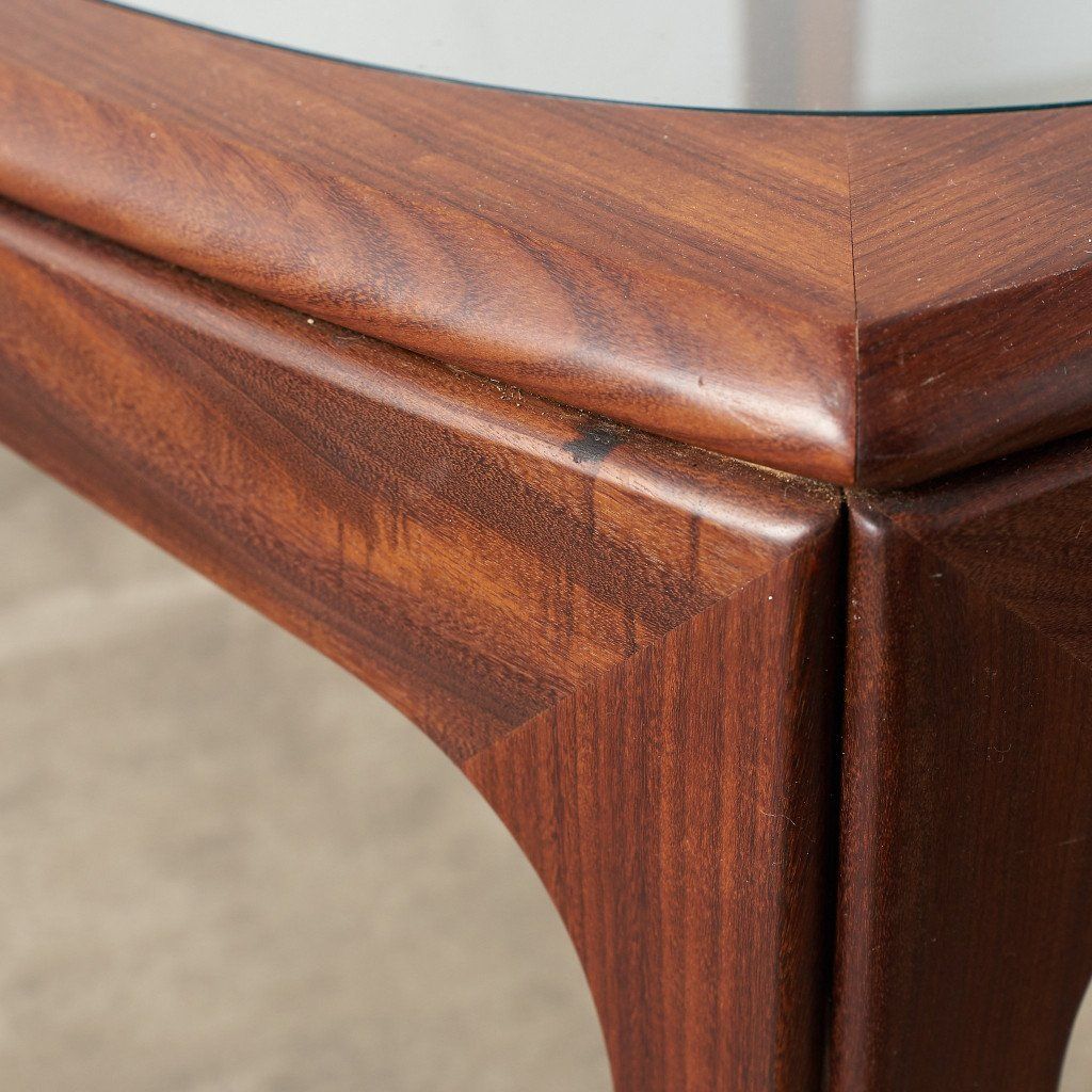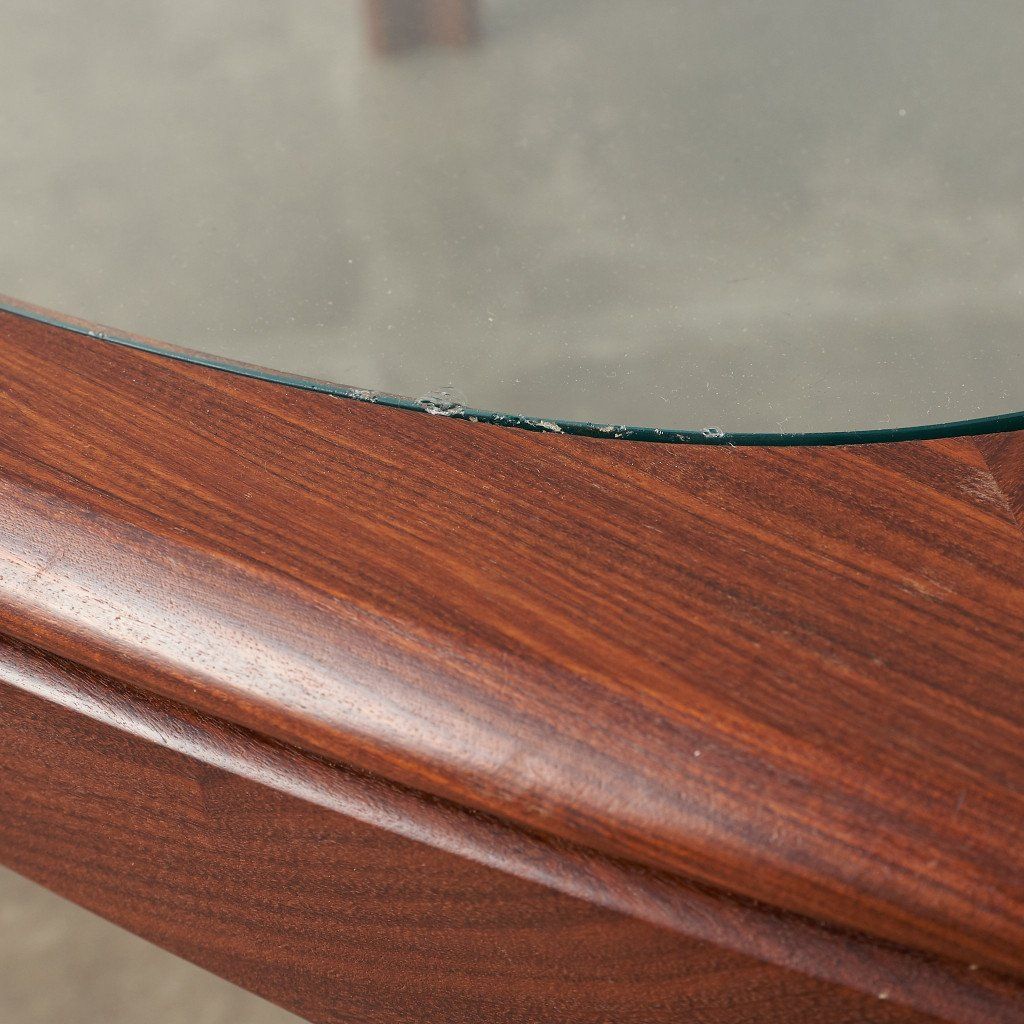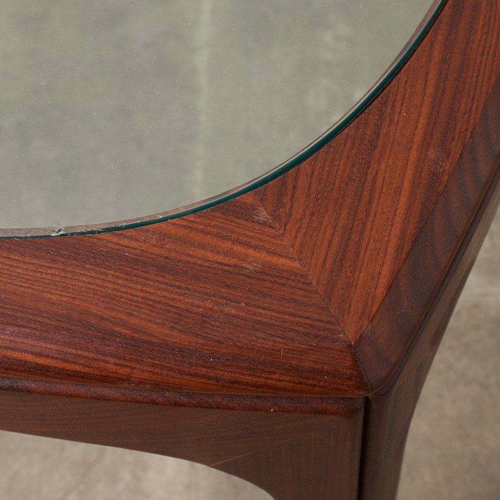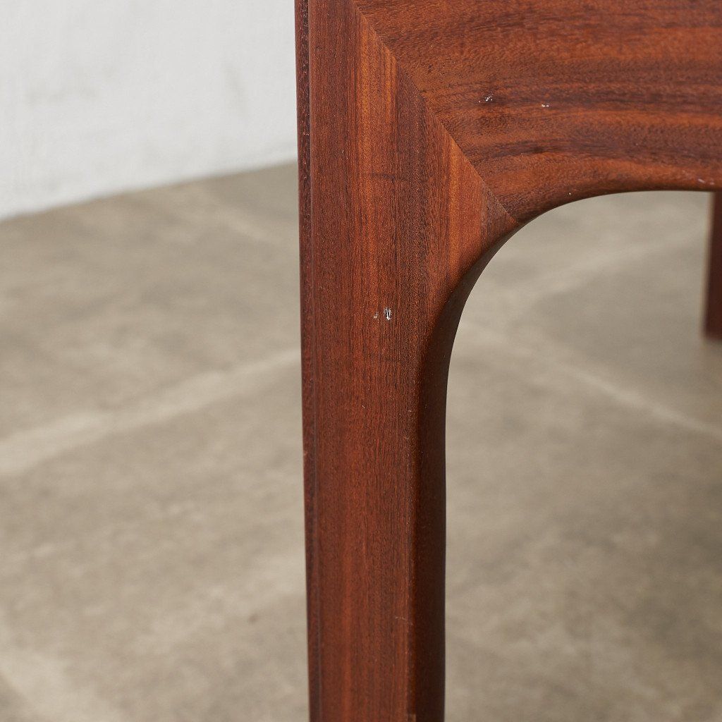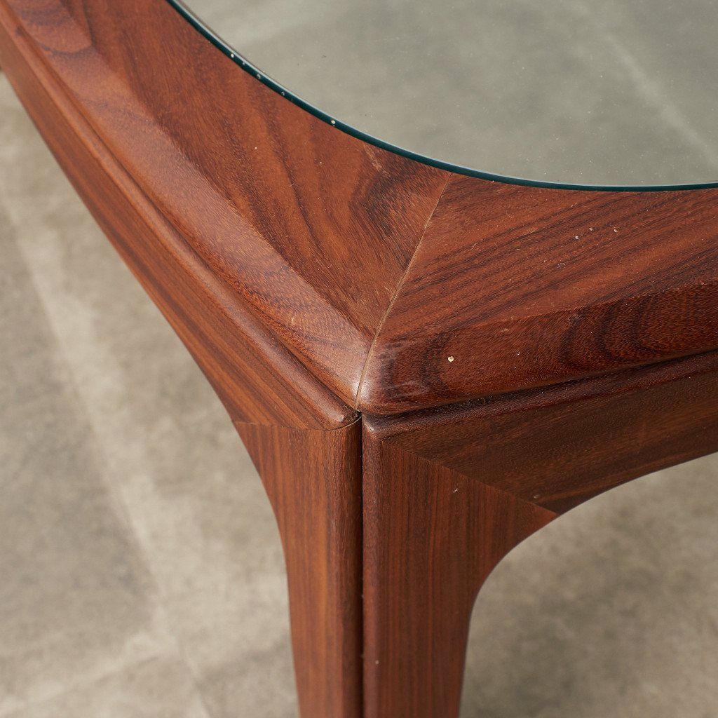 緩やかなカーブを描くスクエア型のフレームに、ガラスのラウンド天板がはめ込まれた、シンプルながらも個性的なデザインが目を惹く一品。G-PLAN定番のコーヒーテーブルとは一味違った希少価値の高いモデルです。