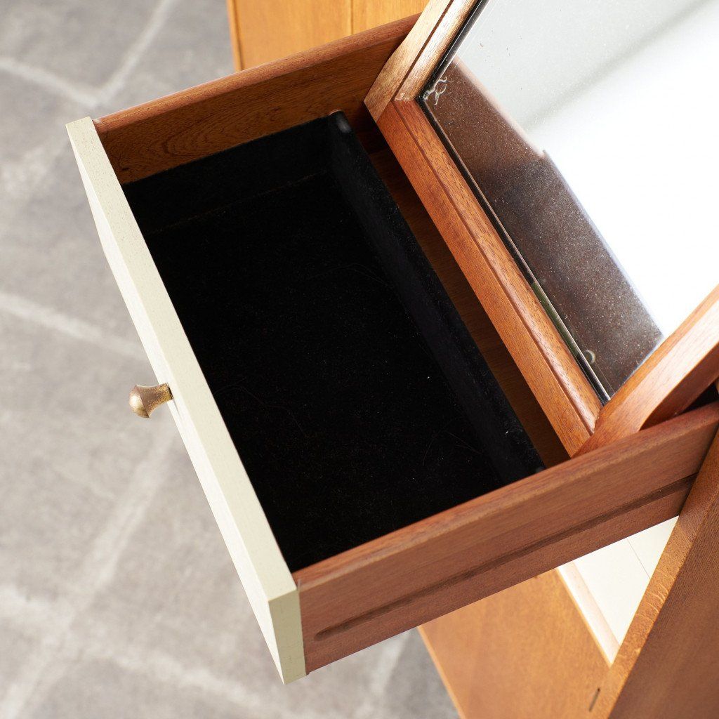 左側はコートなどの衣類を掛けるスペース、右側は収納式ミラー、引き出し、棚スペースとなっており小物の整理も可能な機能性に優れたワードローブです。