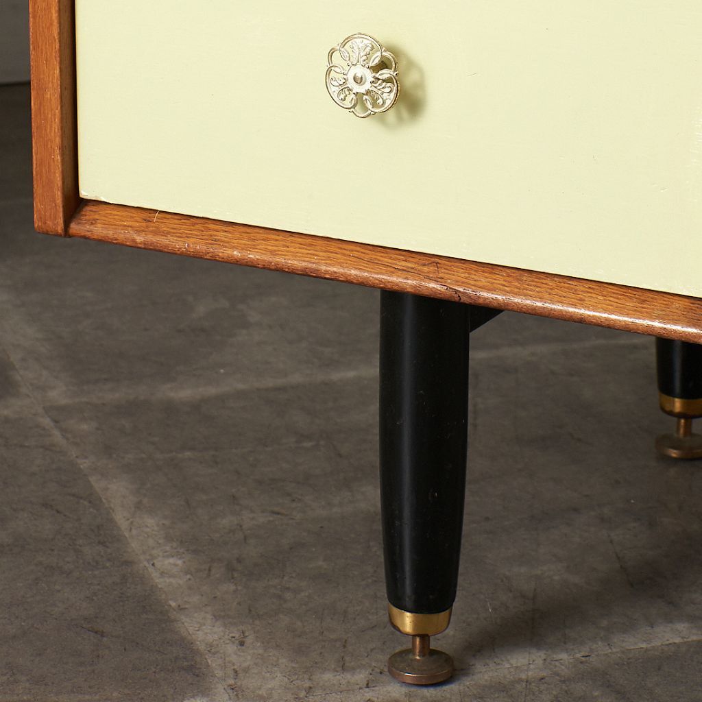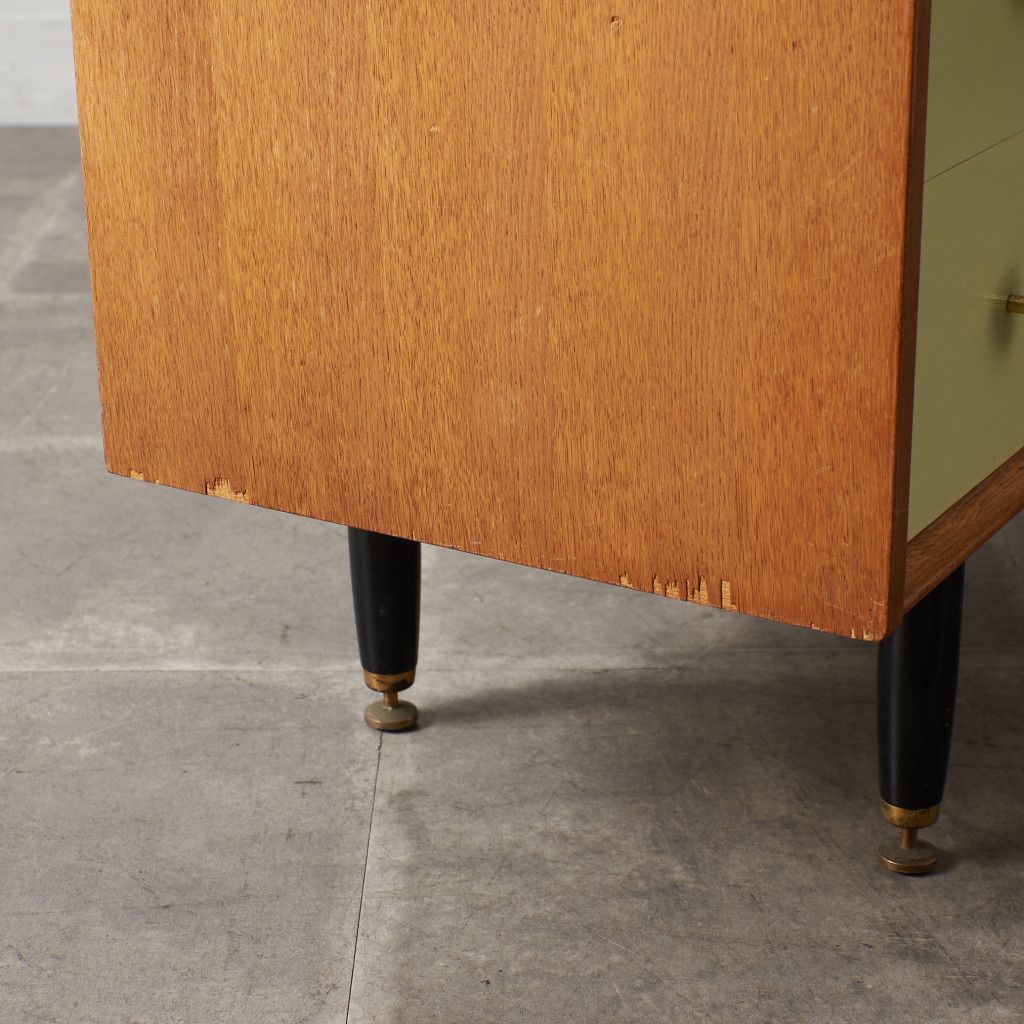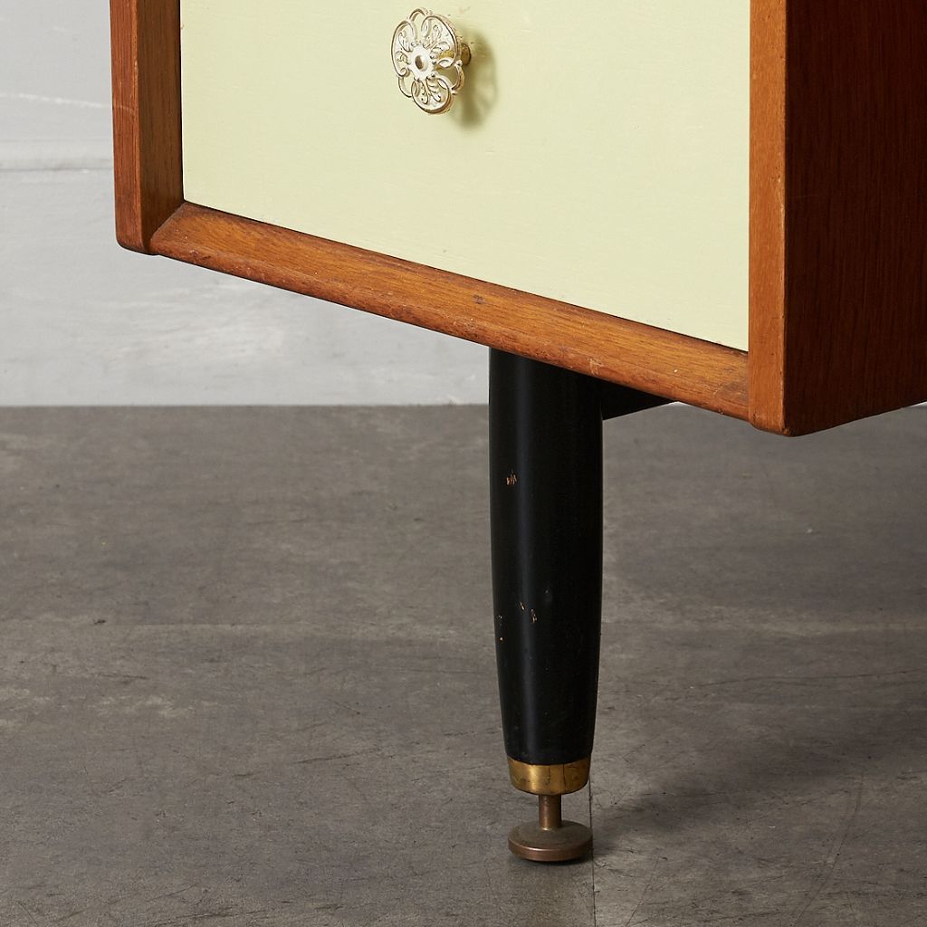 当時「コンパクトで省スペースな作品で、どの部屋、ホール、踊り場にも最適」として1956年に発売した Chinese white シリーズ。真鍮金具がアクセントの、エレガントながら英国らしいスタイリッシュな雰囲気が印象的です。同時期にはレアな類似シリーズ Tola&black が販売されておりますが、Chinese white は、日本のヴィンテージ市場にて希少価値が高く、さらに手に入りにくいシリーズとなっております。