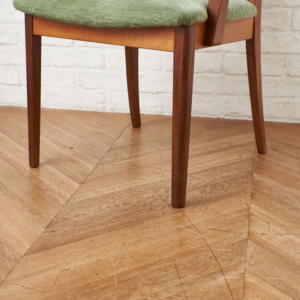 背座両方にクッションを備えた座り心地の良いダイニングアームチェア。他の英国ミッドセンチュリー家具と同様に同時期のデンマークデザインをモチーフにデザインされていますがアーチ型のアールがくり抜かれた笠木のデザインなどどこかクラシカルな印象をたたえる上品なデザインです。