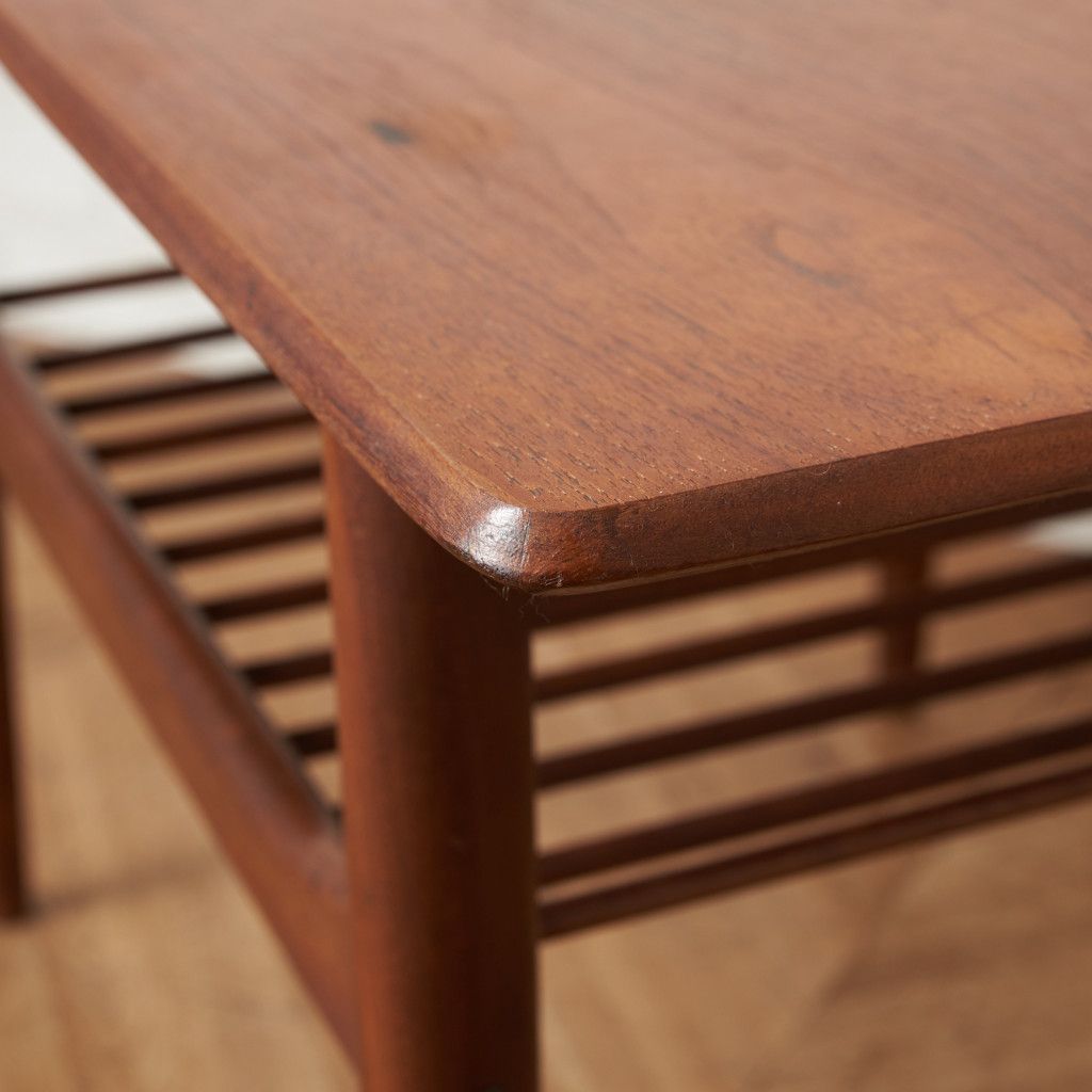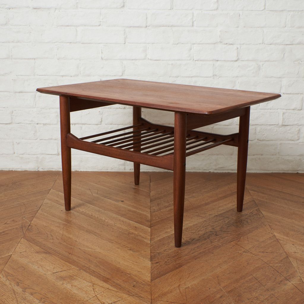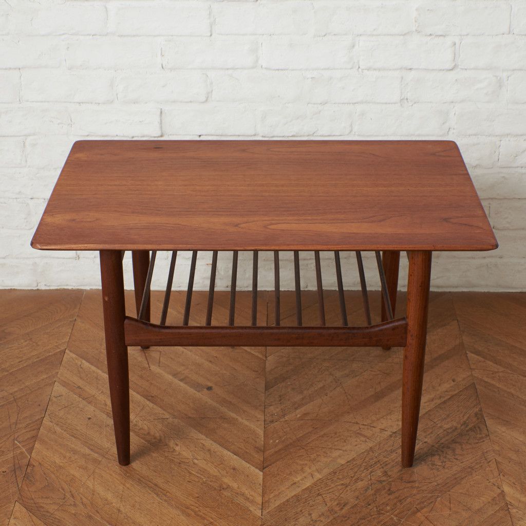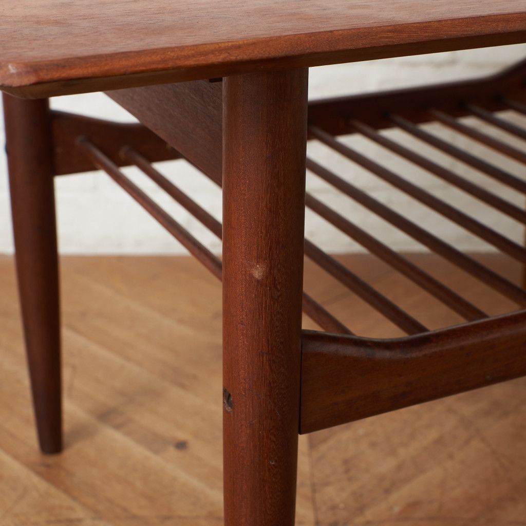 デンマークの巨匠デザイナー、Ib Kofod-Larsen(イブ・コフォード・ラーセン)がデザインしたダニッシュシリーズのオケージョナルテーブル。シンプルなデザインながらも、手触りの良い滑らかなアールや斜めのラインの組み込みなど、細部まで凝った造形です。雑誌などを置くことができるラックがついており機能性にも優れています。センターテーブル、サイドテーブル、花台など、シーンに合わせて多目的に使用することが出来ます。滅多にお目にかかれない希少なテーブルです。