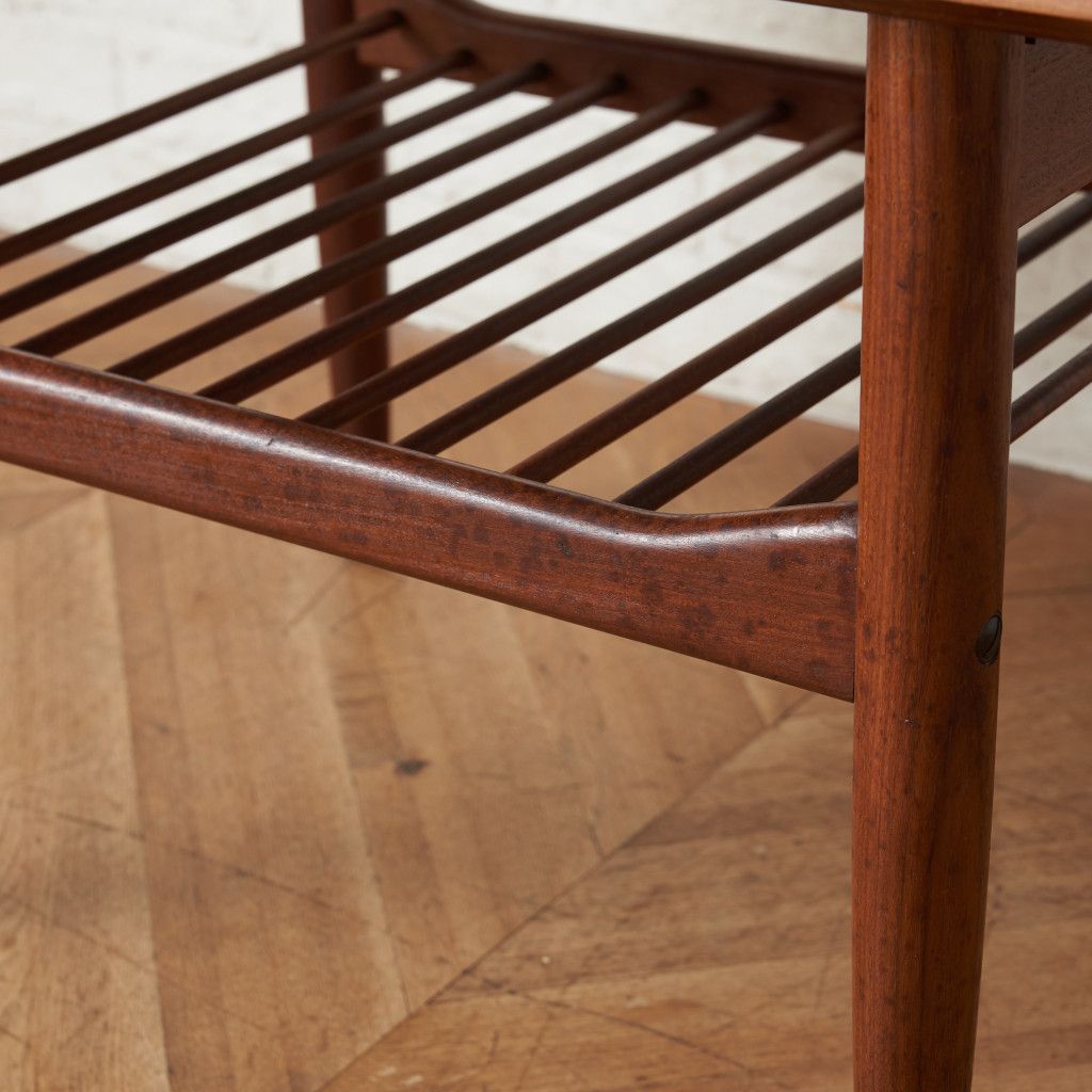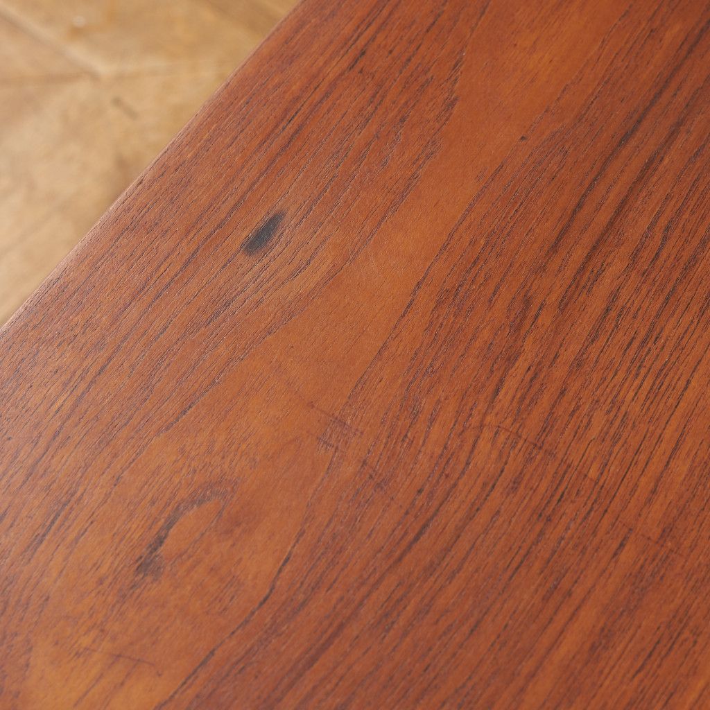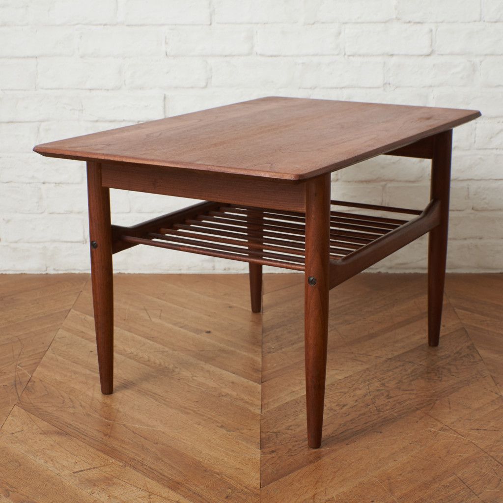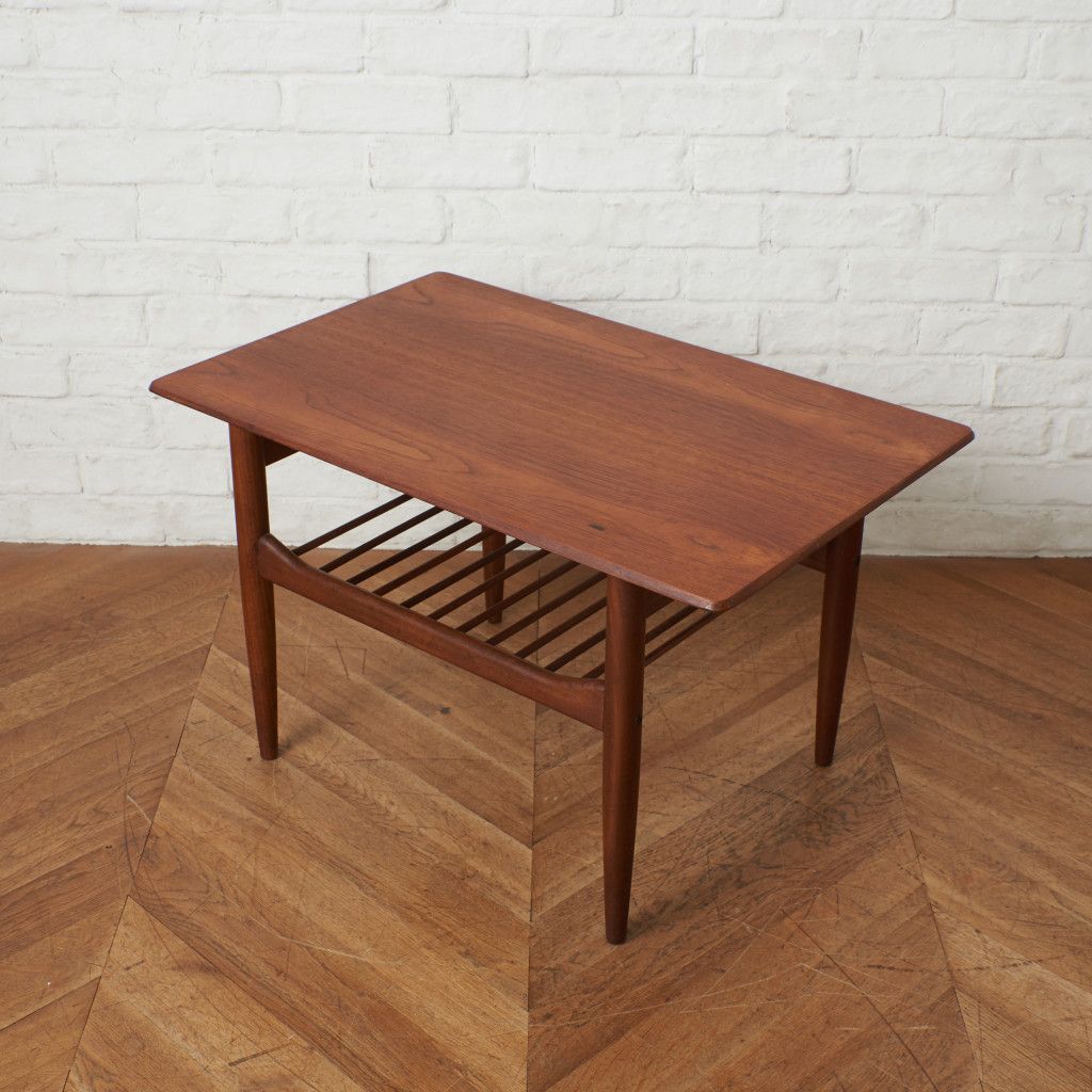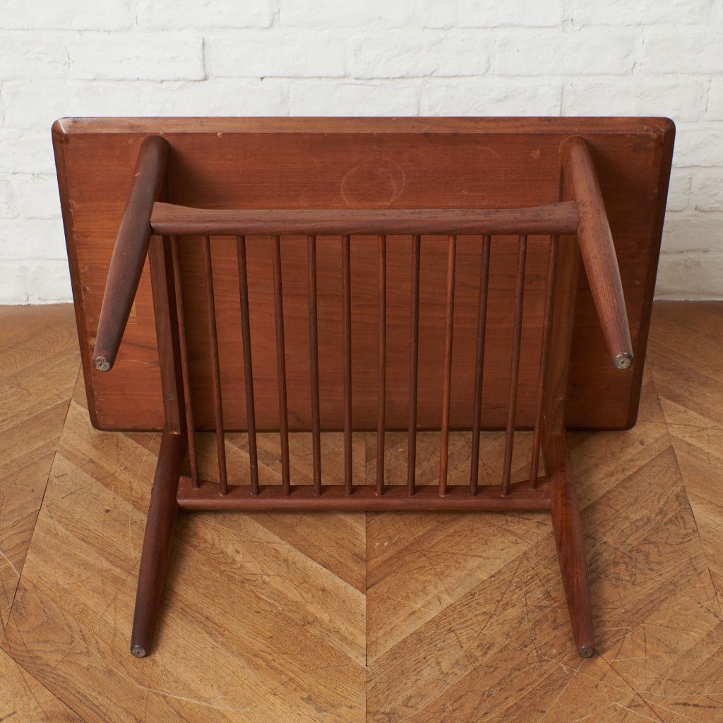 デンマークの巨匠デザイナー、Ib Kofod-Larsen(イブ・コフォード・ラーセン)がデザインしたダニッシュシリーズのオケージョナルテーブル。シンプルなデザインながらも、手触りの良い滑らかなアールや斜めのラインの組み込みなど、細部まで凝った造形です。雑誌などを置くことができるラックがついており機能性にも優れています。センターテーブル、サイドテーブル、花台など、シーンに合わせて多目的に使用することが出来ます。滅多にお目にかかれない希少なテーブルです。