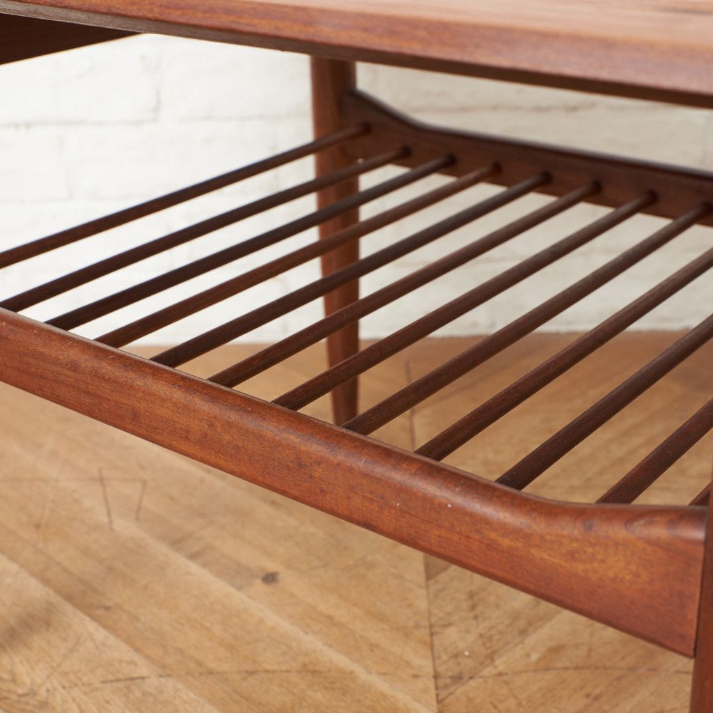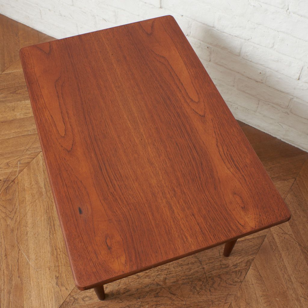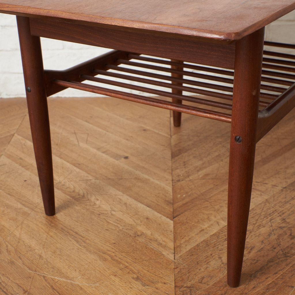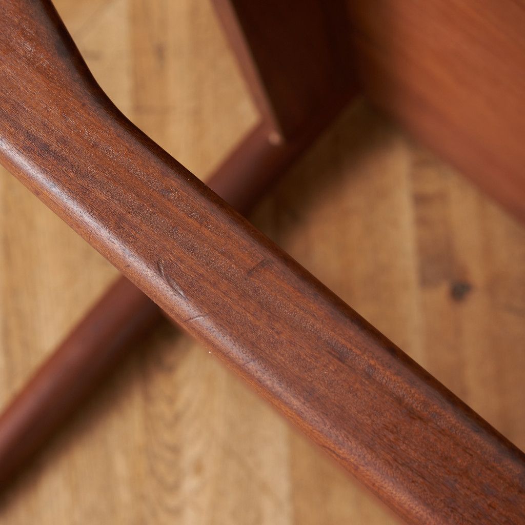 デンマークの巨匠デザイナー、Ib Kofod-Larsen(イブ・コフォード・ラーセン)がデザインしたダニッシュシリーズのオケージョナルテーブル。シンプルなデザインながらも、手触りの良い滑らかなアールや斜めのラインの組み込みなど、細部まで凝った造形です。雑誌などを置くことができるラックがついており機能性にも優れています。センターテーブル、サイドテーブル、花台など、シーンに合わせて多目的に使用することが出来ます。滅多にお目にかかれない希少なテーブルです。