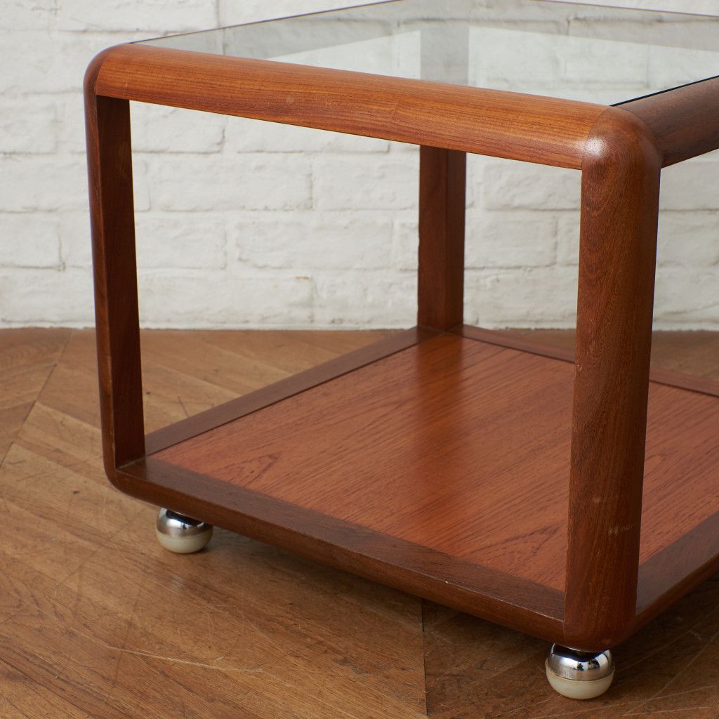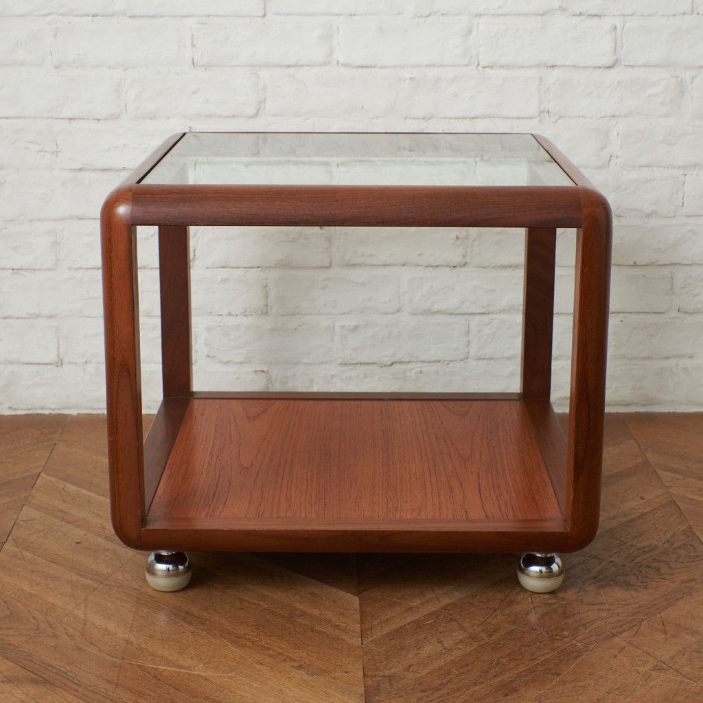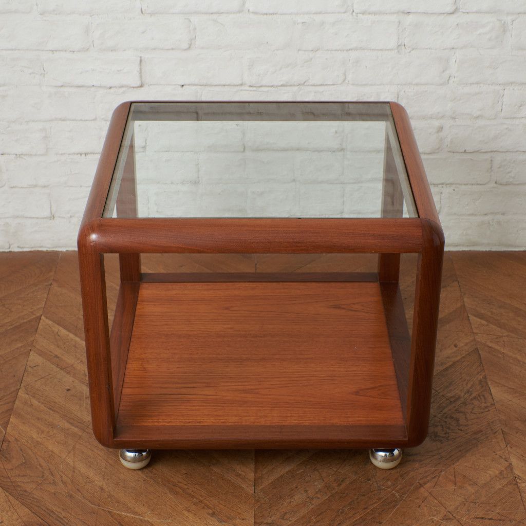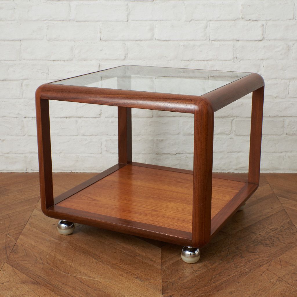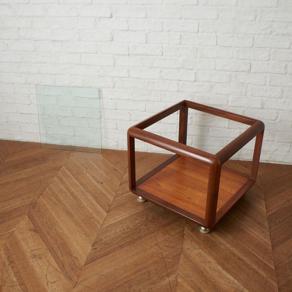 コンパクトでキューブ型のフォルムが印象的なコーヒーテーブル。美しいチーク材ががフレームに使用され、天板にはクリアグラスがセットされています。丈夫で個性的なキャスターが付いているので、掃除の際などの移動も楽に行なえます。日本ではあまり見かけない珍しいお品です。