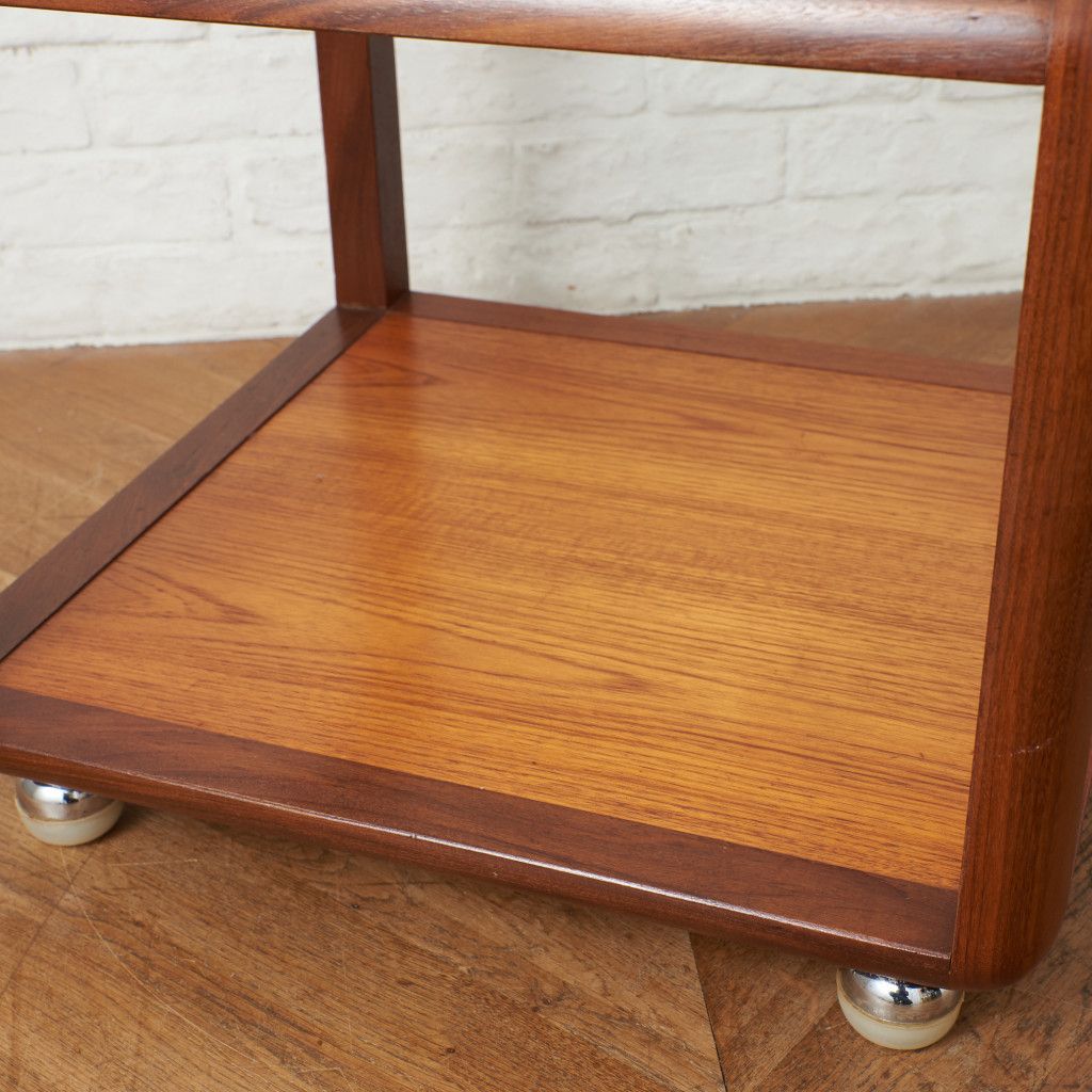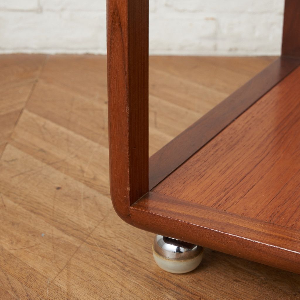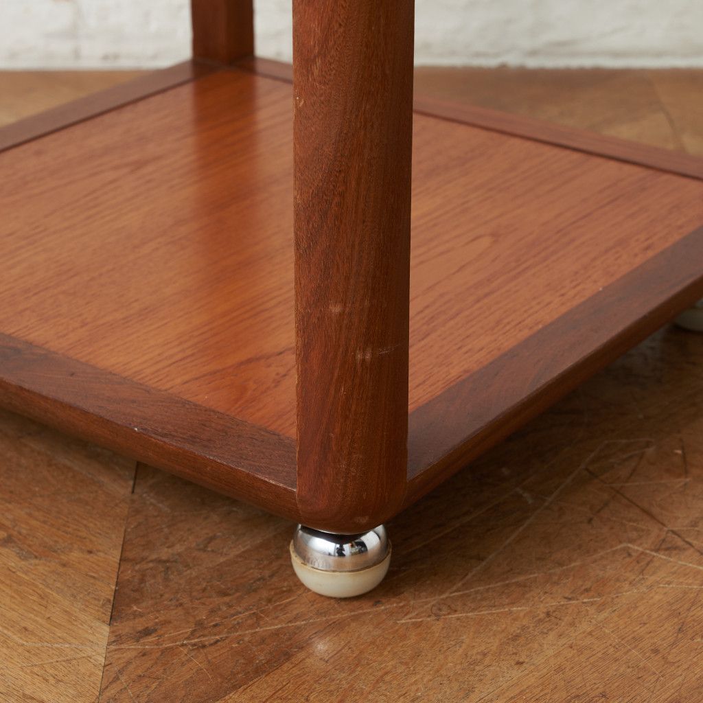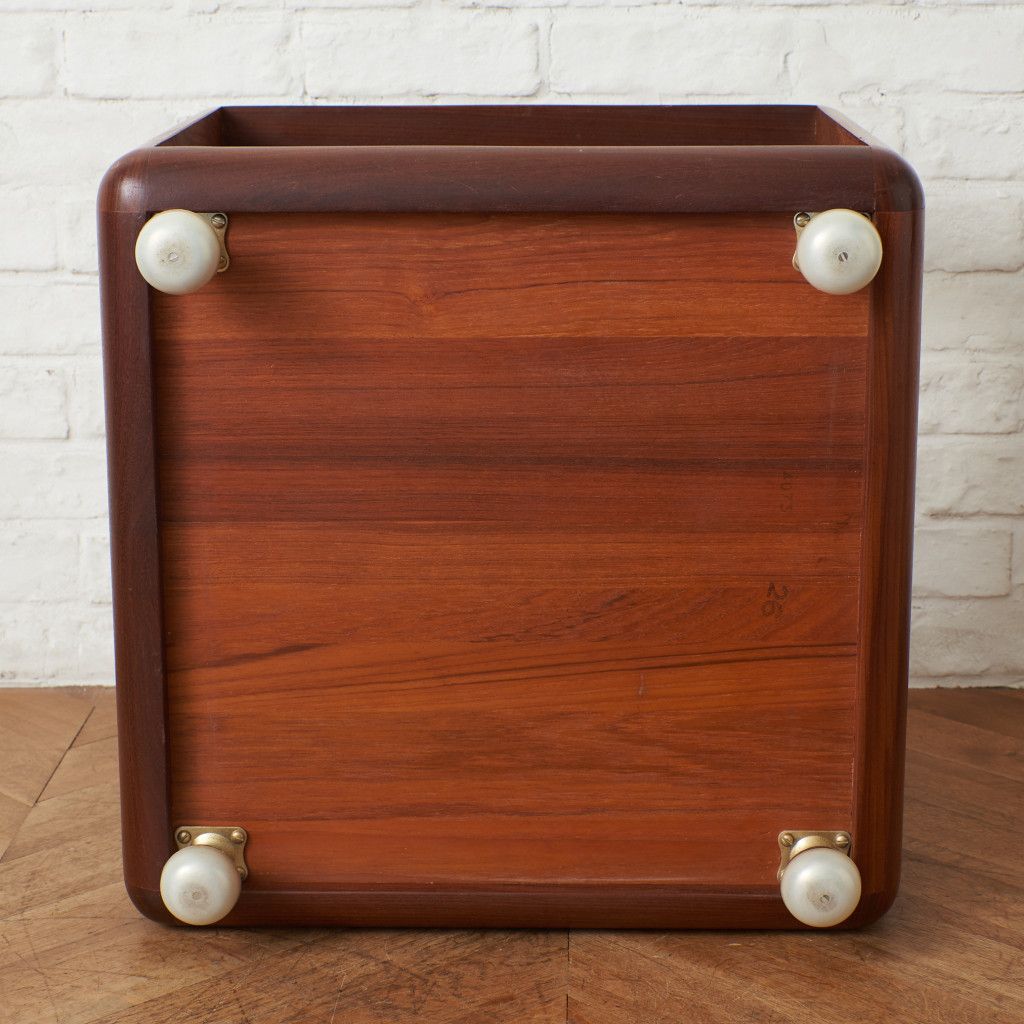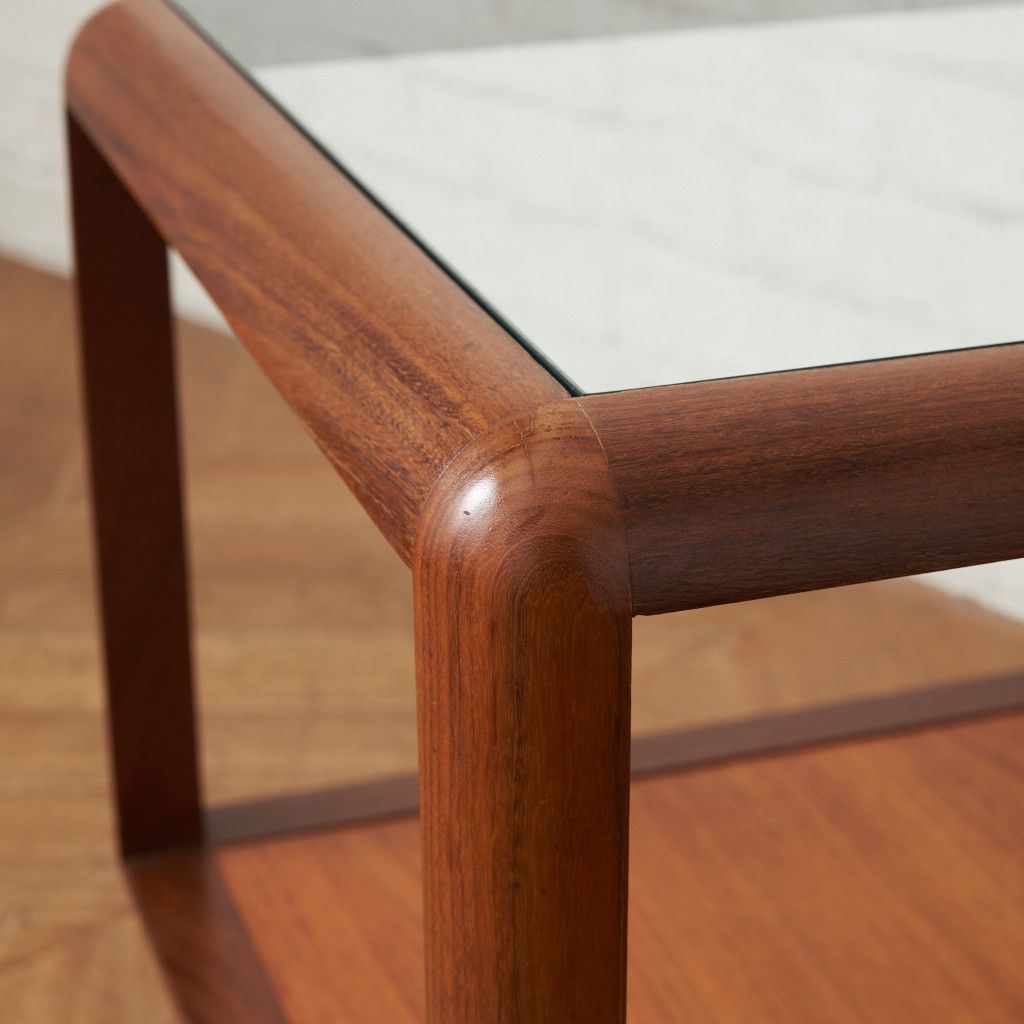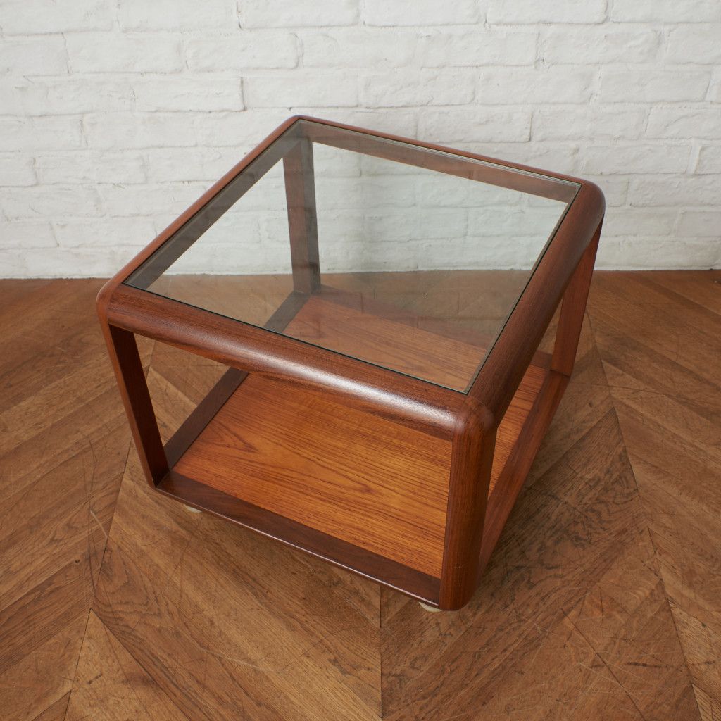 コンパクトでキューブ型のフォルムが印象的なコーヒーテーブル。美しいチーク材ががフレームに使用され、天板にはクリアグラスがセットされています。丈夫で個性的なキャスターが付いているので、掃除の際などの移動も楽に行なえます。日本ではあまり見かけない珍しいお品です。
