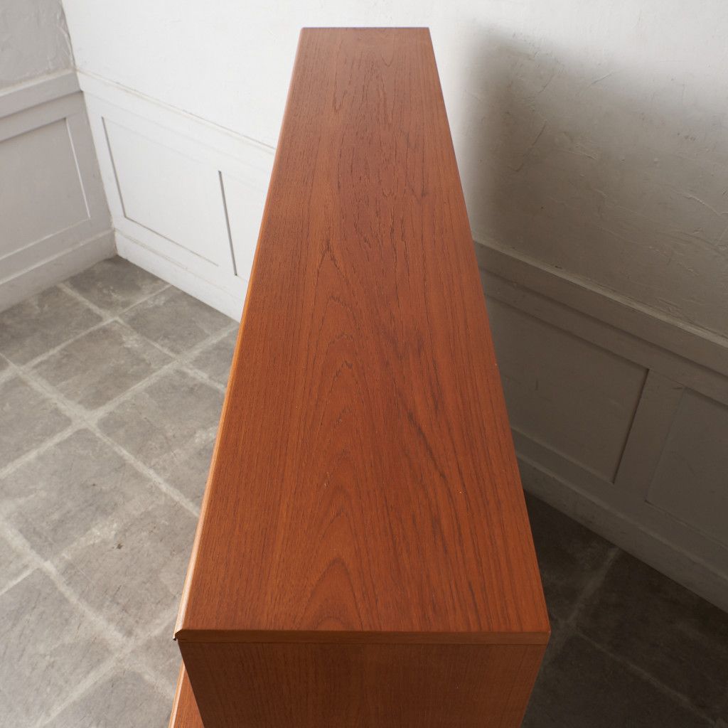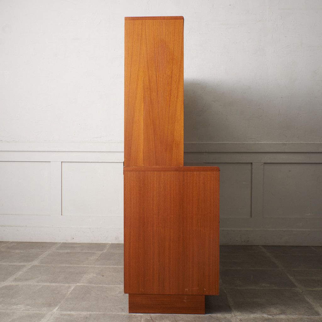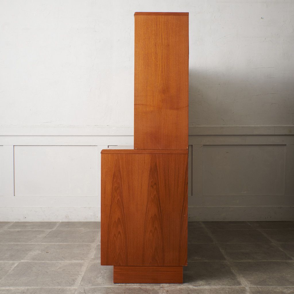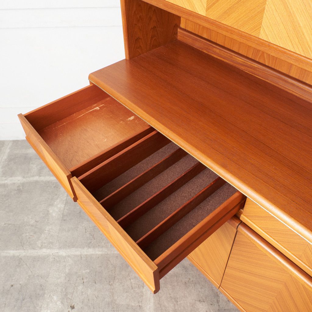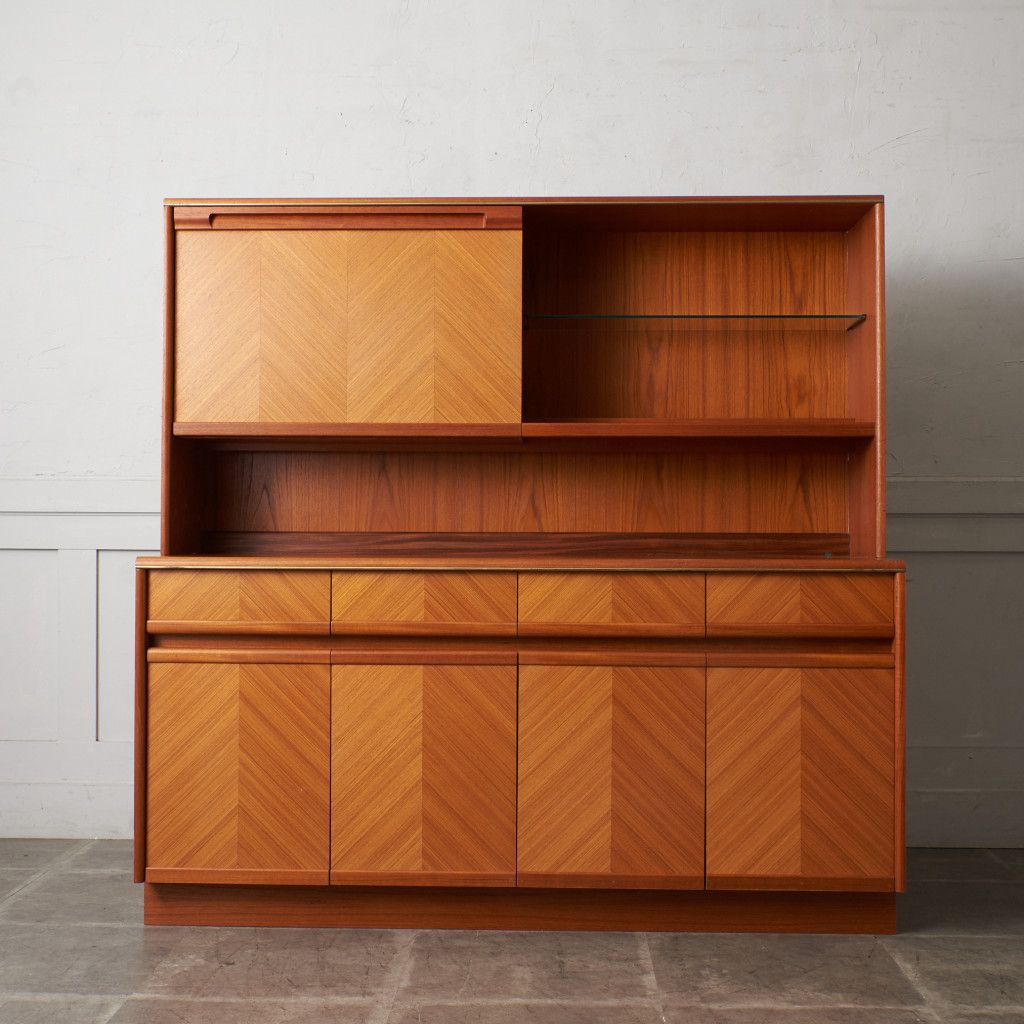 美しいチーク材の木目に、ヘリンボーンのパーケットがアクセントとなったウォールキャビネット。国内ヴィンテージ市場であまり見ることのないかなりレアなシリーズです。