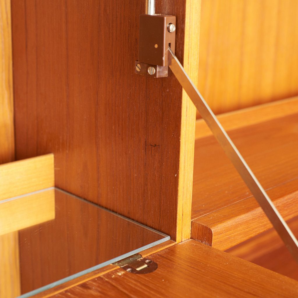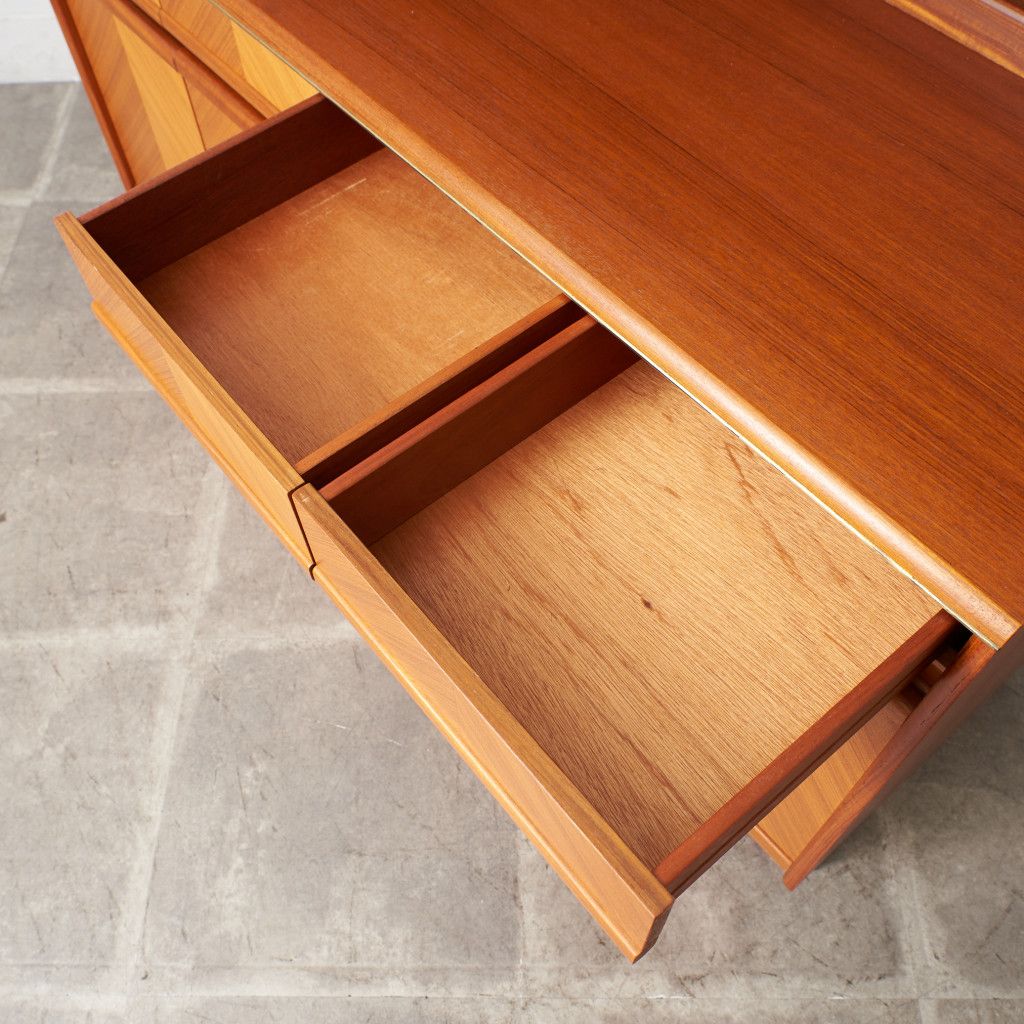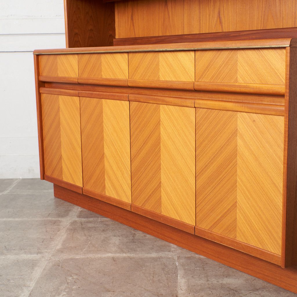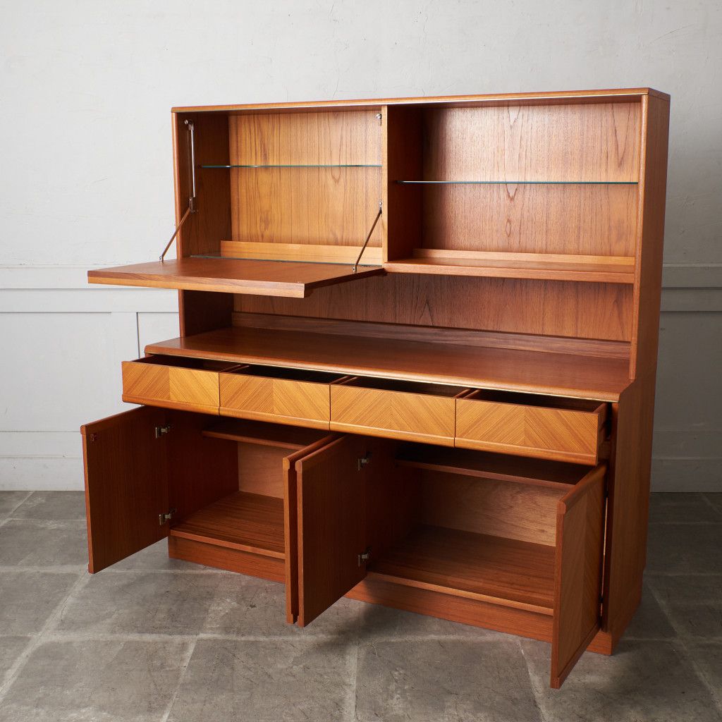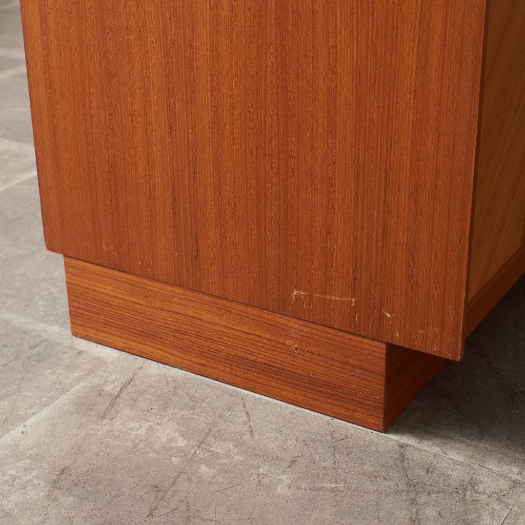 美しいチーク材の木目に、ヘリンボーンのパーケットがアクセントとなったウォールキャビネット。国内ヴィンテージ市場であまり見ることのないかなりレアなシリーズです。