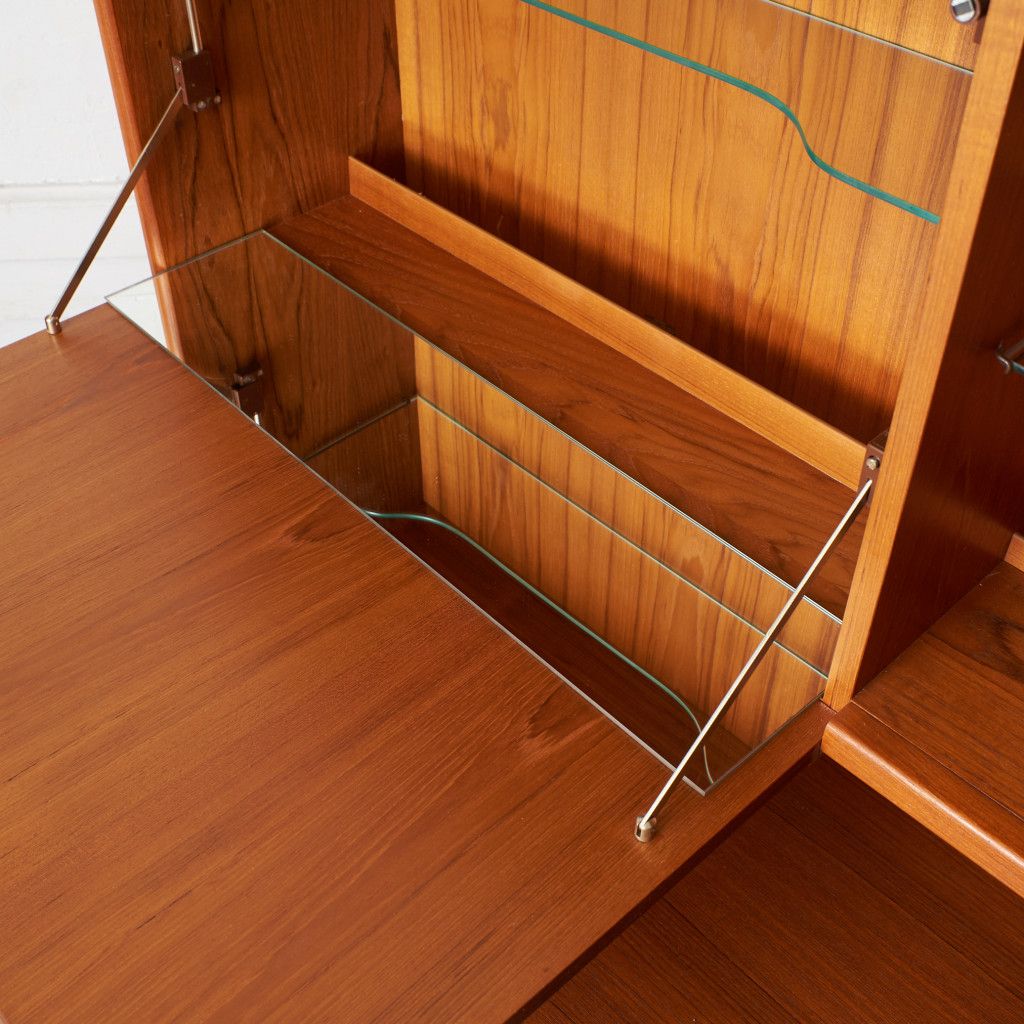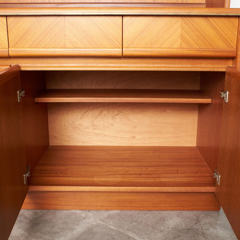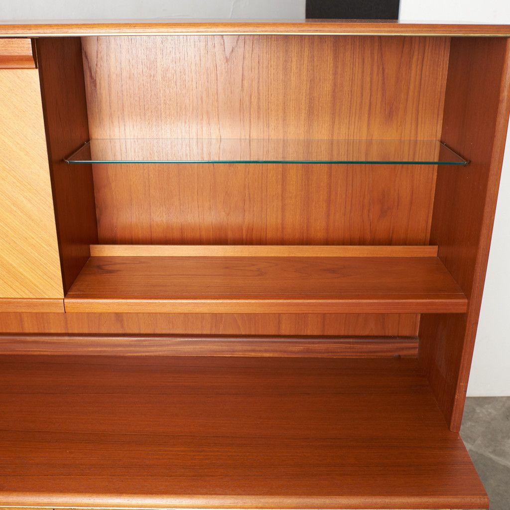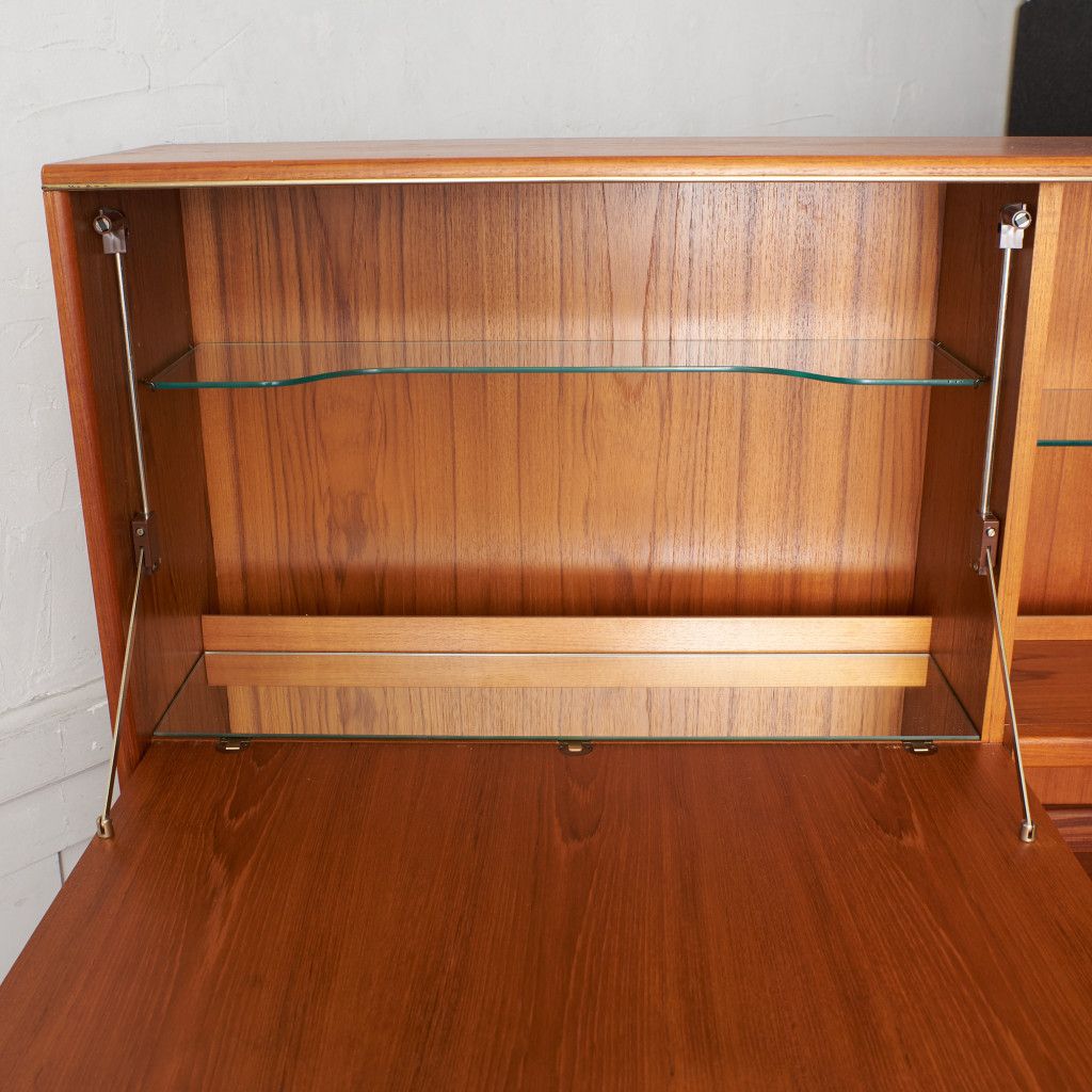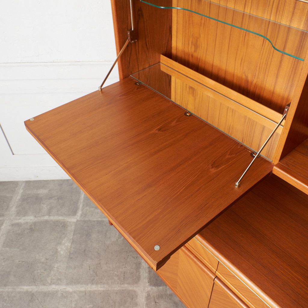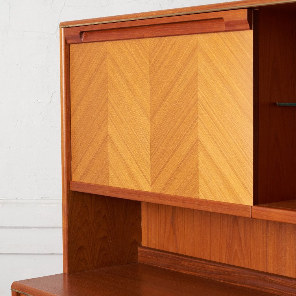 美しいチーク材の木目に、ヘリンボーンのパーケットがアクセントとなったウォールキャビネット。国内ヴィンテージ市場であまり見ることのないかなりレアなシリーズです。