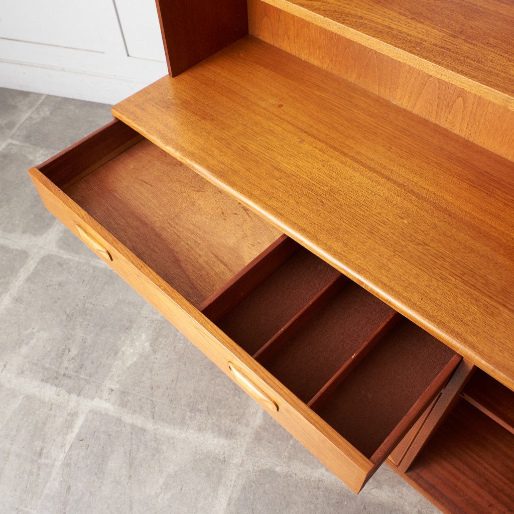 大容量収納を下段に、上段にはオープン棚や開くことでコンパクトな書斎デスクに変わるビューローを備えており、食器棚や書斎デスク、リビングの飾り棚、はたまたひとり暮らし用のオールインワン家具として、様々な用途にお使いいただけます。日本と似た住宅事情のイギリスならではの非常に実用性の高い設計のサイドボードです。