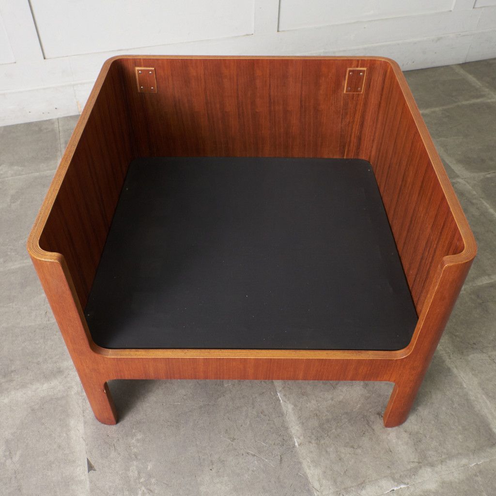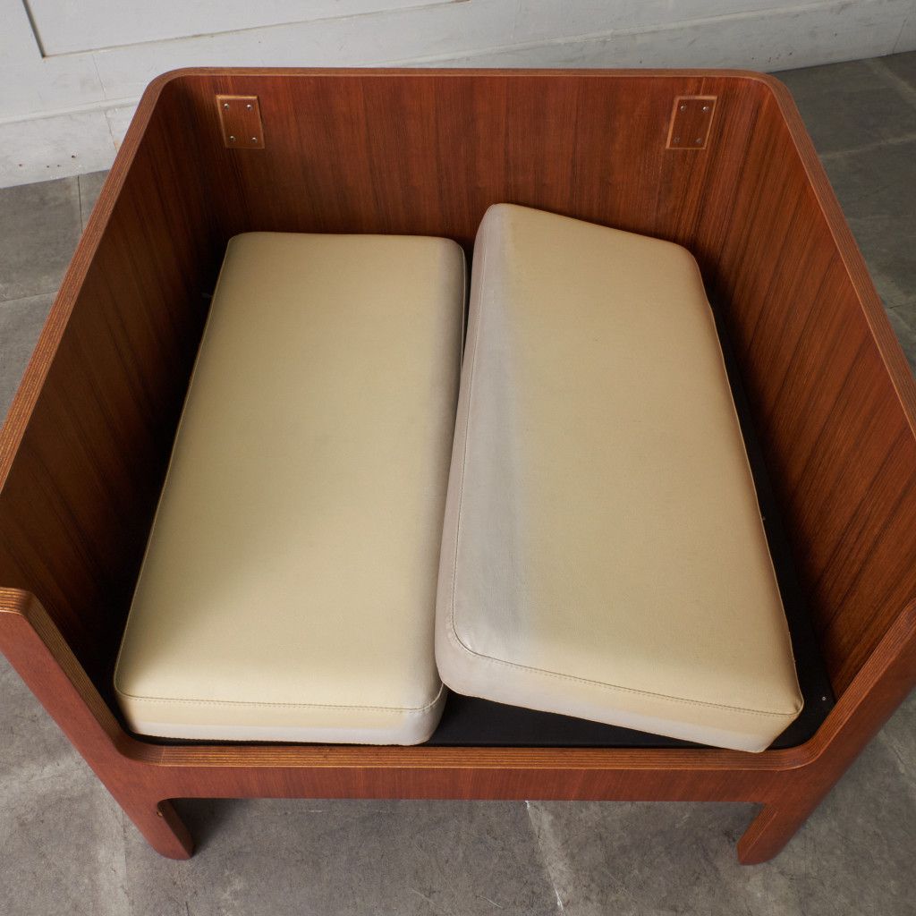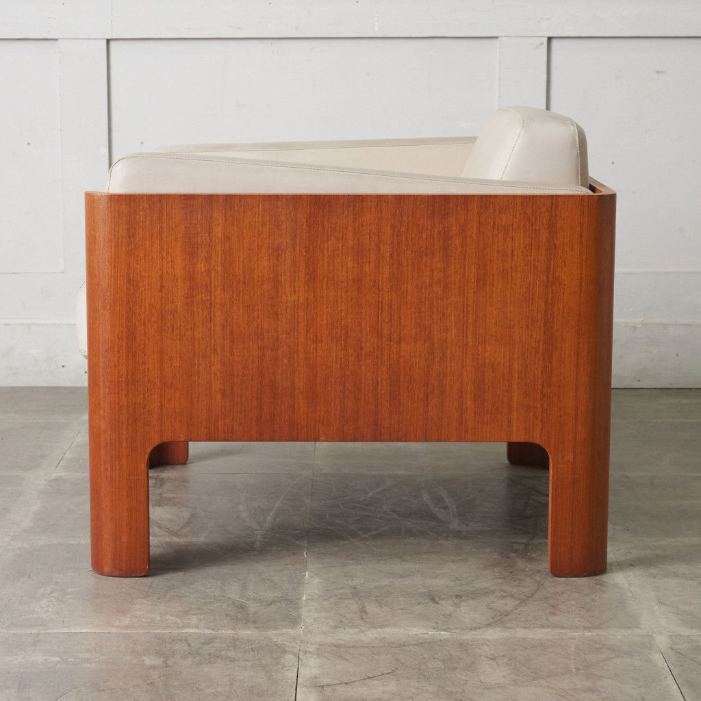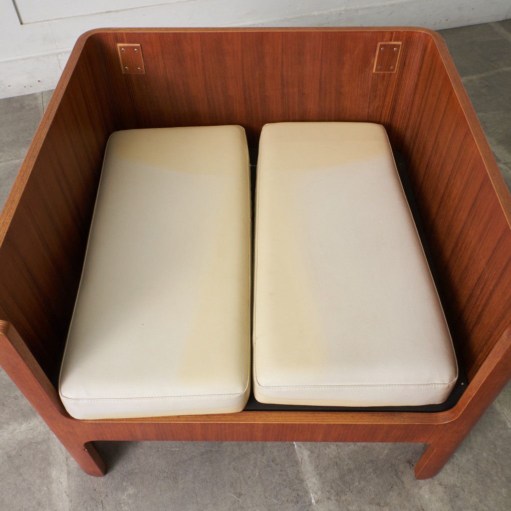 国立京都国際会館のロビー用にデザインされたもので、一体成形ならではの曲面と直線的なデザインのマッチングが美しいソファです。北欧家具をモチーフにデザインされたシンプルな造形が魅力的。木目の側面を眺めると、構造の成り立ちがとてもよく分かります。ほぼ継ぎ目が無く、ひとつのプライウッドで形成されている天童木工の技術力の高さを感じさせる、ジャパニーズモダンデザインの名作家具です。