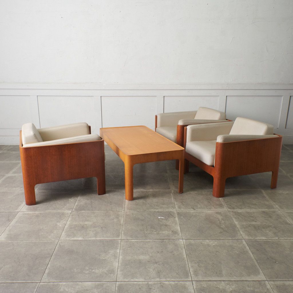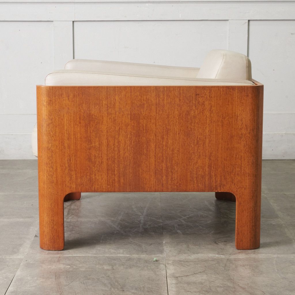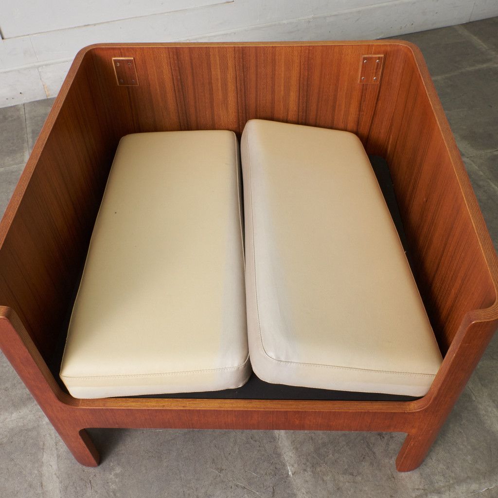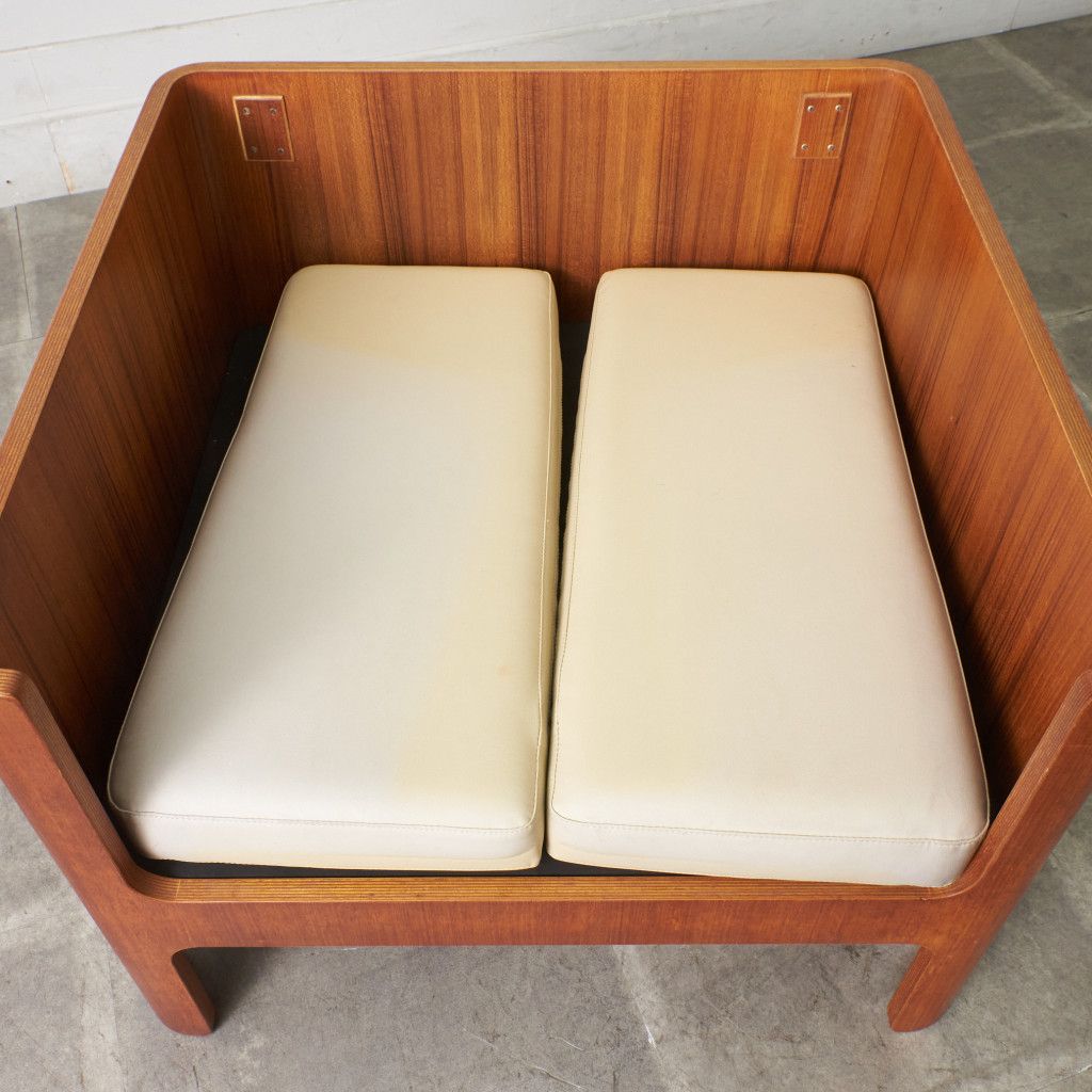 国立京都国際会館のロビー用にデザインされたもので、一体成形ならではの曲面と直線的なデザインのマッチングが美しいソファです。北欧家具をモチーフにデザインされたシンプルな造形が魅力的。木目の側面を眺めると、構造の成り立ちがとてもよく分かります。ほぼ継ぎ目が無く、ひとつのプライウッドで形成されている天童木工の技術力の高さを感じさせる、ジャパニーズモダンデザインの名作家具です。