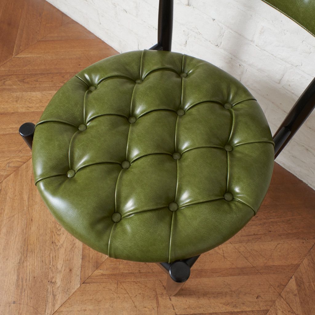 通常ではチーク座が貼られている背もたれの背面パネルにはハカランダと呼ばれるブリジアンローズウッドを使用、墨を流したような明瞭な木目と赤みを帯びた木肌が印象的です。シートと背もたれのクッションにはチェスターフィールドスタイルのボタン留めのアレンジが加えられています。