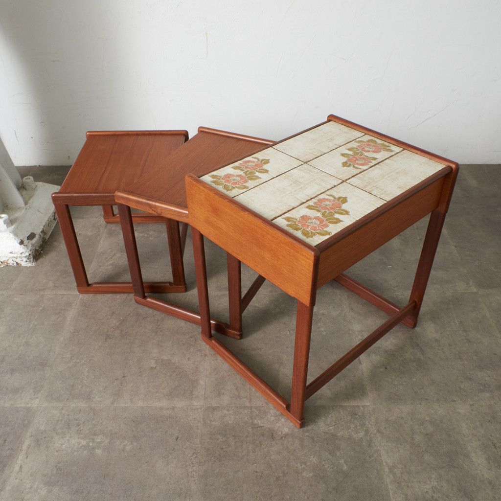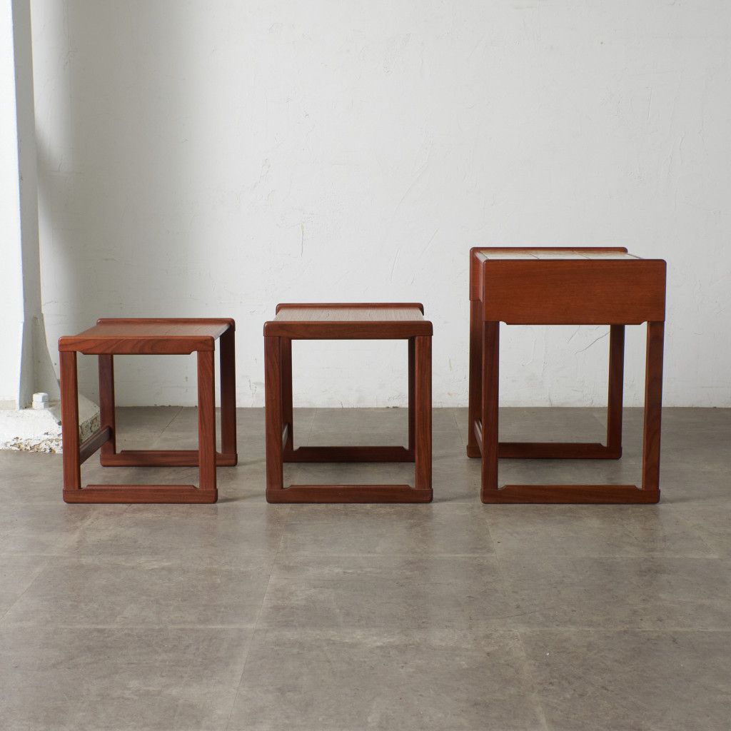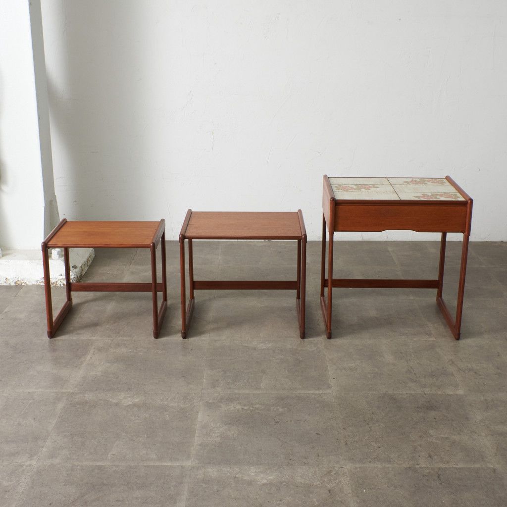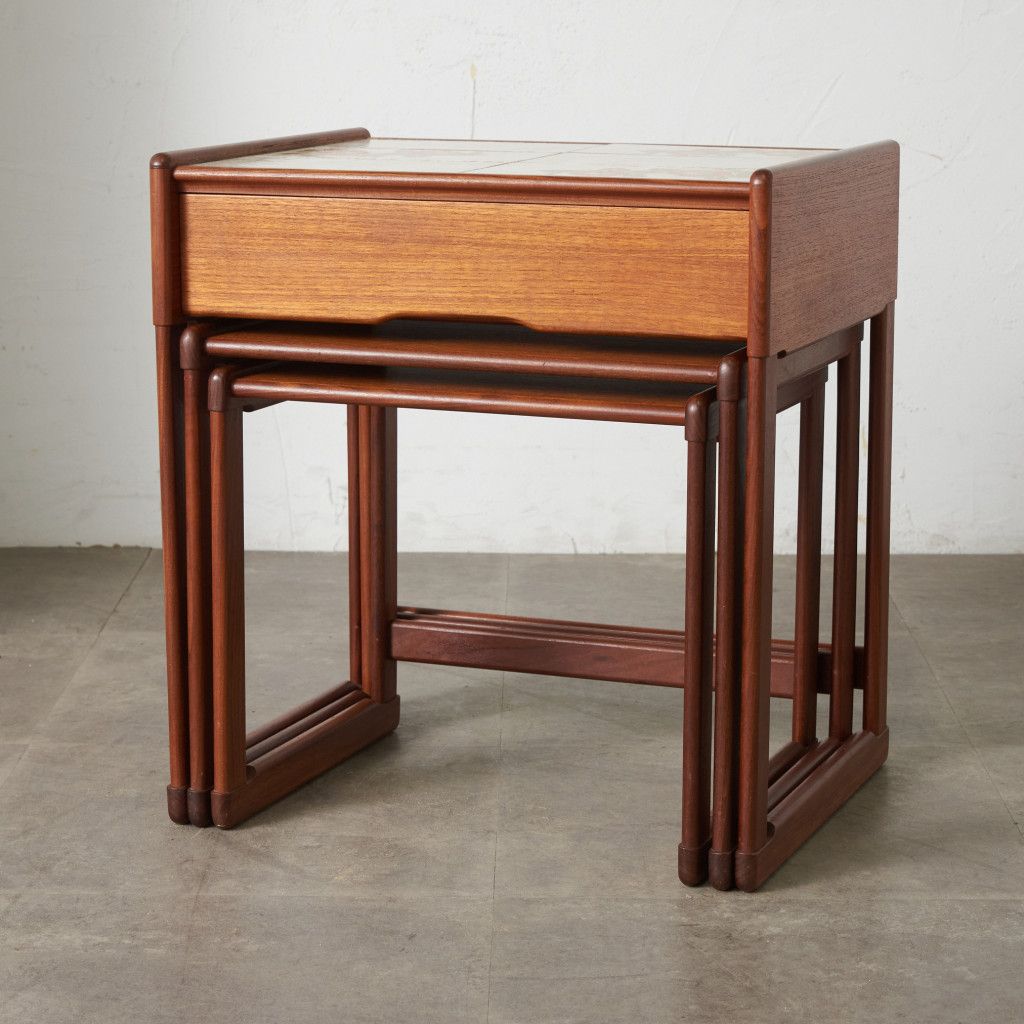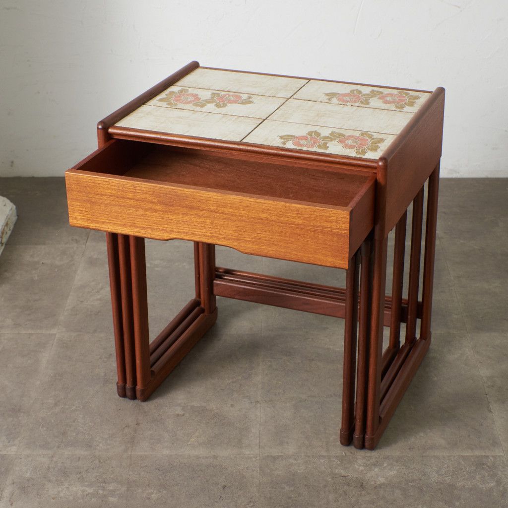 用途に合わせて引き出したり、纏めたりできるとても便利な入子構造のネストテーブル。一番大きなテーブルにはタイルトップ天板と抽斗一つ備わっています。リビングセンターテーブルやサイドテーブル、寝室に置くナイトテーブルなど多目的に使える使い勝手の良いお品。G-PLANのラインナップの中でも流通量の少ない非常に珍しいモデルです。