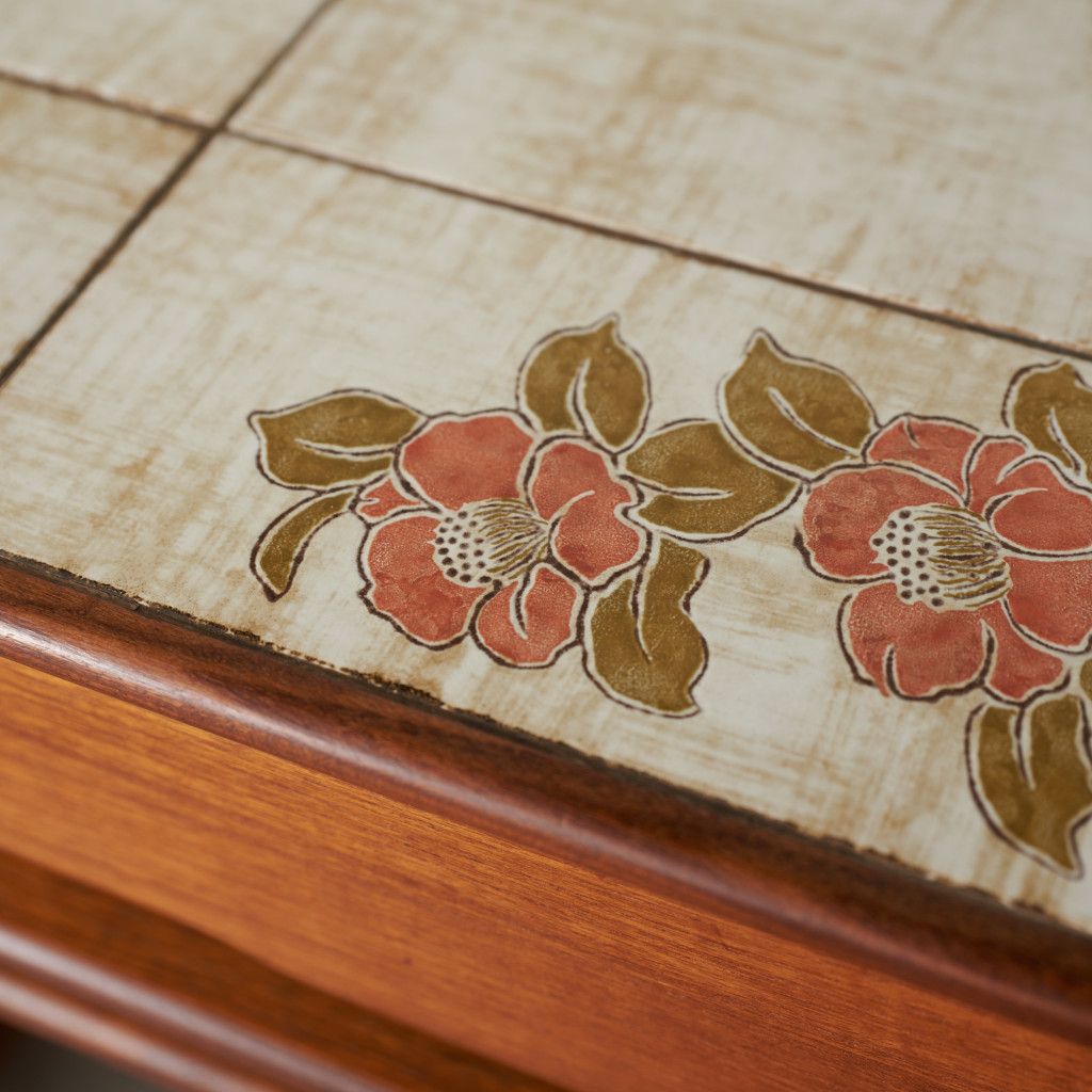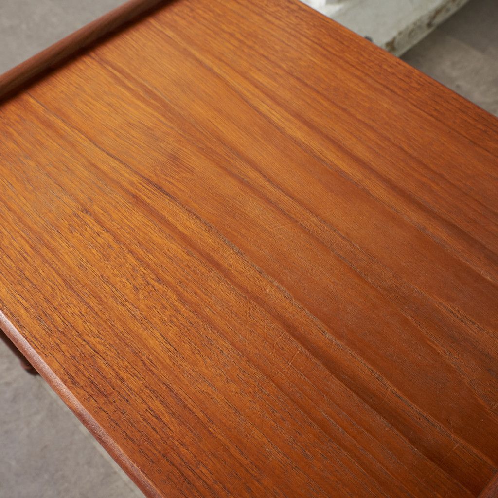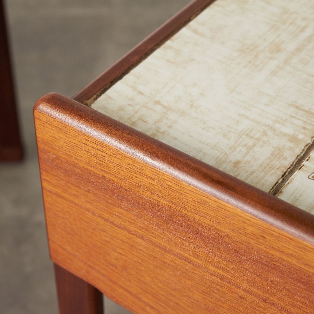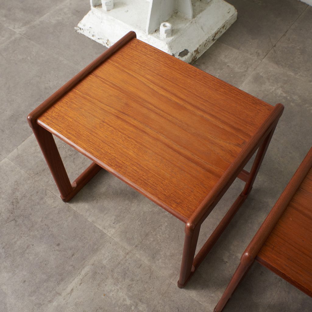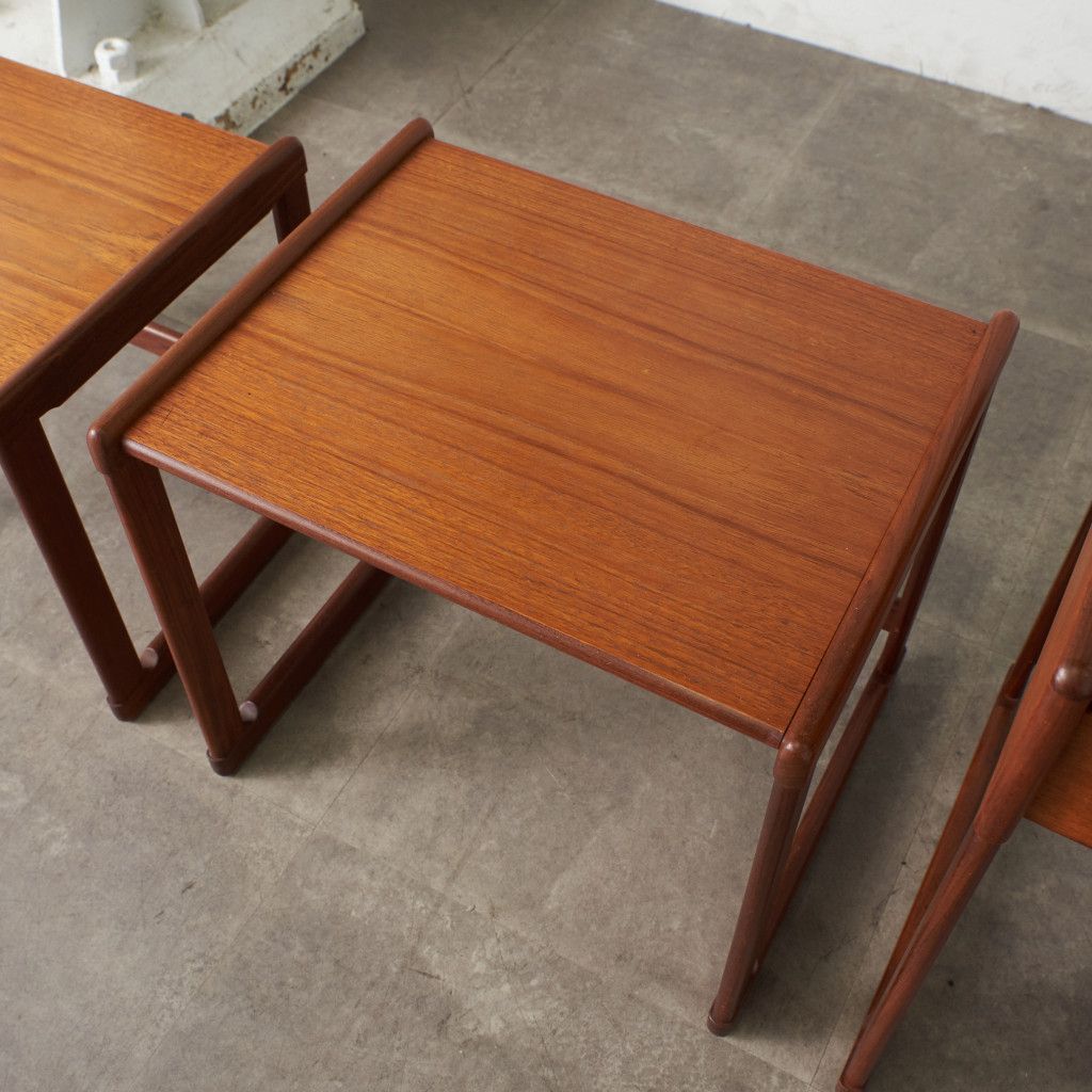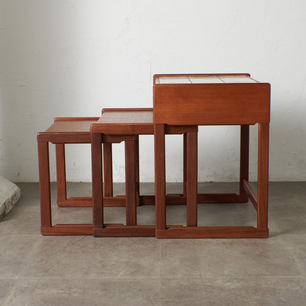 用途に合わせて引き出したり、纏めたりできるとても便利な入子構造のネストテーブル。一番大きなテーブルにはタイルトップ天板と抽斗一つ備わっています。リビングセンターテーブルやサイドテーブル、寝室に置くナイトテーブルなど多目的に使える使い勝手の良いお品。G-PLANのラインナップの中でも流通量の少ない非常に珍しいモデルです。