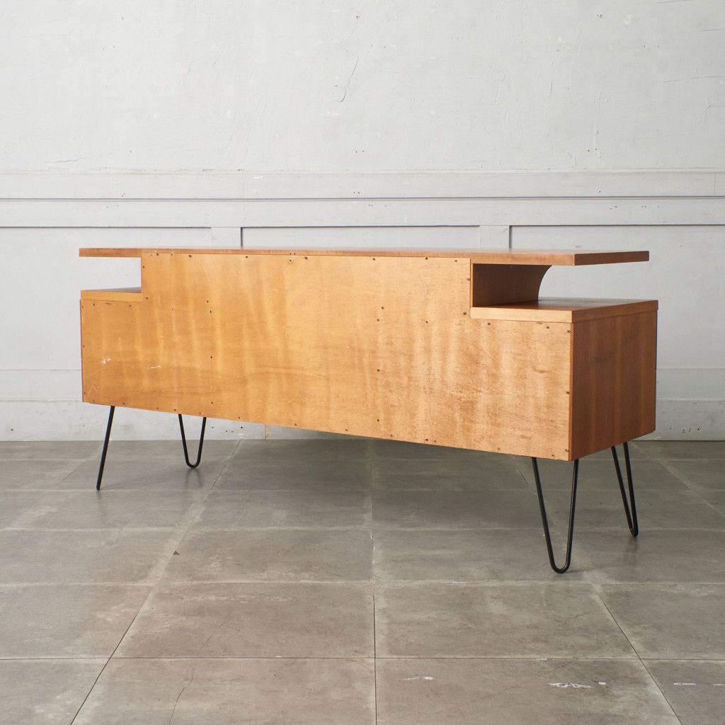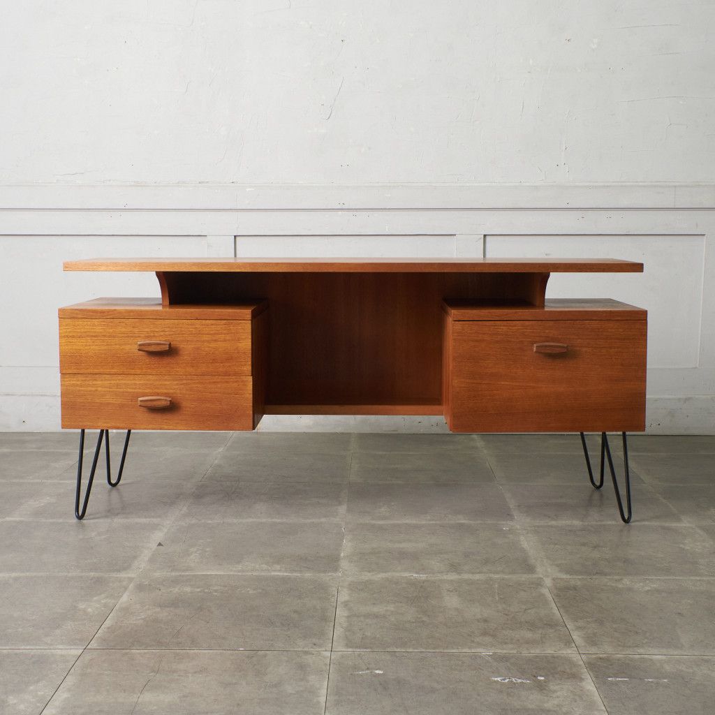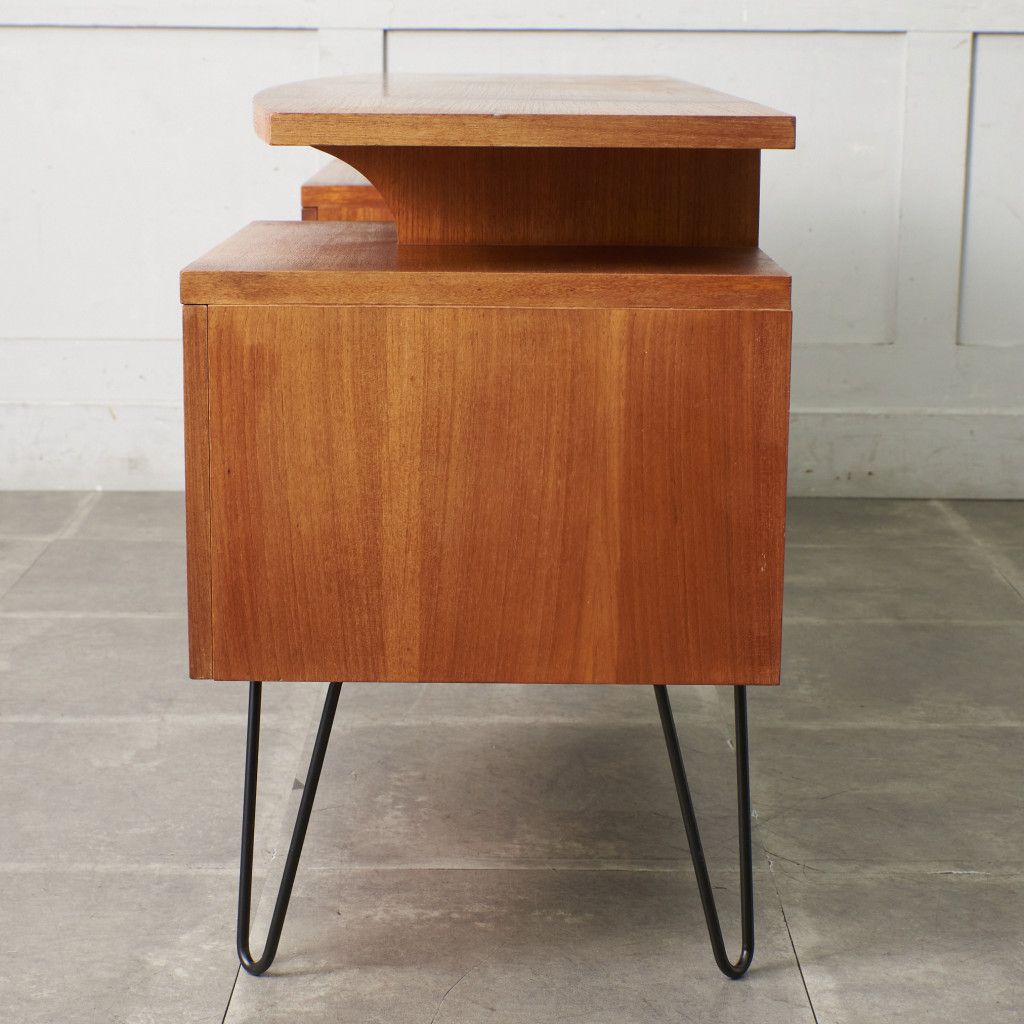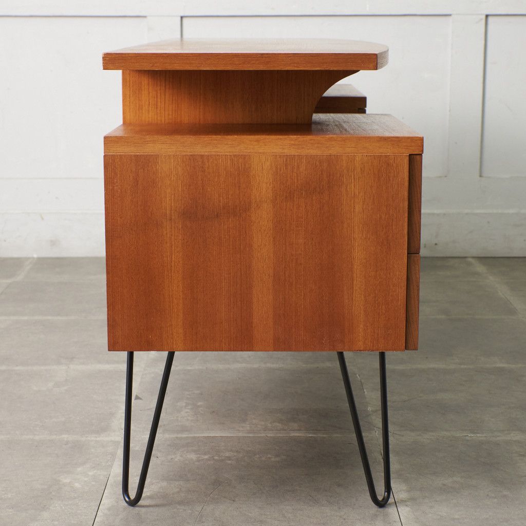 英国ミッドセンチュリーを代表するブランド G-PLAN(ジープラン)による、Roger Bennett(ロジャー・ベネット)デザイン、Quadrille(クヮドリール) デスク / カスタム アイアンヘアピンレッグです。