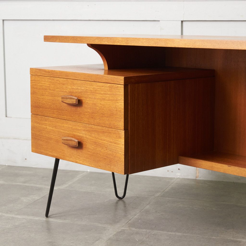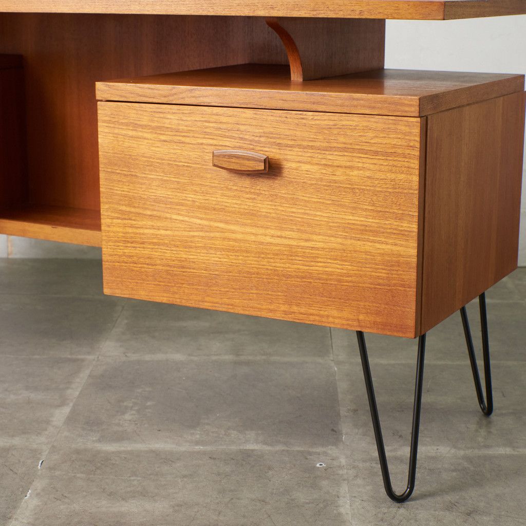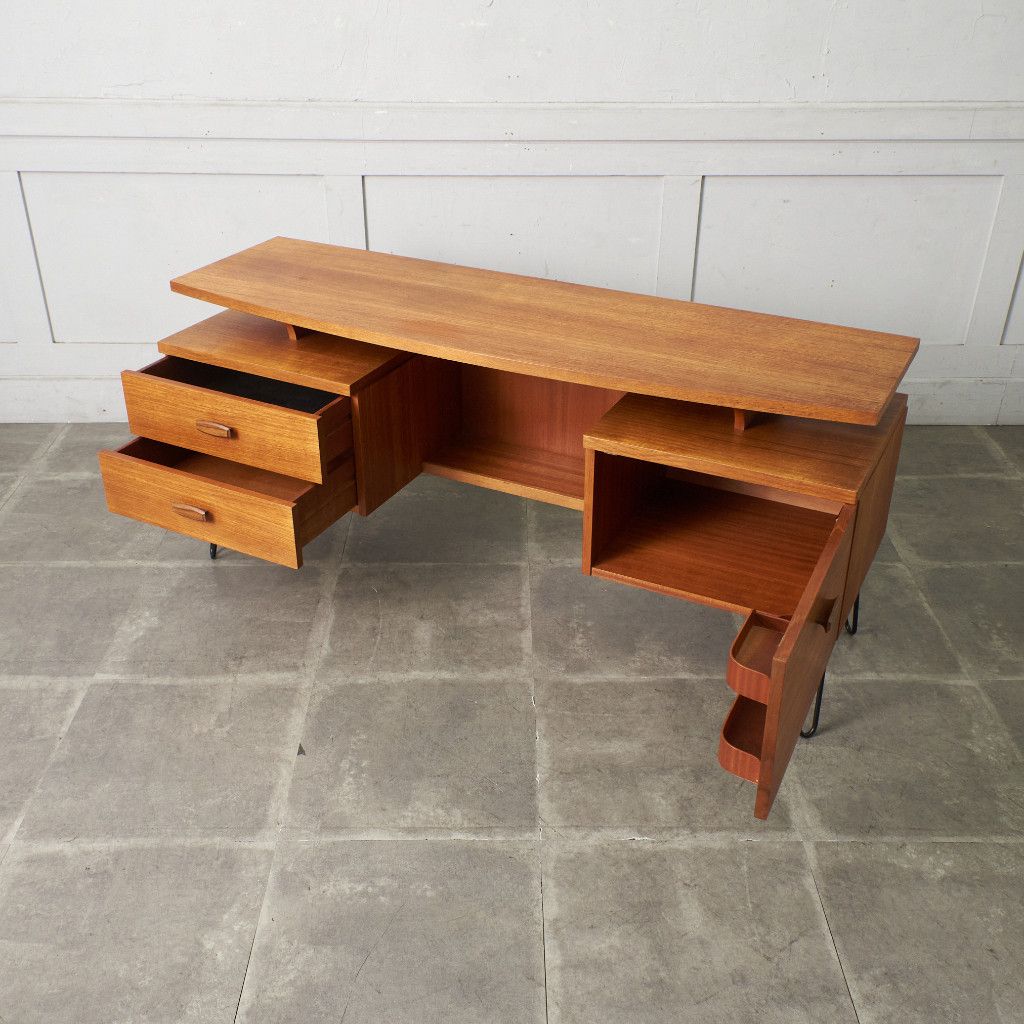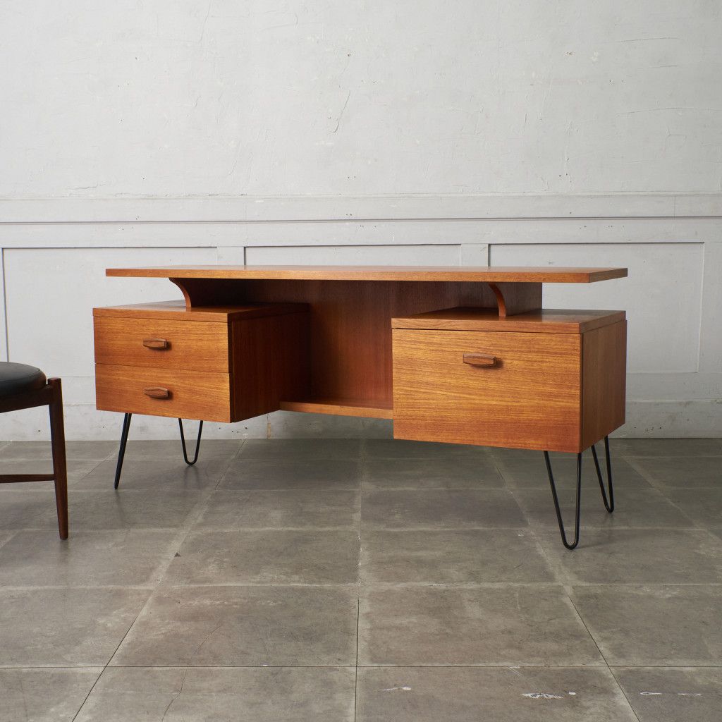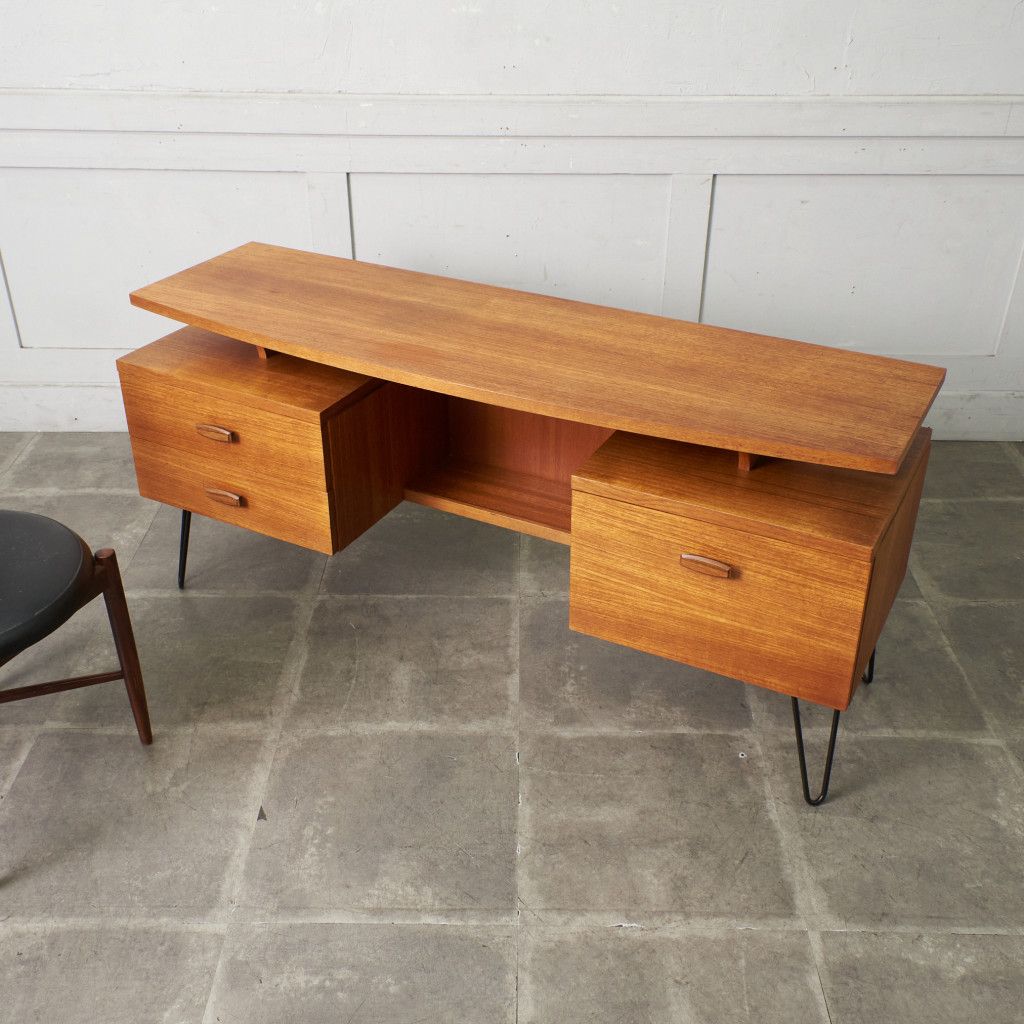 英国ミッドセンチュリーを代表するブランド G-PLAN(ジープラン)による、Roger Bennett(ロジャー・ベネット)デザイン、Quadrille(クヮドリール) デスク / カスタム アイアンヘアピンレッグです。