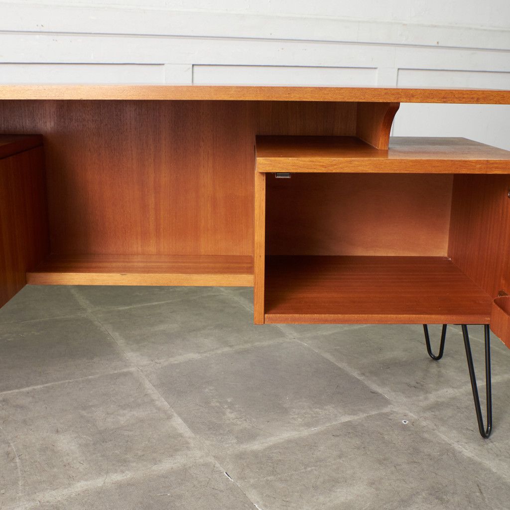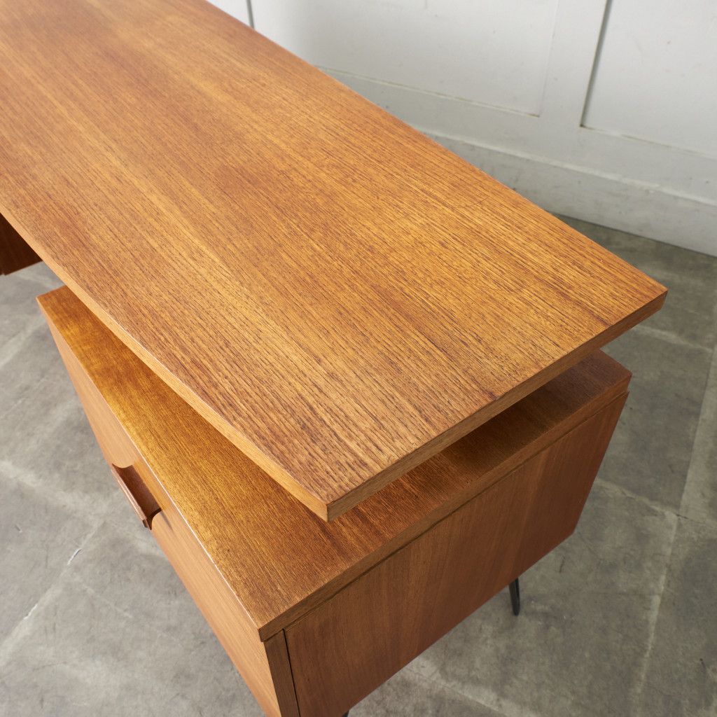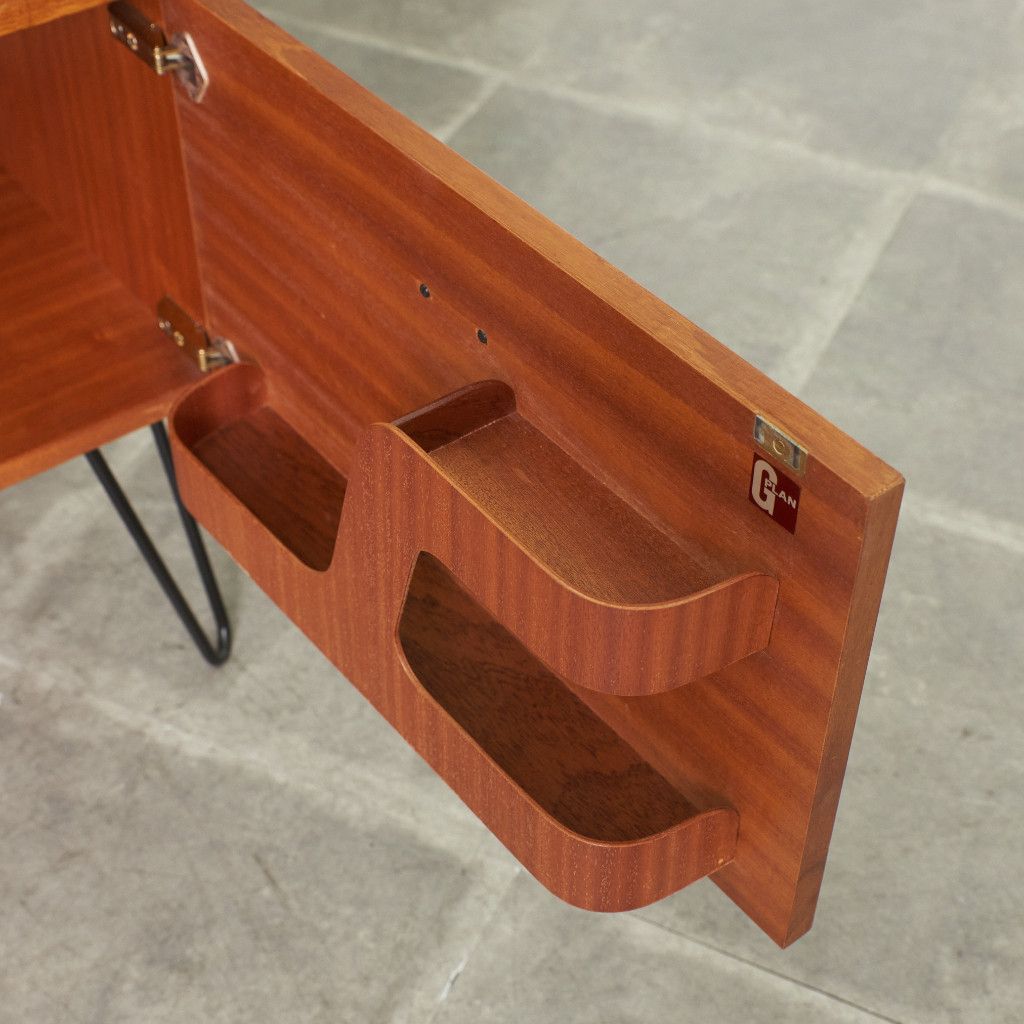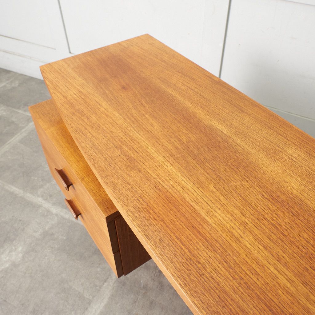 英国ミッドセンチュリーを代表するブランド G-PLAN(ジープラン)による、Roger Bennett(ロジャー・ベネット)デザイン、Quadrille(クヮドリール) デスク / カスタム アイアンヘアピンレッグです。