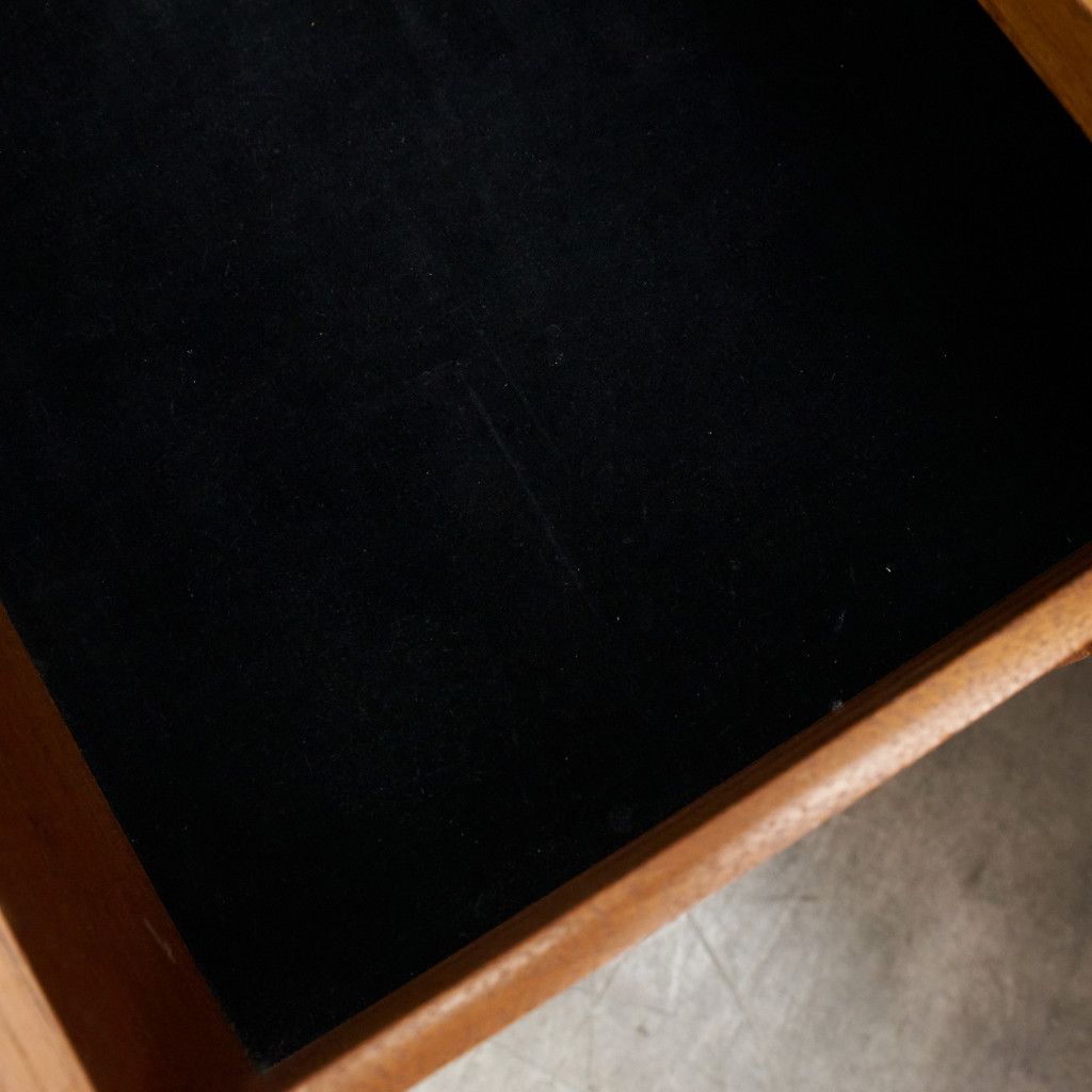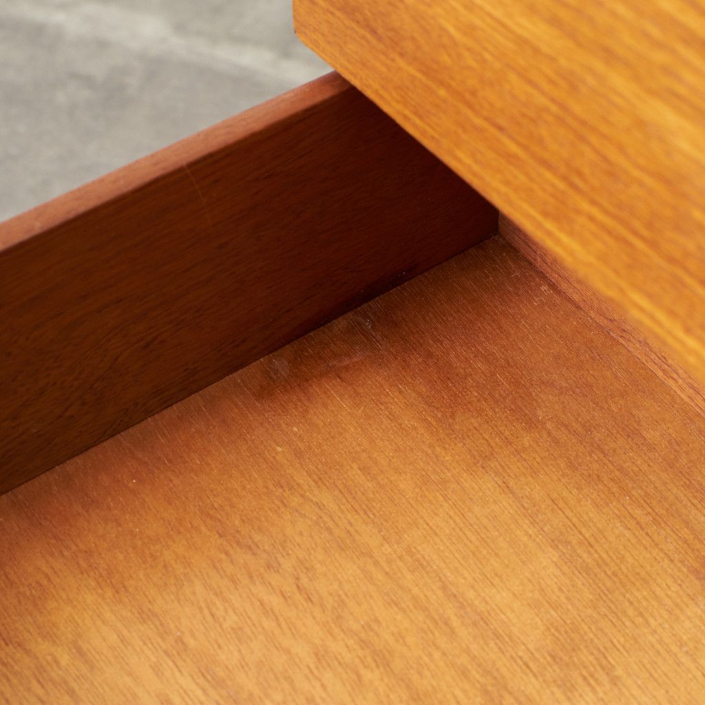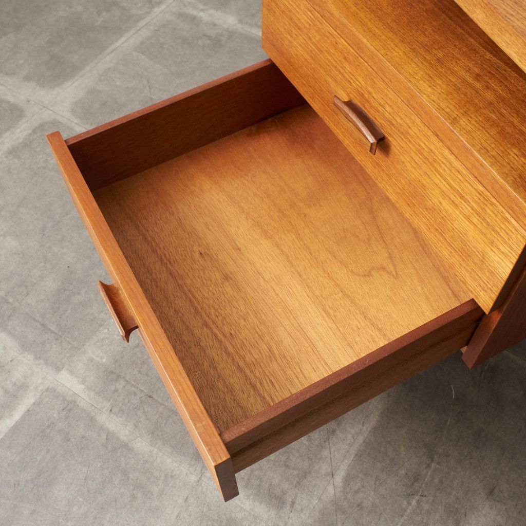 フランスのスクエア(四角)になって踊る古典舞踊、Quadrilleの名前を冠する1965年発表のG-PLAN Quadrilleシリーズ。Frescoシリーズと同じく60年代のデンマークデザインを源泉にもち、美しい褐色のチーク材を使用。四方を面取りされた樽型取手、内側に緩やかな弧を描き外形を四角に組まれた美しい形状の脚が特徴です。