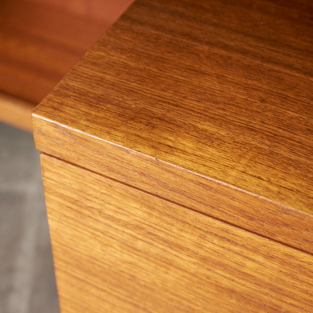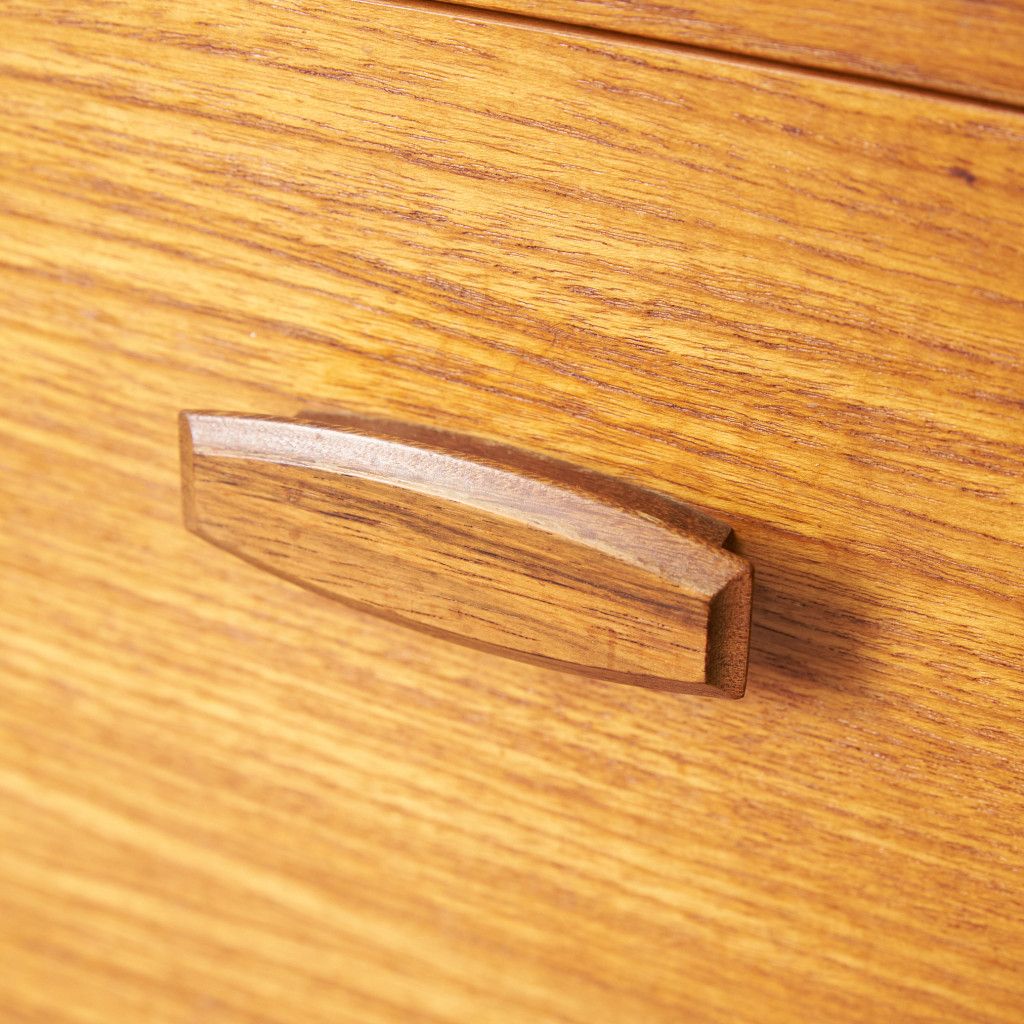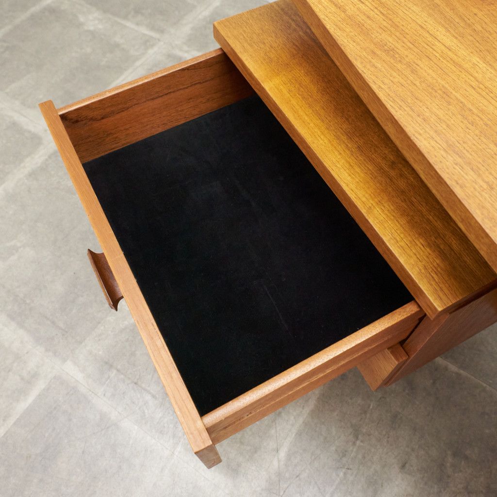 フランスのスクエア(四角)になって踊る古典舞踊、Quadrilleの名前を冠する1965年発表のG-PLAN Quadrilleシリーズ。Frescoシリーズと同じく60年代のデンマークデザインを源泉にもち、美しい褐色のチーク材を使用。四方を面取りされた樽型取手、内側に緩やかな弧を描き外形を四角に組まれた美しい形状の脚が特徴です。