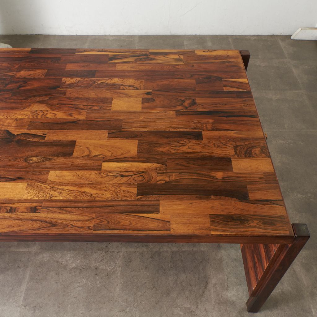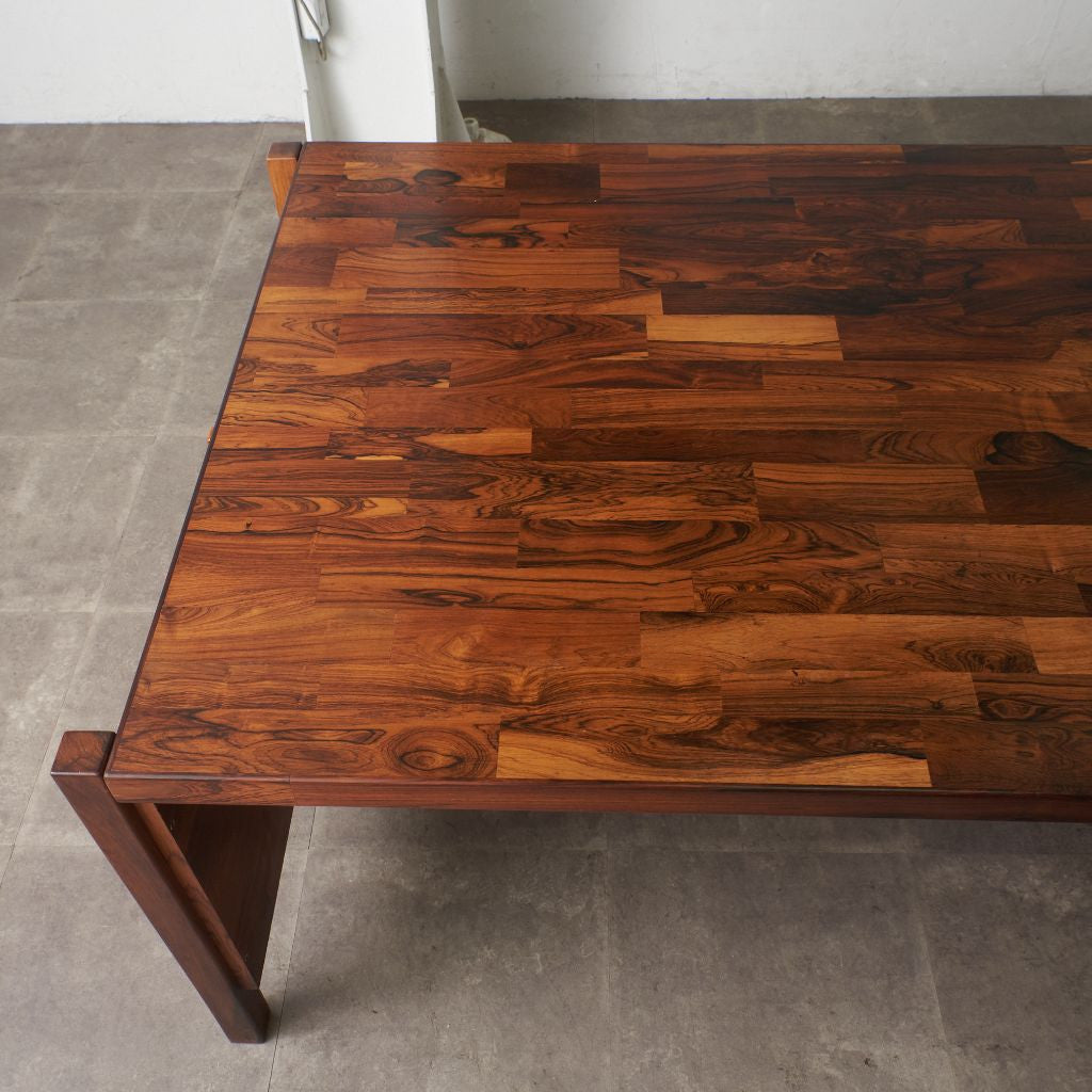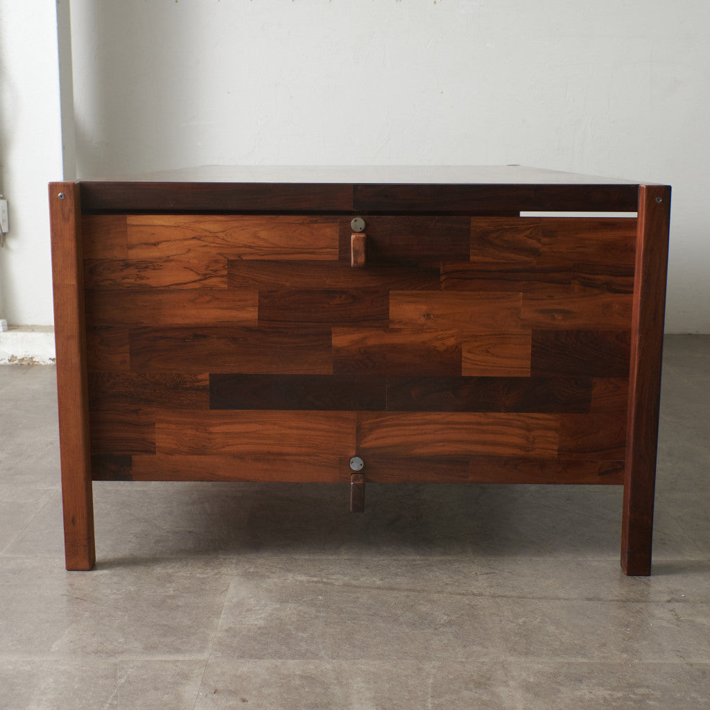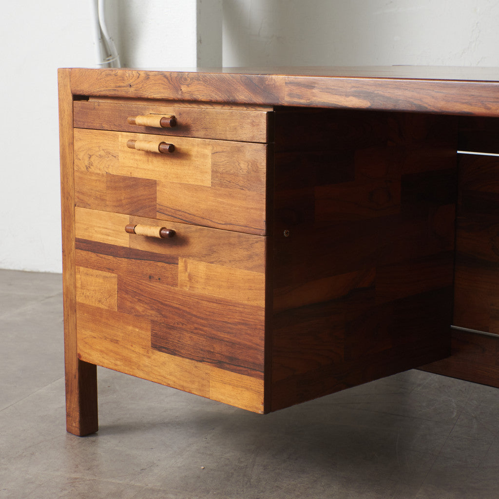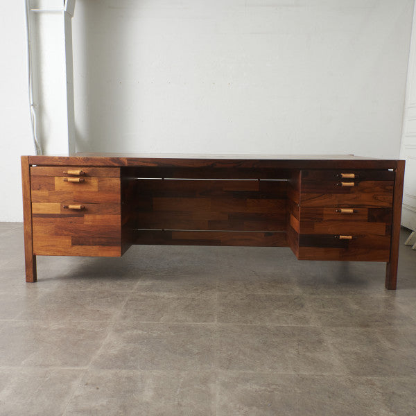 ブラジリアンローズウッド材を使用した、個性のある木肌が目を引く一品。実用的でありながらも作り手のこだわりを感じさせる上質なヴィンテージファニチャー。直線を基調とした洗練されたデザインゆえに素材の質感が際立ち、インテリアスタイルを選ばず様々なシーンに合わせて頂けます。壁付けではなく、空間の中央に全方向から見えるように配して頂きたい完成度の高いデスクです。