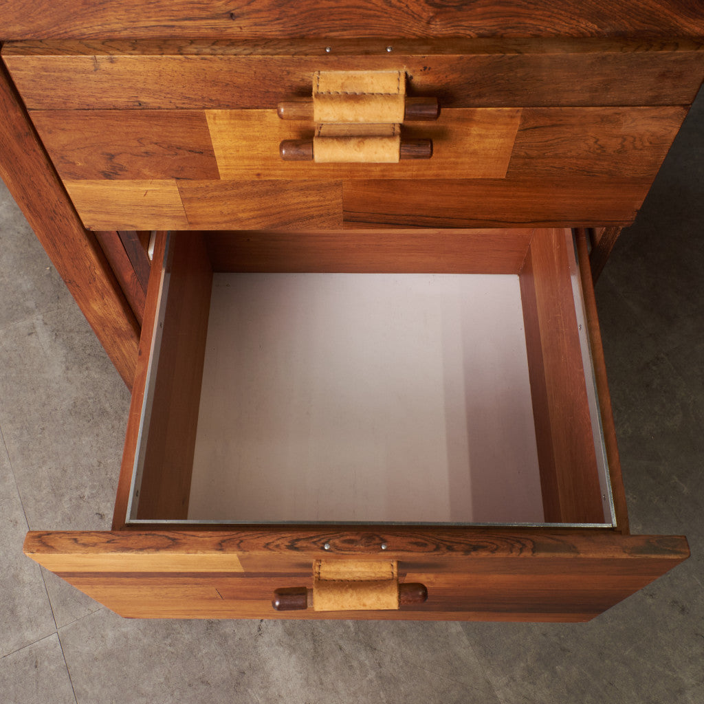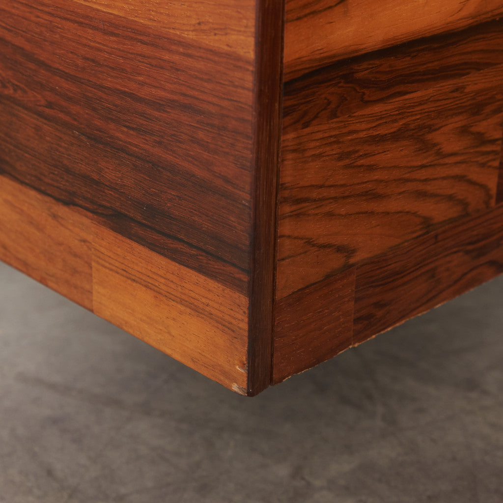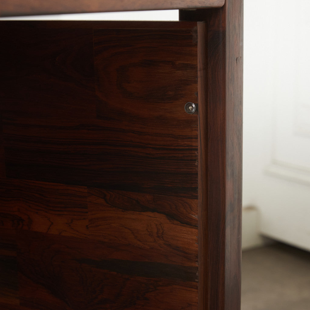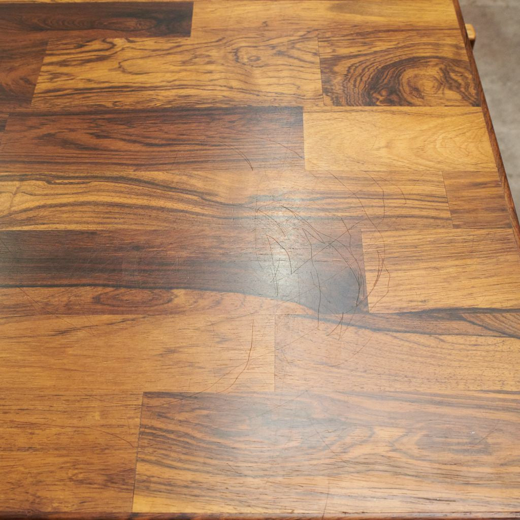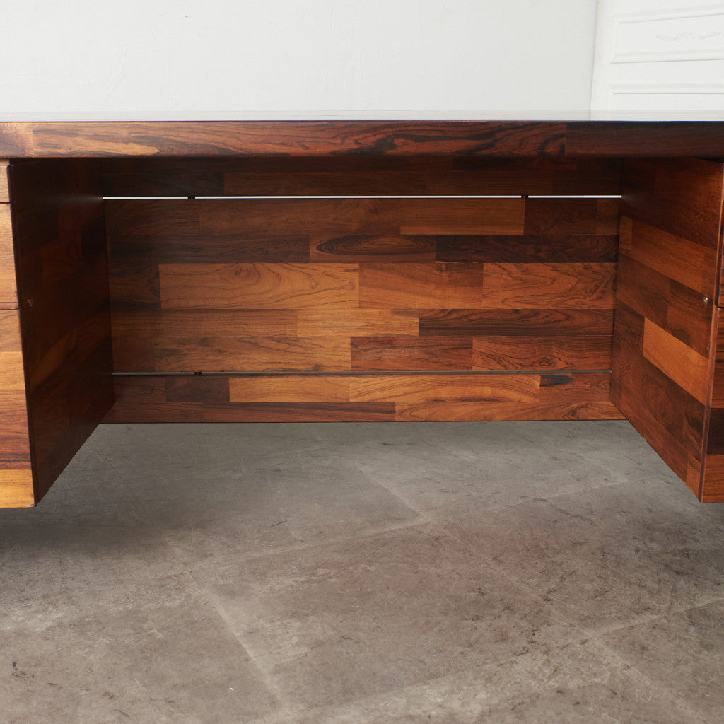 ブラジリアンローズウッド材を使用した、個性のある木肌が目を引く一品。実用的でありながらも作り手のこだわりを感じさせる上質なヴィンテージファニチャー。直線を基調とした洗練されたデザインゆえに素材の質感が際立ち、インテリアスタイルを選ばず様々なシーンに合わせて頂けます。壁付けではなく、空間の中央に全方向から見えるように配して頂きたい完成度の高いデスクです。