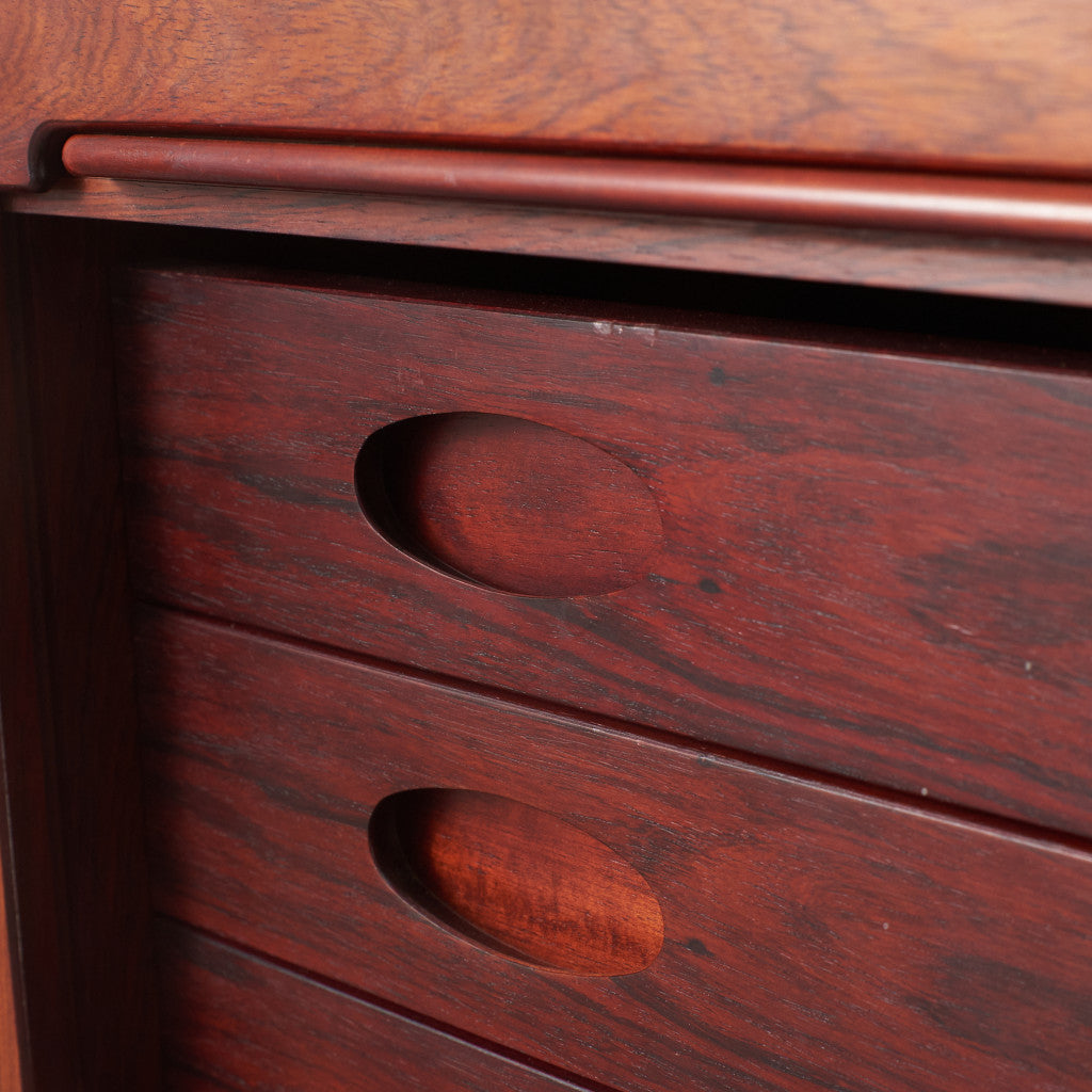 上下にスライドするロールフロント扉(蛇腹扉)という大変珍しい構造を採用しており、熟練の家具職人による精度の高い技術によって扉はスムーズに上下します。また、ベルニーニならではの繊細なディテールを備えた脚周りの意匠や、銘木を惜しみなく使用した天板と扉には、特に厳選された美しい木目が際立っています。