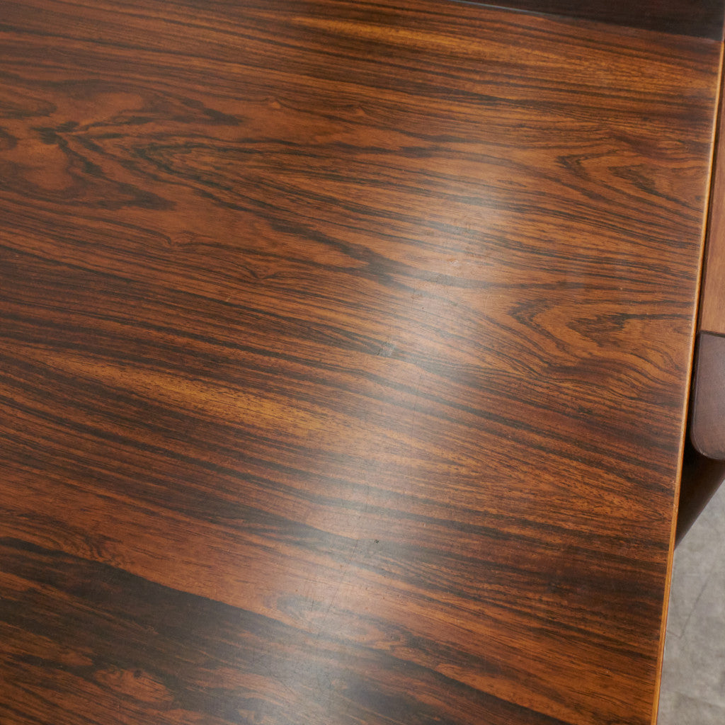 希少な高級家具材ブラジリアンローズウッドの燃え立つような色彩とつややかな木肌を備えた上質な拡張式テーブル。普段は4人用、来客時などは天板をさっと広げて6人用としてお使いいただけます。
