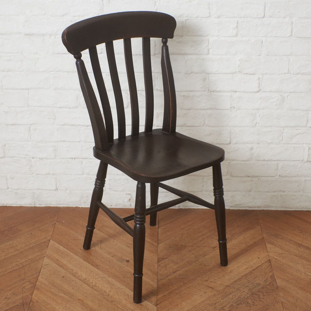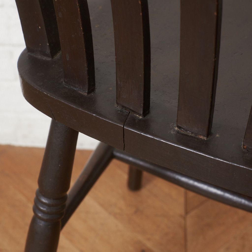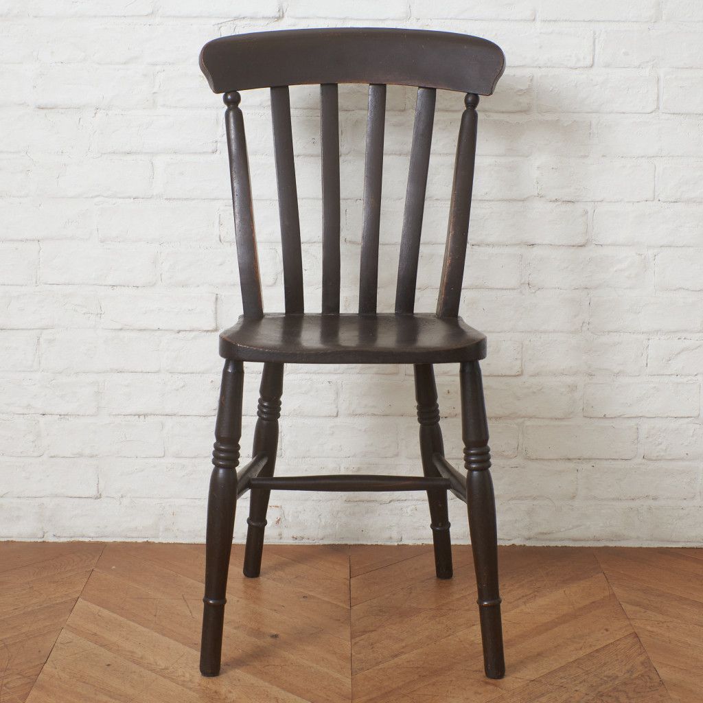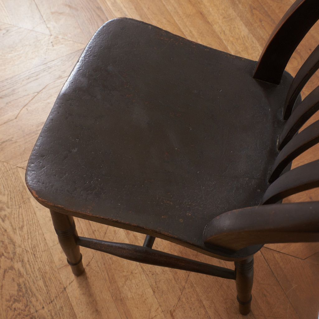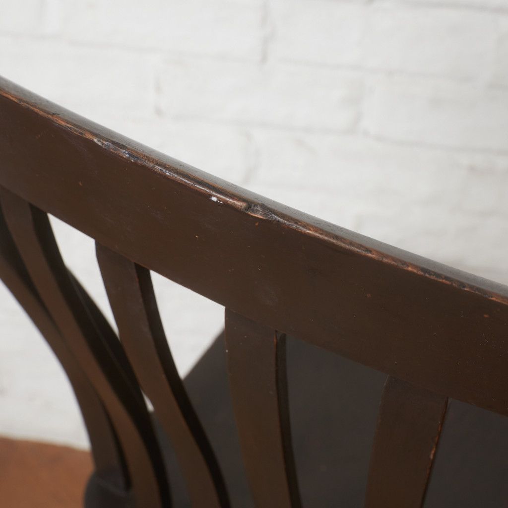 背もたれや脚の挽物装飾が印象的なチェア。使い込まれた木肌の質感や手仕事と経年変化による歪み、無垢材を用いたアンティーク家具ならではの存在感のあるお品です。グリーンとも相性がよく、ディスプレイとしてもお楽しみいただけます。
